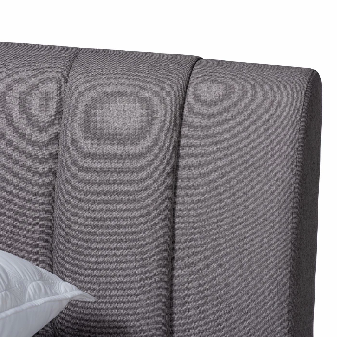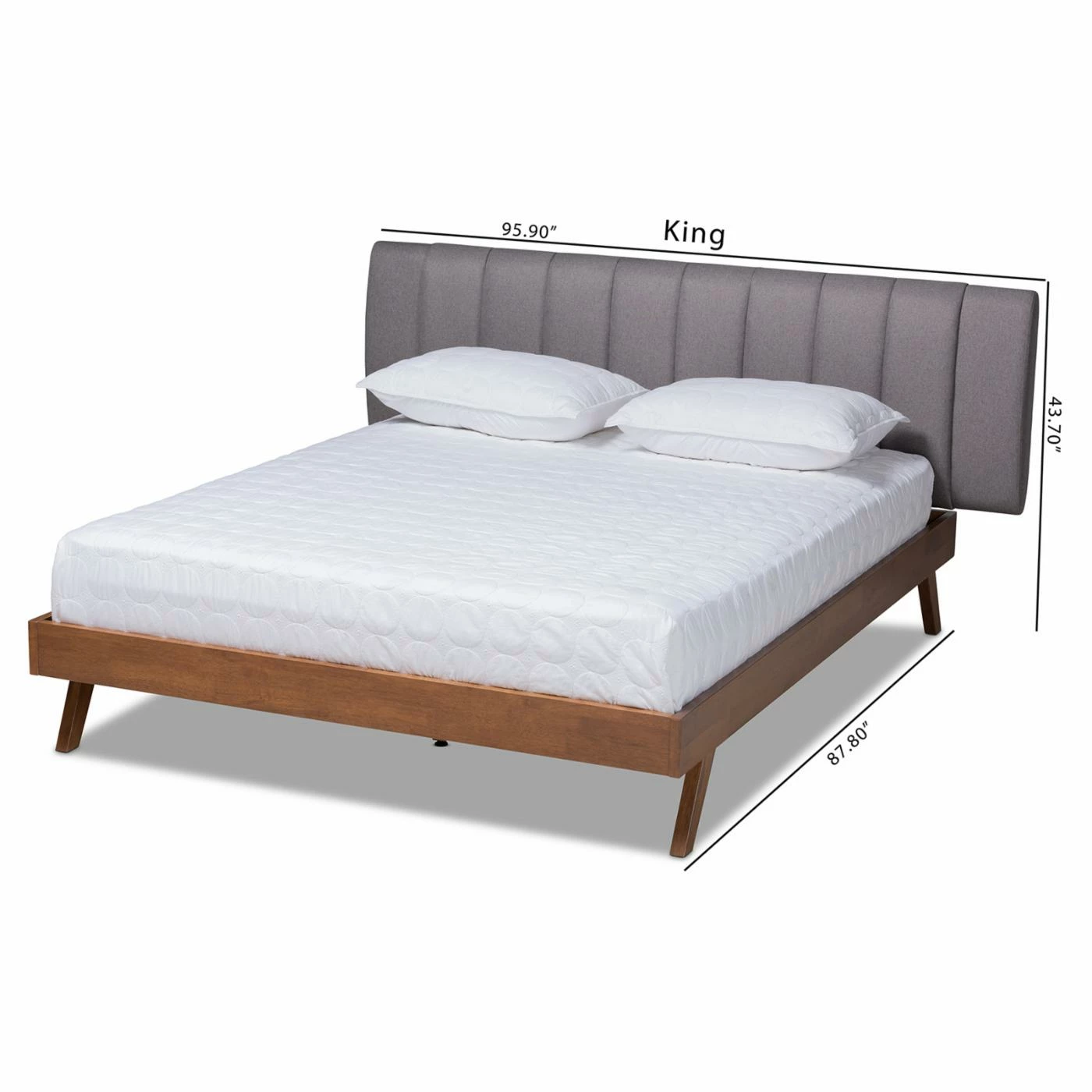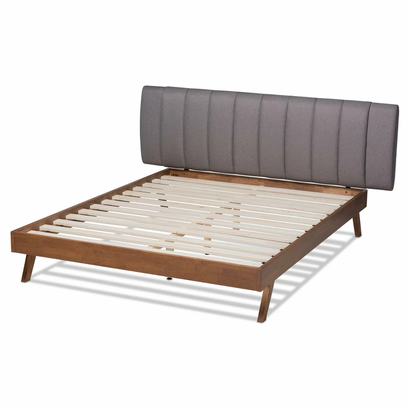 The Baxton Studio Brita Walnut Wood Bed with Upholstered Headboard is an elevated, sophisticated way to give your bedroom an upgrade. The engineered wood and rubberwood frame of this bed are covered in a vintage inspired walnut finish. The slanted legs and horizontal headboard make this feel like it came straight from a retro catalog. The upholstered headboard features neutral upholstery and vertical seams for a unique look. No box spring is required. Some assembly necessary.