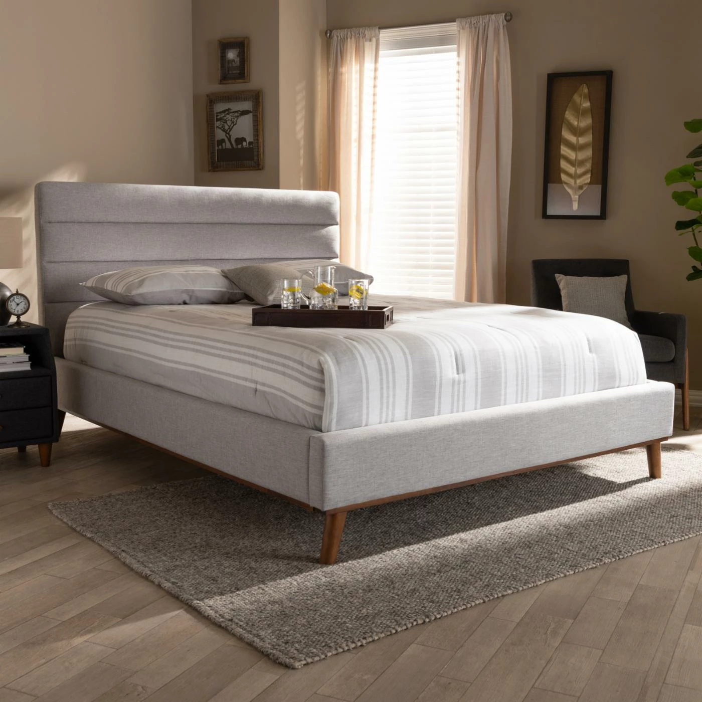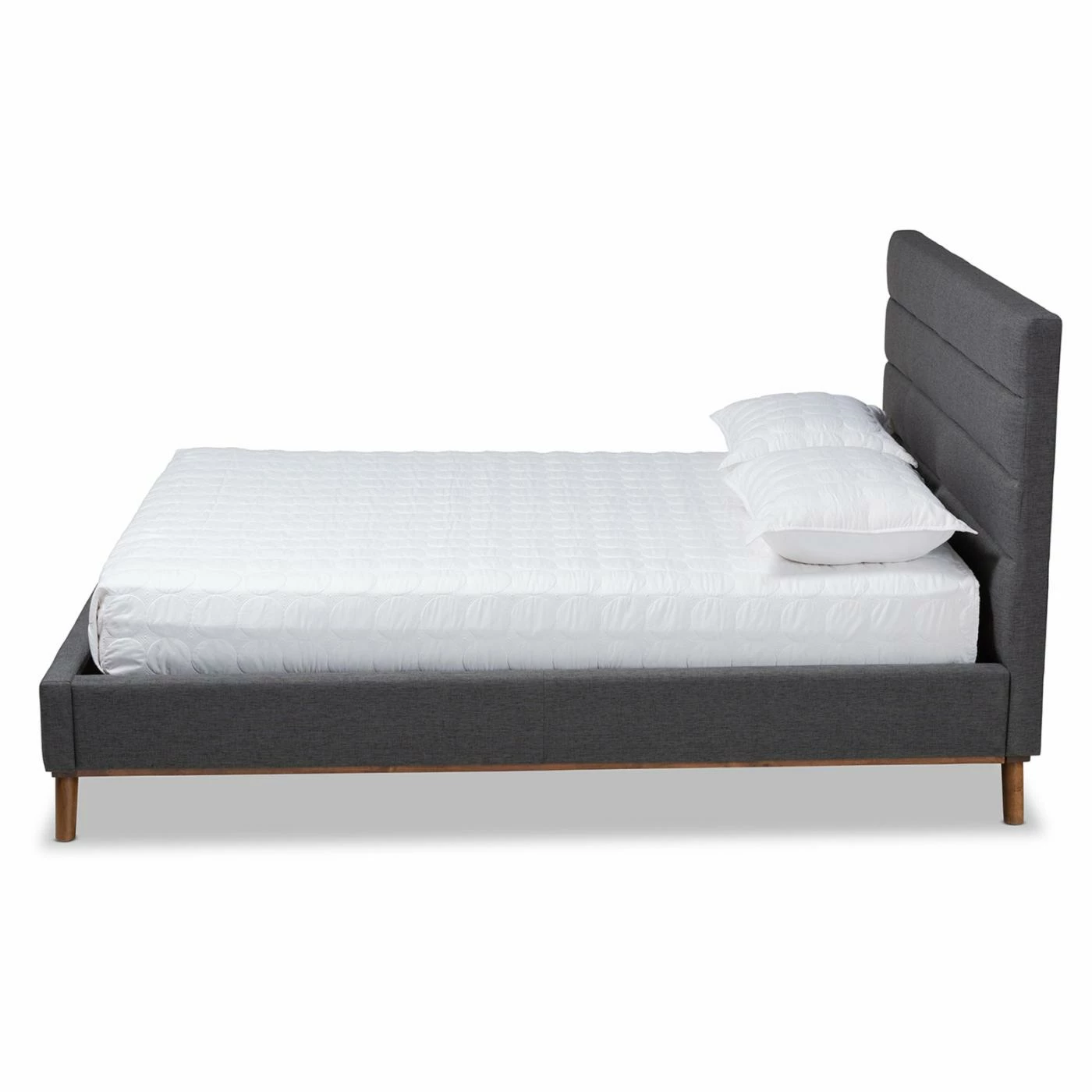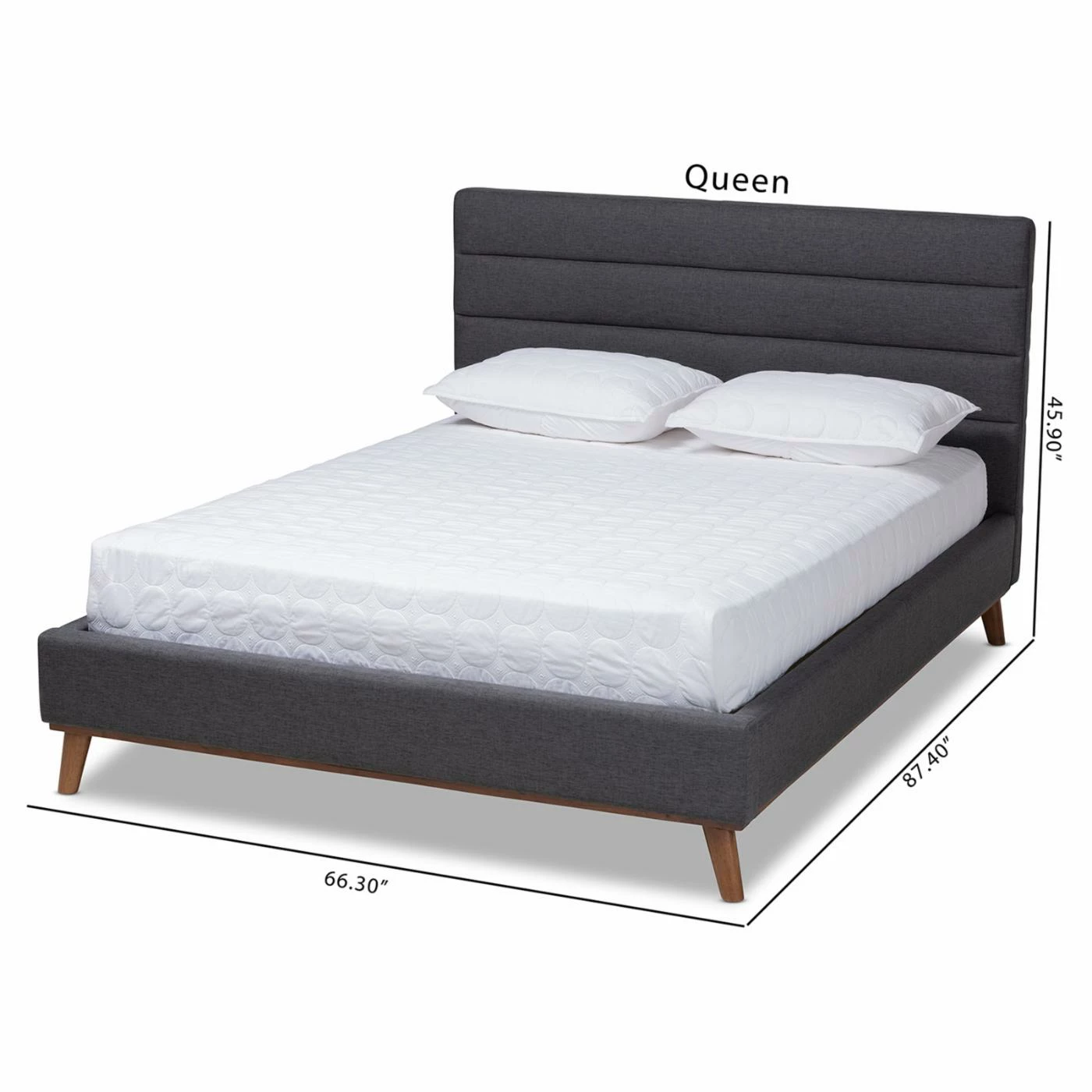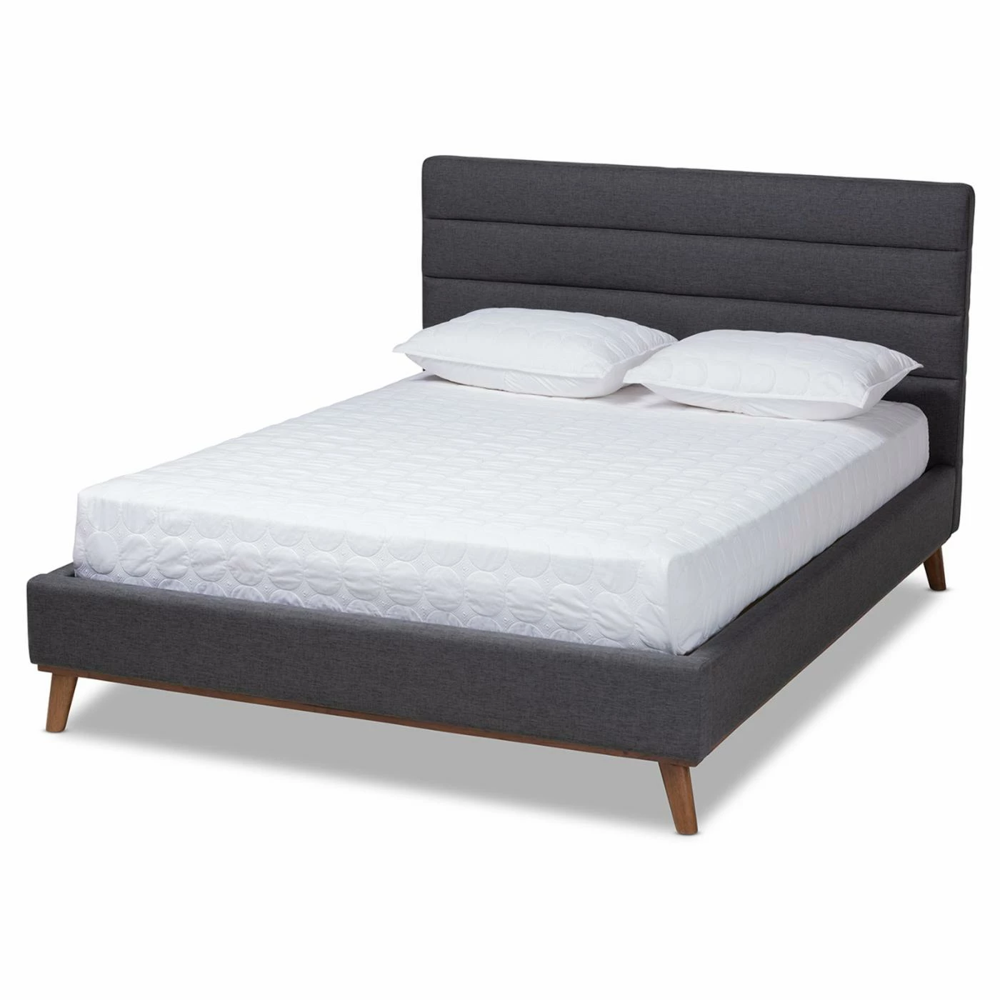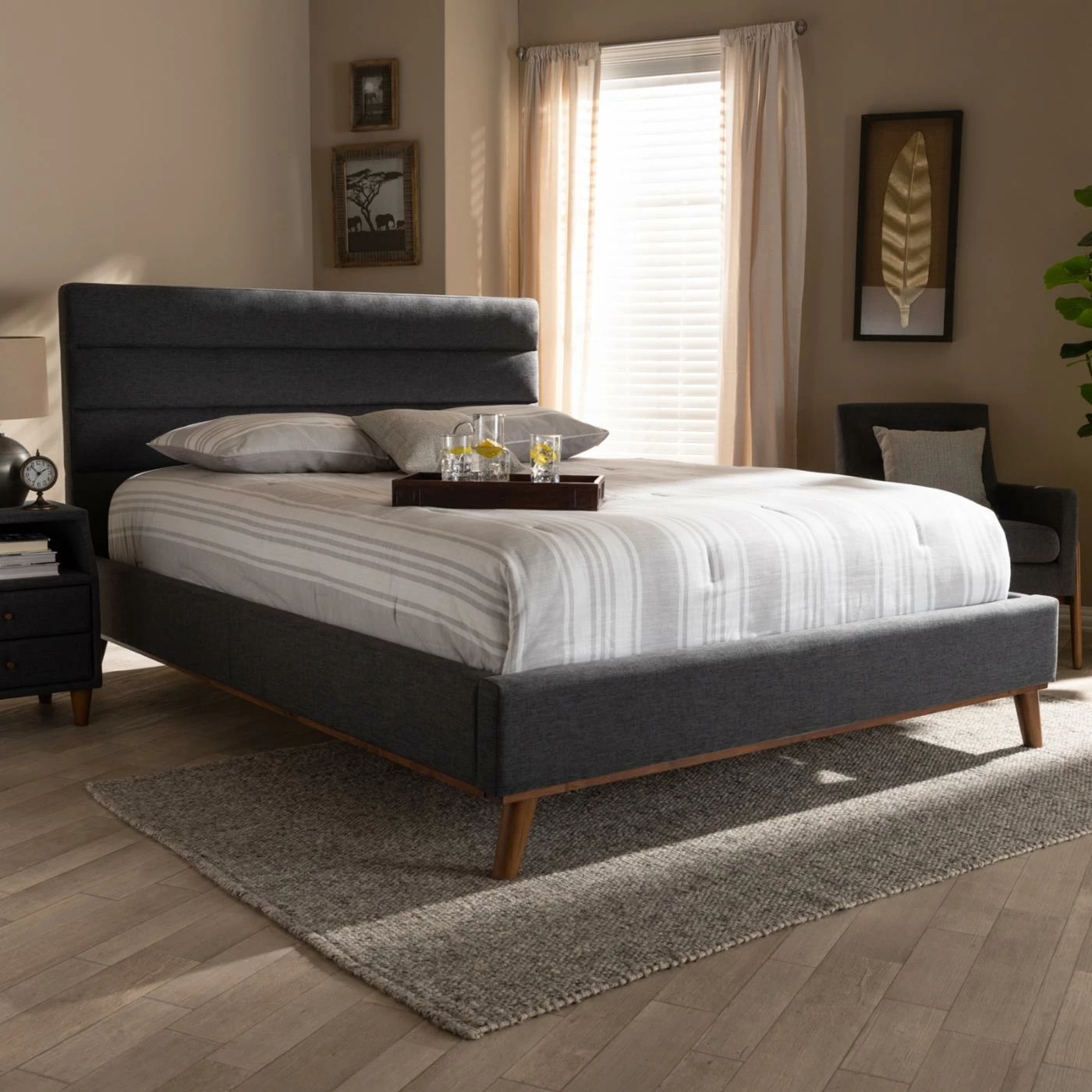 Customize the Baxton Studio Erlend Upholstered Platform Bed with your choice of available upholstery colors. This platform bed is durably constructed of solid rubberwood and engineered wood. It’s supported by angled, tapered legs and equipped with a wood slat system. The rails and headboard are padded with foam and upholstered with easy-care polyester fabric. The headboard is accented with horizontal channel tufts.
