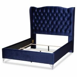 For an expensive look at a fraction of the cost, try the Baxton Studio Hanne Velvet Upholstered Wingback Bed. This mid-century modern inspired bed comes completely wrapped in rich navy blue velvet polyester upholstery. The metal scrolled legs add a pop of unique luxury to the piece in a metallic silver. Upscale diamond button tufting on the headboard makes this bed fit for royalty. A subtle wingback detail will help you to feel like you’re in a piece that was custom-designed, just for you. A nailhead trim on either side of the headboard seals the deal. Box spring not included. Some assembly required.