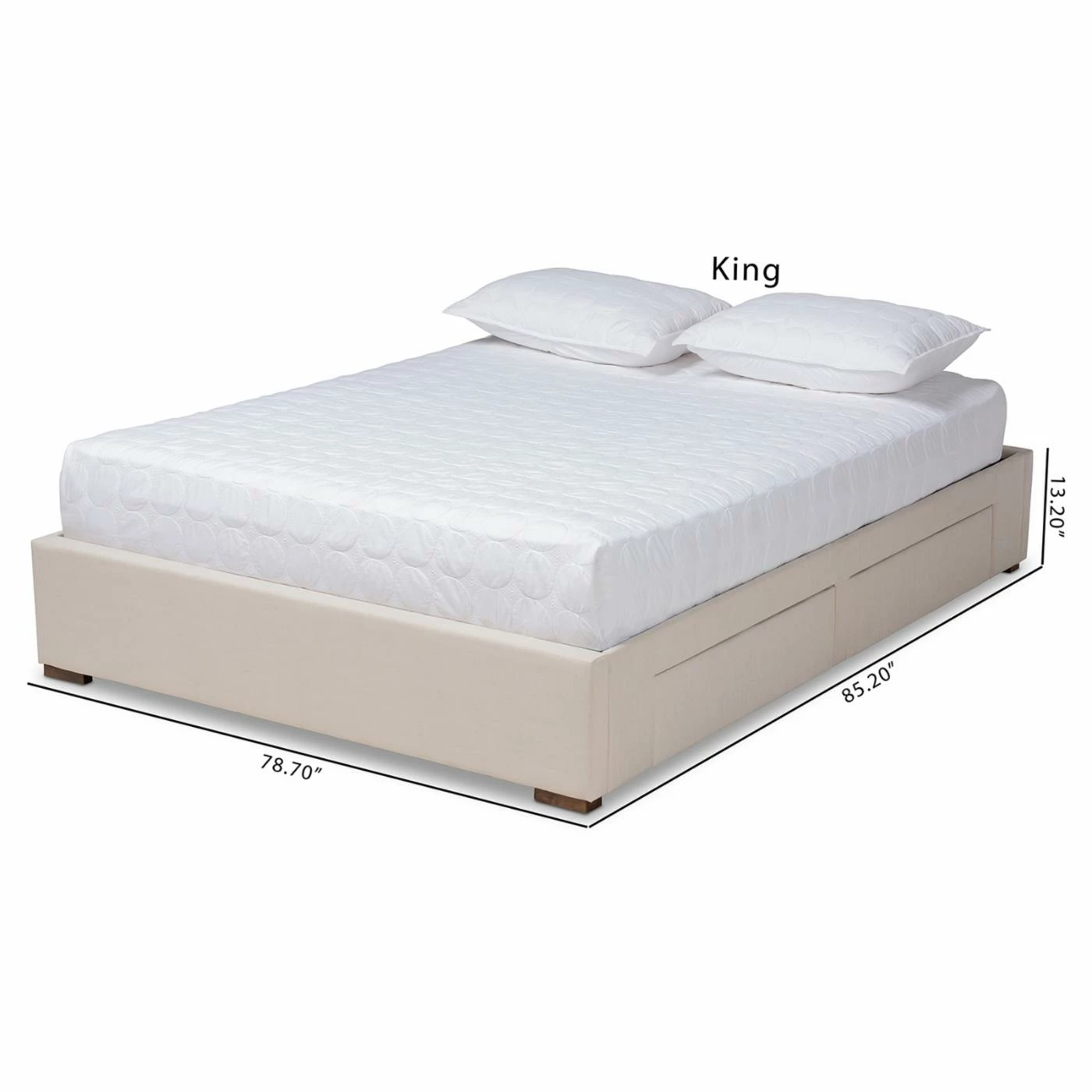 The Baxton Studio Leni Upholstered 4 Drawer Platform Bed Frame with Storage is a dual-purpose item that adds a stylish look to your bedroom. The linen polyester wrapped around this bed frame brings a some visual interest to the piece without drawing attention away from your carefully curated bedclothes. Choose from available fabric colors to best match your style. Short wooden block feet support this bed frame and balance out the lack of a headboard, which streamlines this bed frame. Four sliding drawers inside this frame give you space for clothes, mementos, and anything else you might want to stow away. No box spring is required for this piece – simply place your mattress right on top of the included slats. Some assembly required.