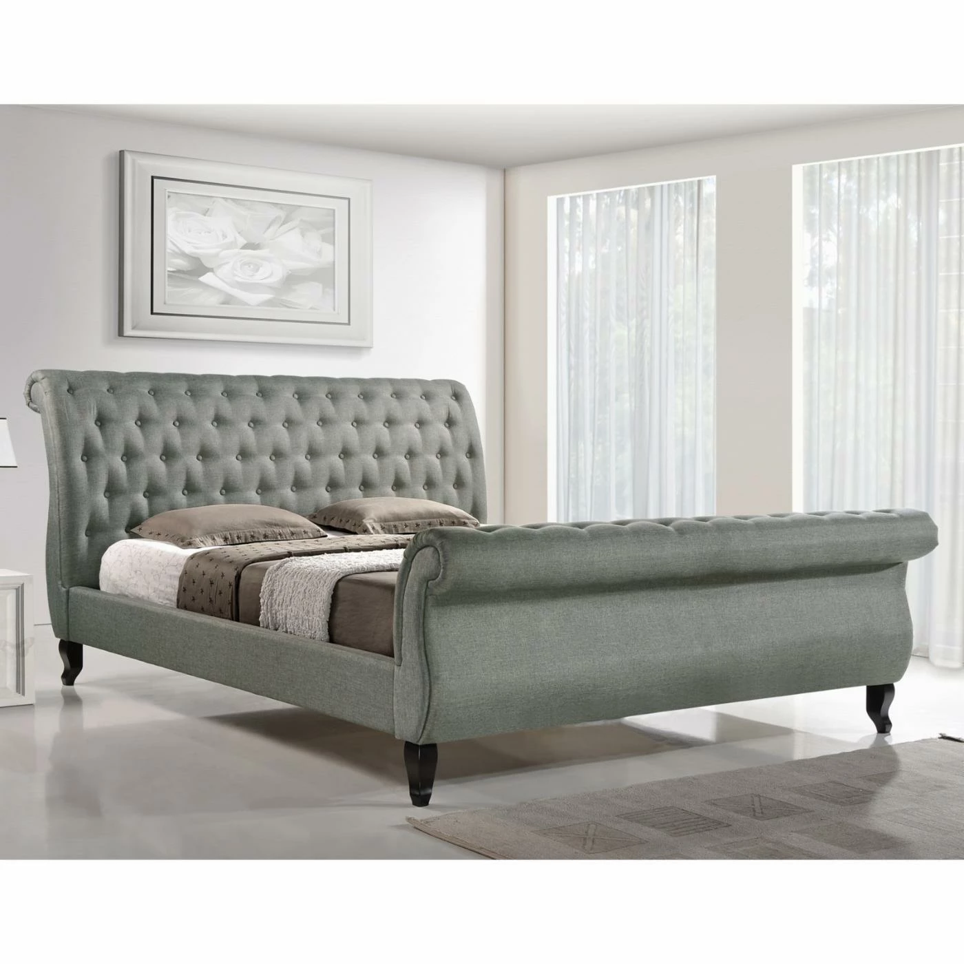 The Marietta Button-Tufted Upholstered Sleigh Platform Bed is a neatly tailored transitional bed with scrolling head and footboards featuring hand tufting with matching buttons. The polyester/cotton blend upholstery is available in your choice of gray or light beige for a lighter, more contemporary look. Crafted from hardwood and durable plywood, this bed features strong slat supports that eliminate the need for a box spring.