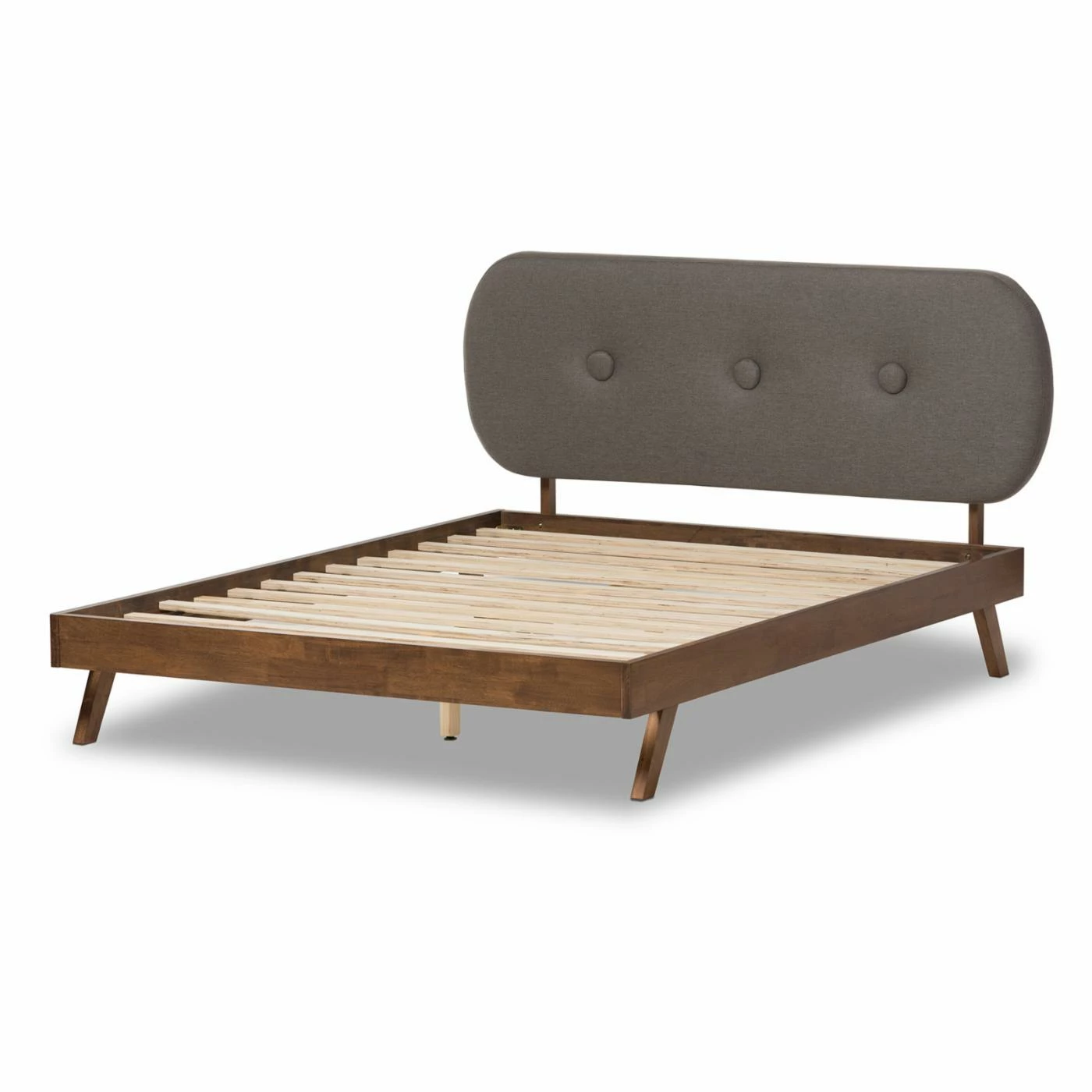 Make your bedroom feel like new with the Baxton Studio Penelope Mid-Century Modern Solid Walnut Fabric Upholstered Platform Bed. This low platform bed is designed with a classic mid-century look. A wide oval headboard caps the bed, featuring an adjustable height design. The headboard is padded and upholstered in a fine fabric with large tufted buttons. Durable rubberwood solids are used to construct the frame, featuring a slat-platform that eliminates the need for a box spring. The wood base is finished in a handsome walnut brown. Choose from available fabric color options.