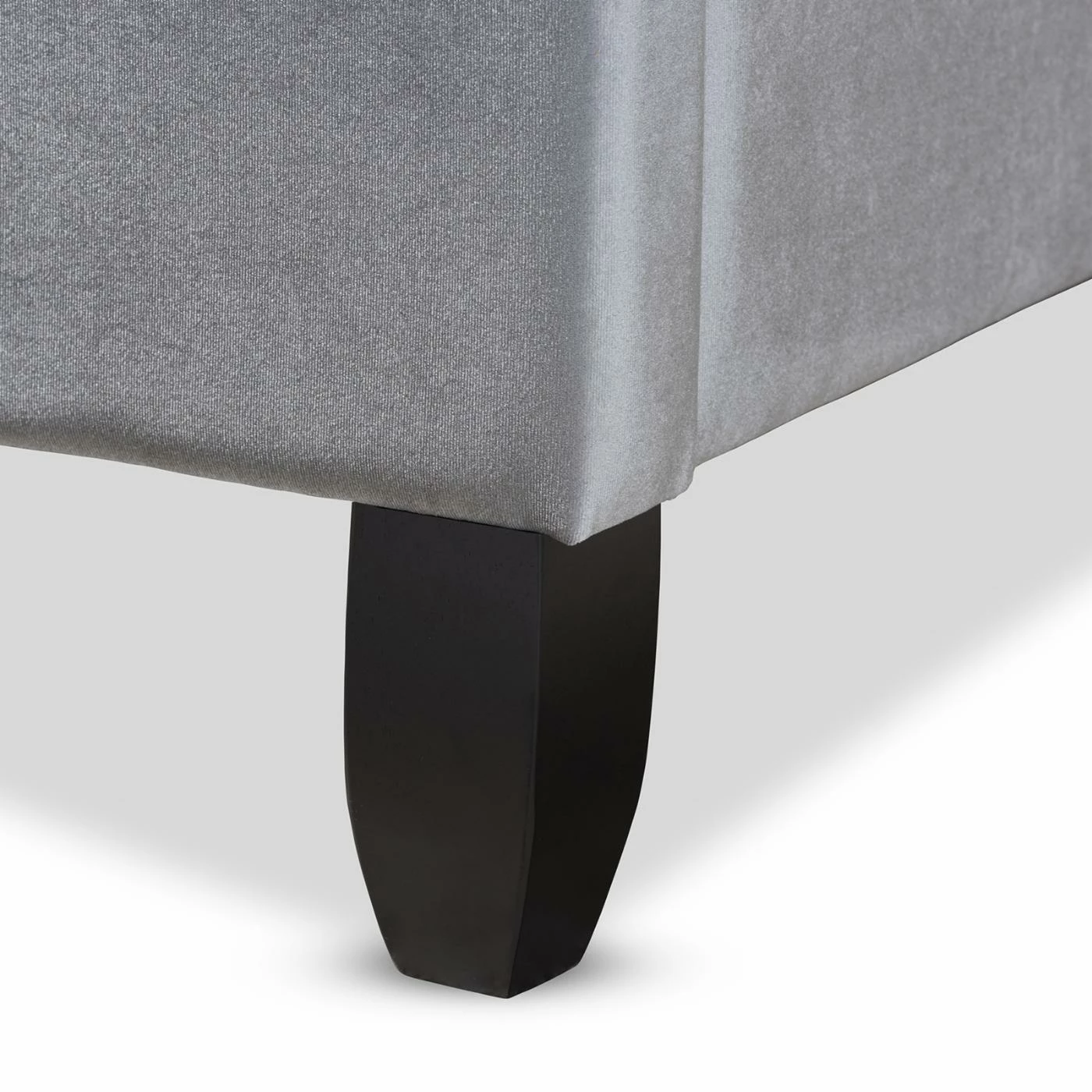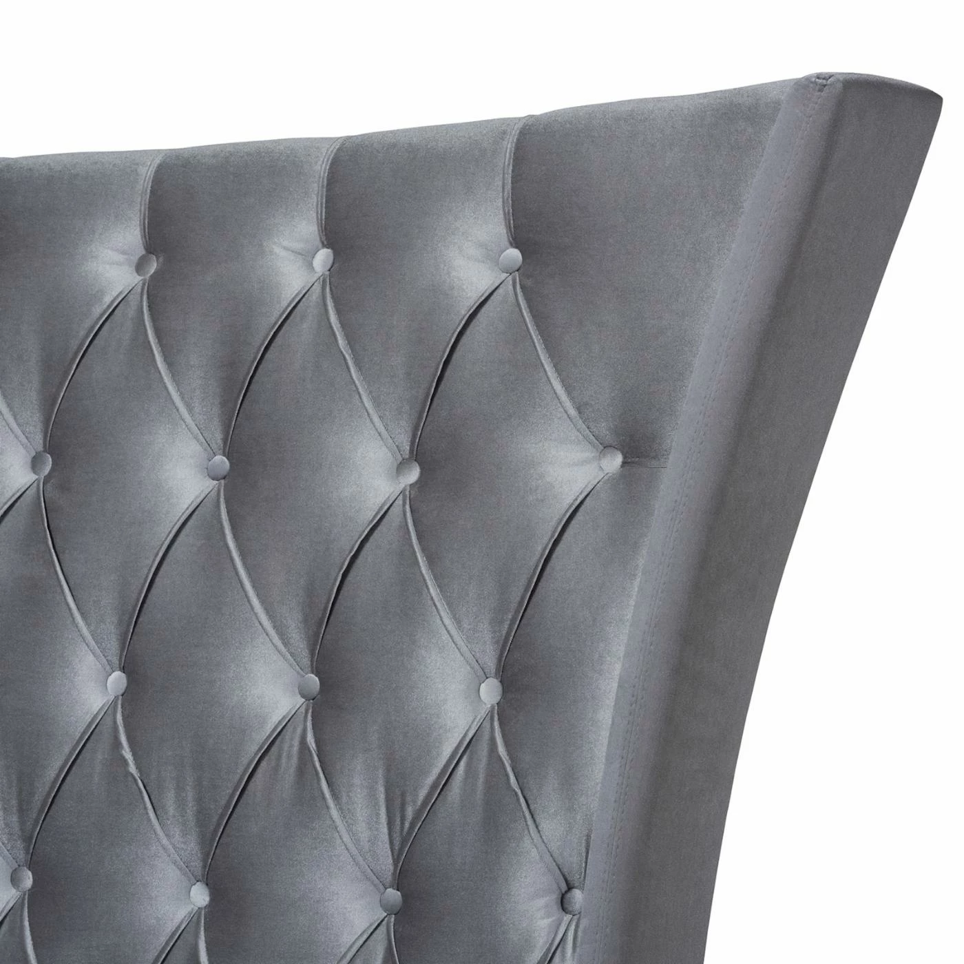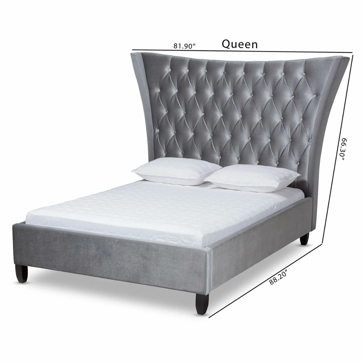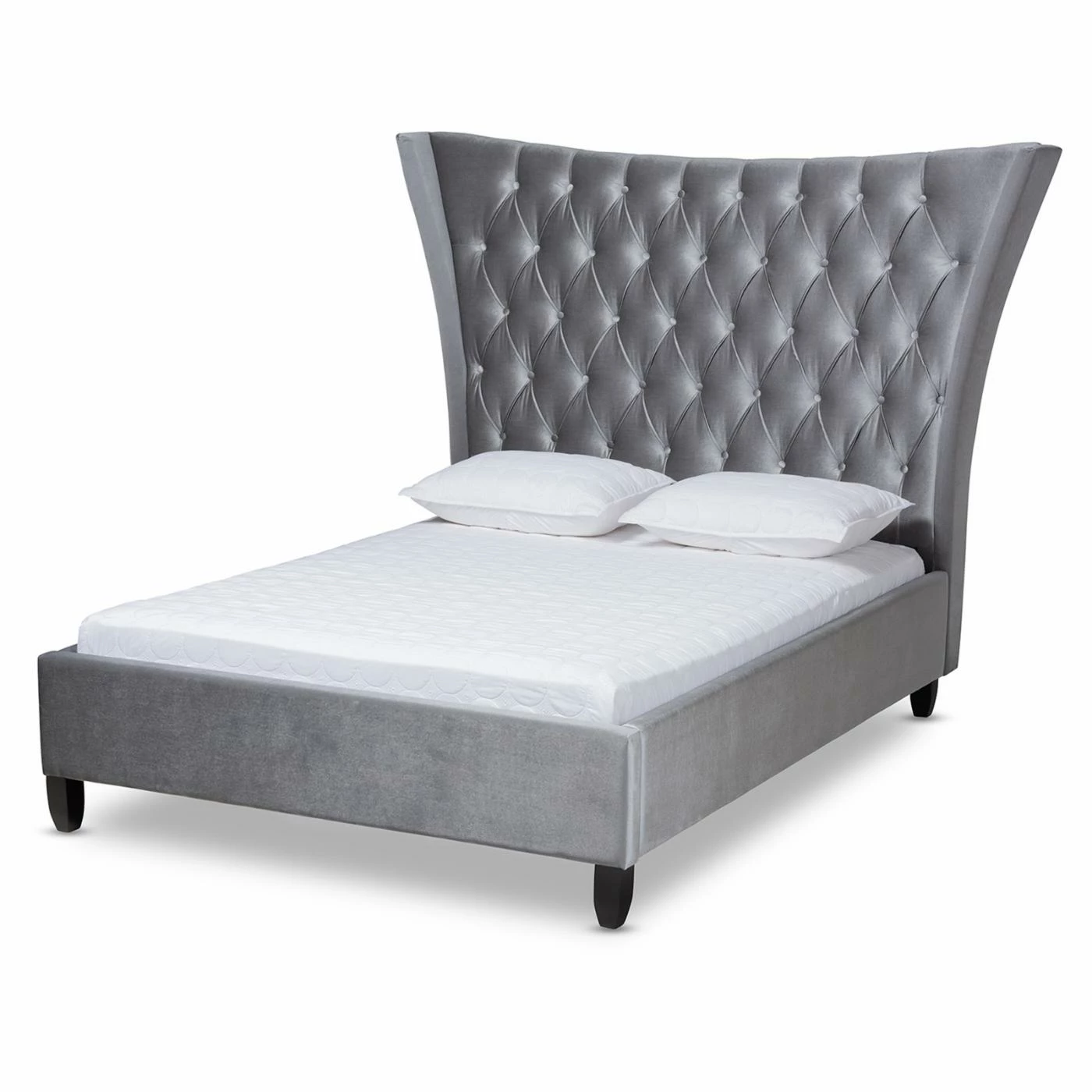 A tall, button-tufted headboard on the Baxton Studio Viola Velvet Upholstered and Tufted Platform Bed with Wingback Headboard gives it a look that’s dramatic and glamorous. This platform bed features a durable frame that’s padded with foam and covered with polyester-velvet upholstery in silver. It’s supported by simple, tapered block legs in a black finish.