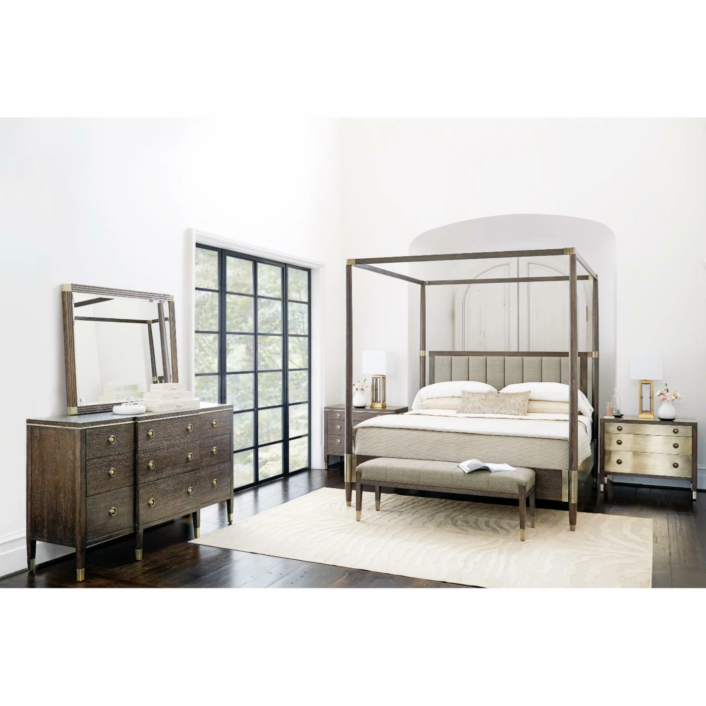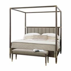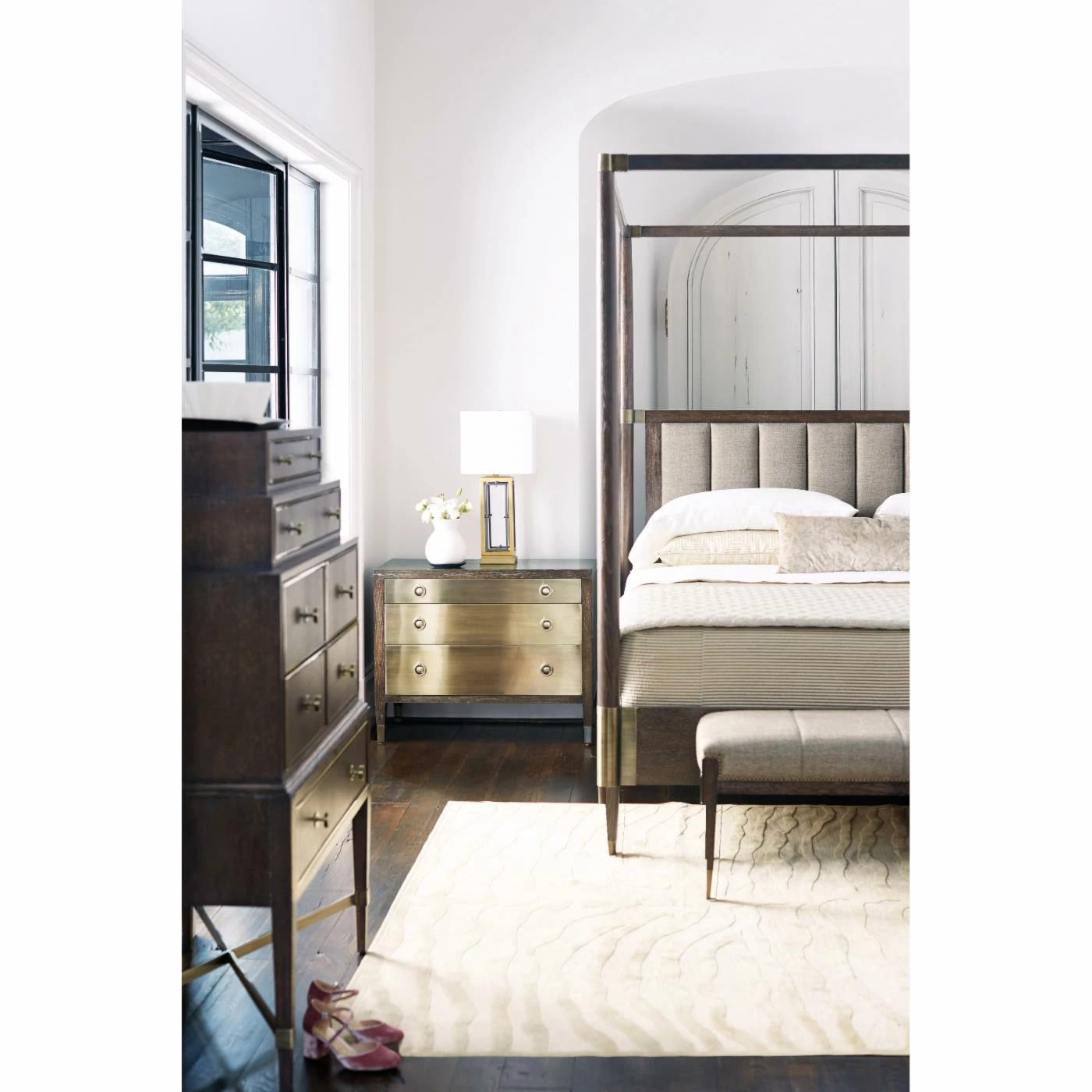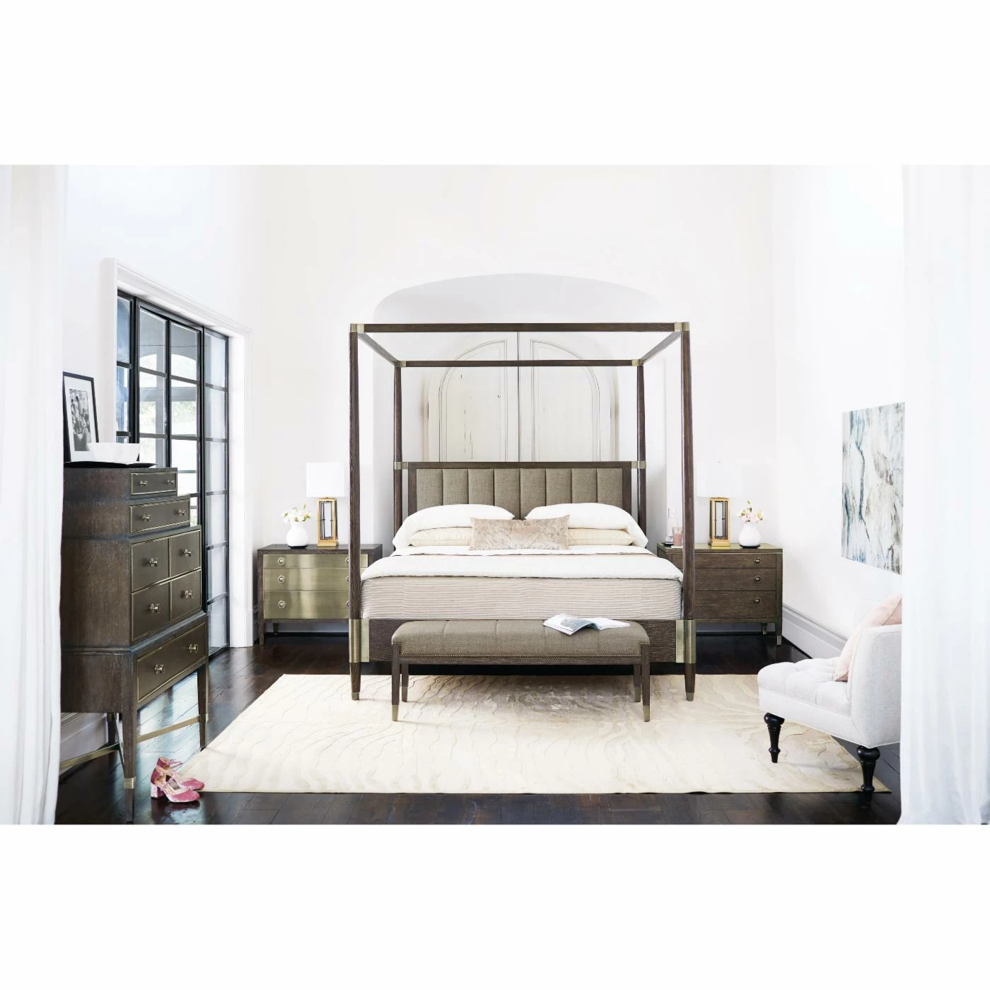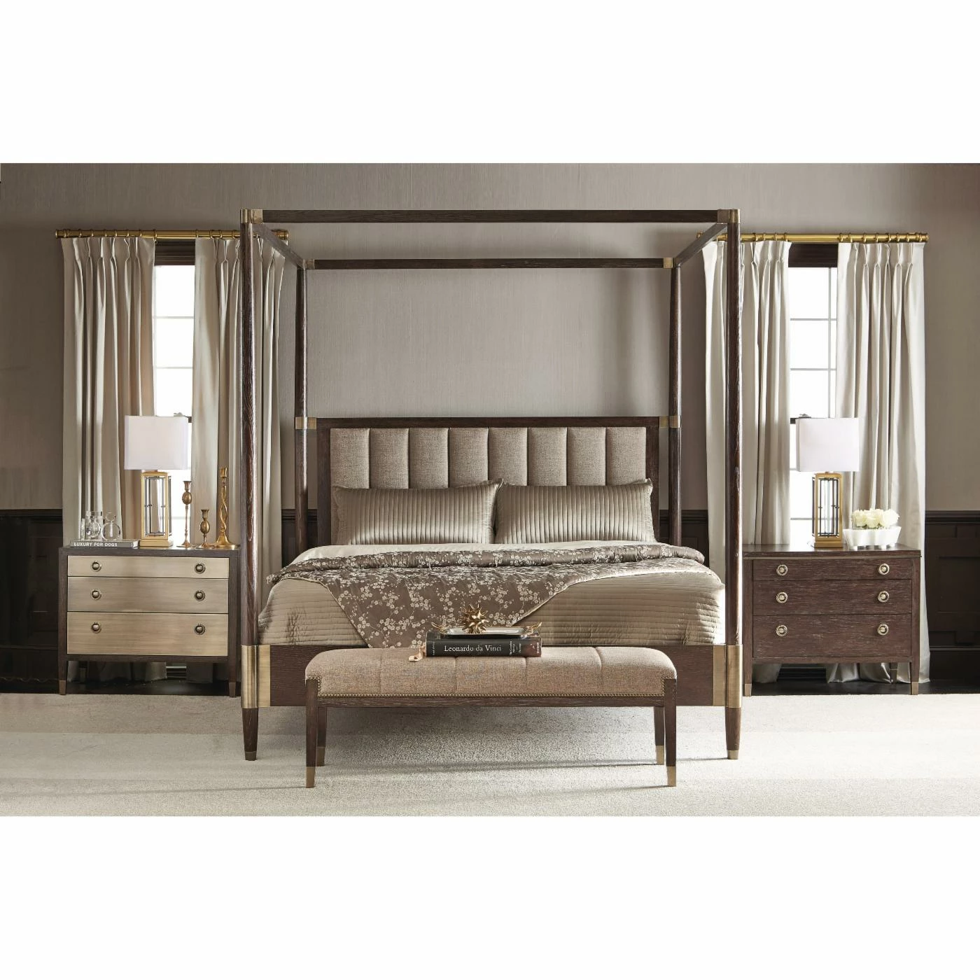 Relax in royal style with the Bernhardt Clarendon Canopy Bed. This luxe bed features a wood bed frame and canopy rails in a brown finish and burnished brass metal accents on each corner. The headboard is upholstered in beige fabric, and the vertical panels add visual interest to the chic bed frame. Choose from available sizes to find the bed that works best in your room. Assembly required.