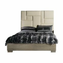 Make a statement with the Bernhardt Mosaic Geometric Low Profile Bed. This luxe bed frame features an upholstered headboard made of multiple panels. Each panel is arranged differently, creating a dynamic geometric pattern that is sure to be the focal point of your bedroom. The wood bed frame is in a beige finish, which contrasts nicely with the light fabric on the upholstered headboard. Style this piece with off-white bedding and blankets to create a monochromatic look, or go the opposite direction with a black faux fur bedspread for contrast. Since the bed frame itself is neutral, you can choose from a variety of color schemes when decorating your room.