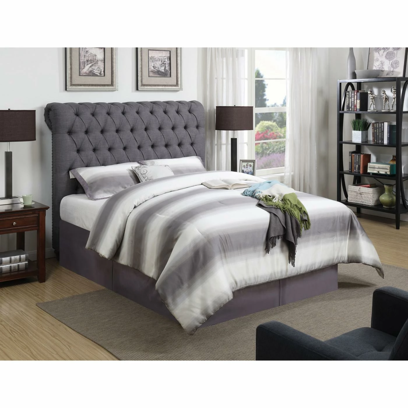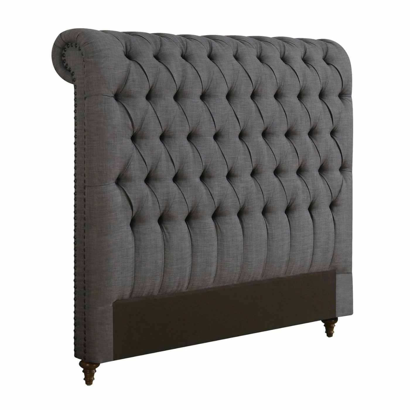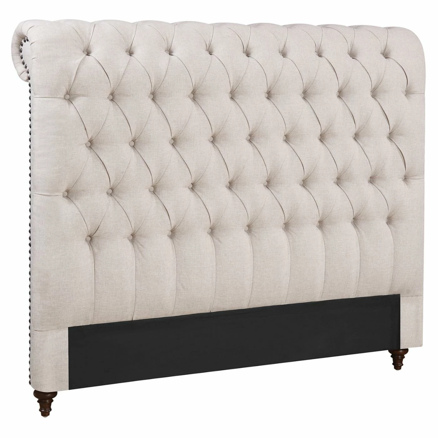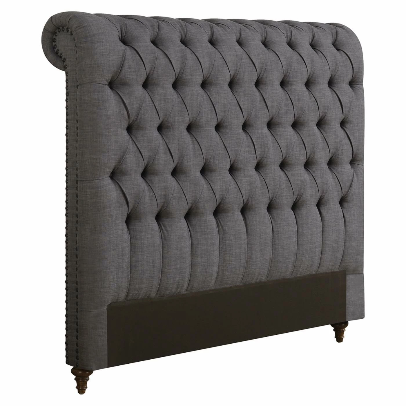 - Fabric upholstered headboard with tufted and nail head trim detail