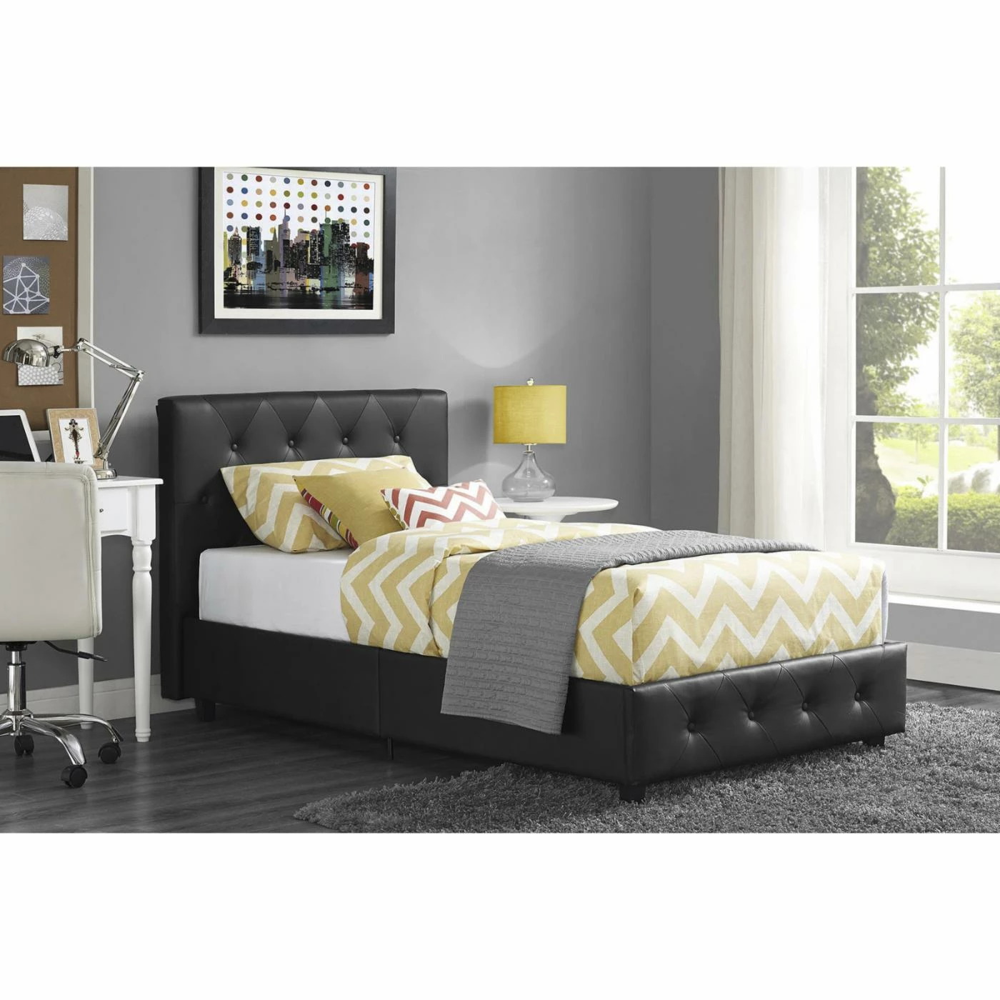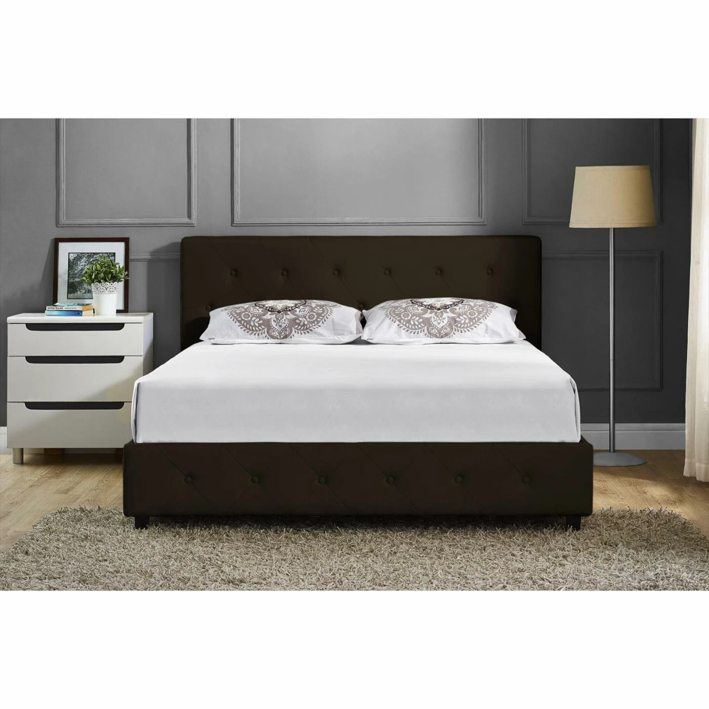 The DHP Dakota Upholstered Bed will be the focal point of your bedroom. Wrapped in faux leather in your choice of color with diamond button detailing, this bed adds modern design and unsurpassed sophistication to your bedroom. With wooden slats to support the mattress, no box spring is needed, giving you the low profile look you love. Made to complement almost any dΓ©cor, this bed comes your choice of size and is perfect for any size room.