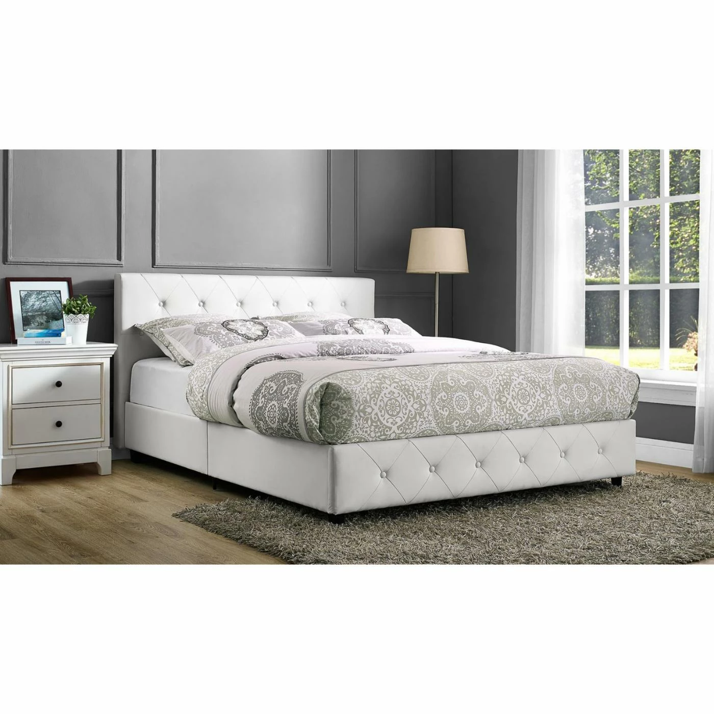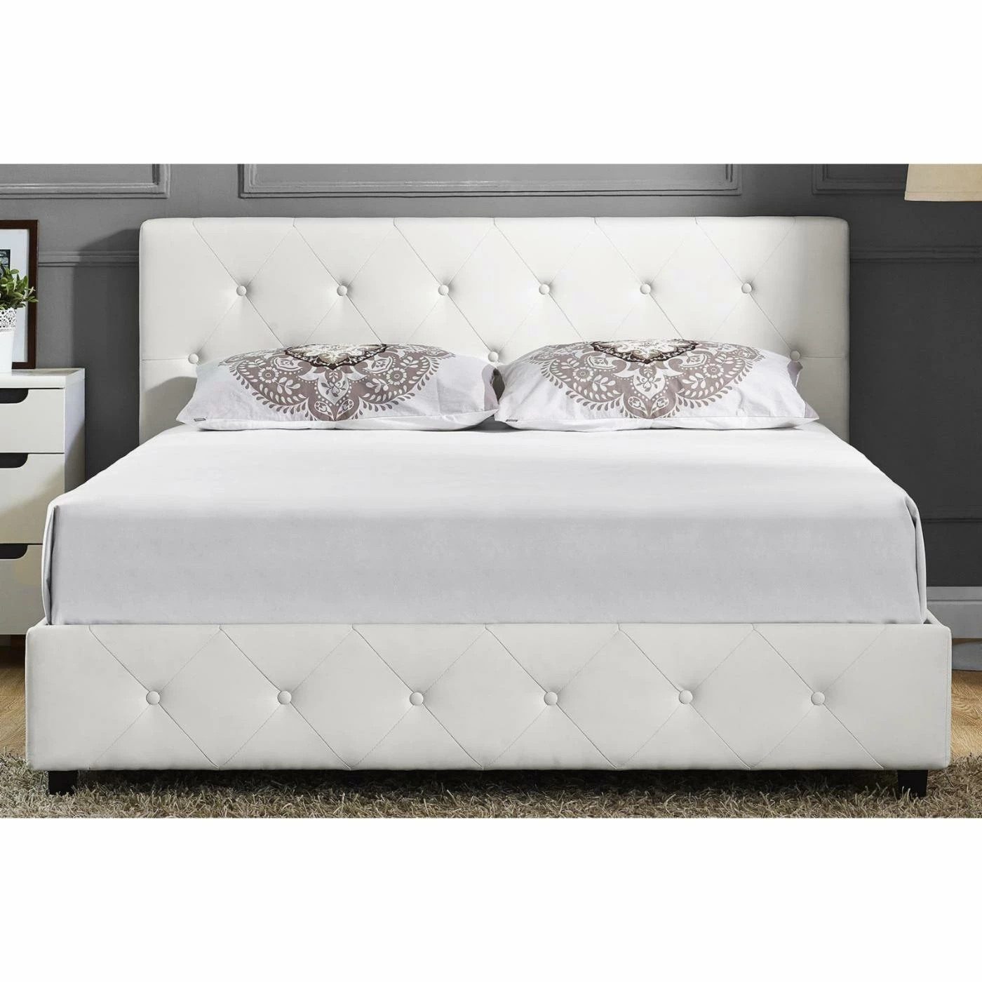 - Diamond button tufting on headboard
