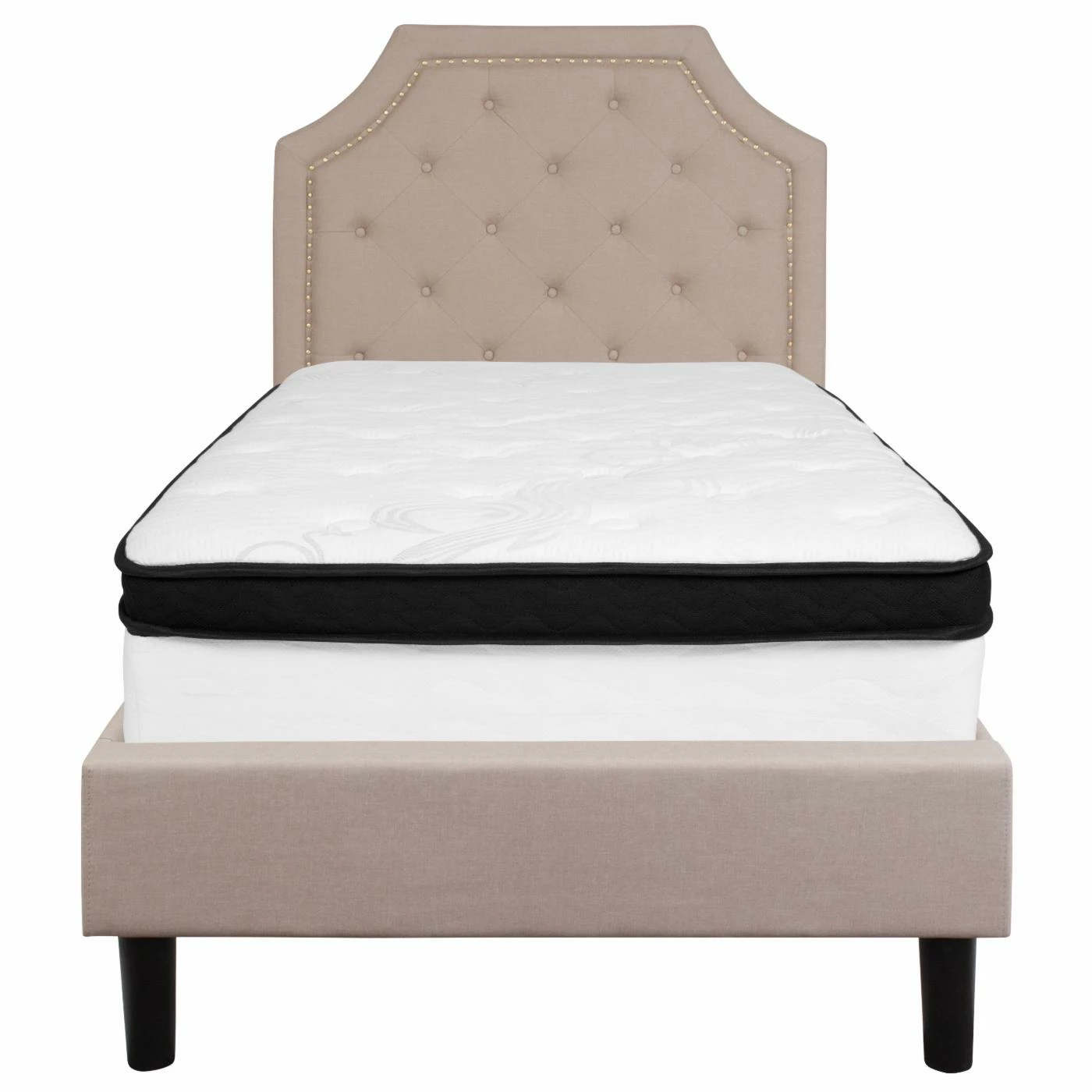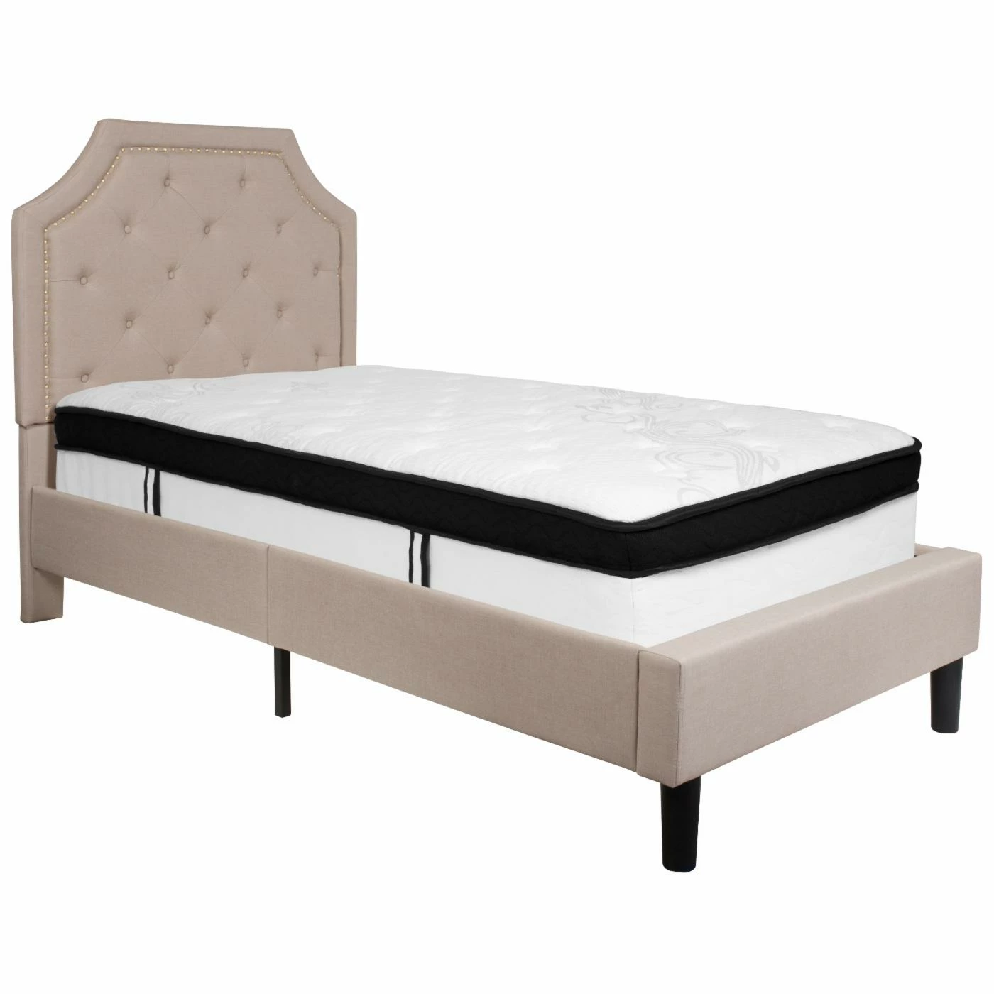 Introduce some relaxed modern minimalism to your bedroom with the Flash Furniture Brighton Tufted Upholstered Platform Bed. This bed frame is built from metal and wood for maximum durability. A slat platform eliminates the need for a box spring. The entire frame is padded with high-density foam and comes upholstered in polyester fabric. The rectangular has scalloped corners and a border of nailheads. Match the bed frame to your needs by choosing among the available finish options.