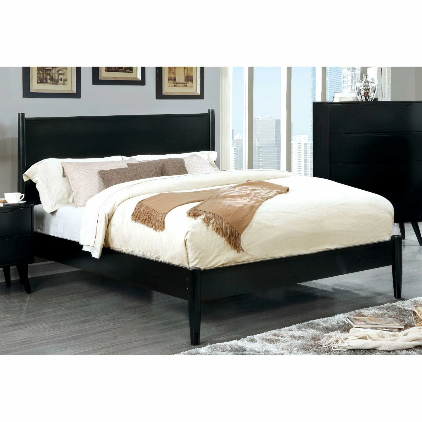 Revitalize your modern bedroom with the Furniture of America Stewart I Wooden Flat Panel Platform Bed as your new centerpiece. Its low frame is perched on round, tapered feet and constructed from thick wood. Lush veneers top the wood, finished in a rich black color. The headboard and footboard both boast a simple rectangular look. A slat-platform means there’s no need for a box spring. Select from available sizes.