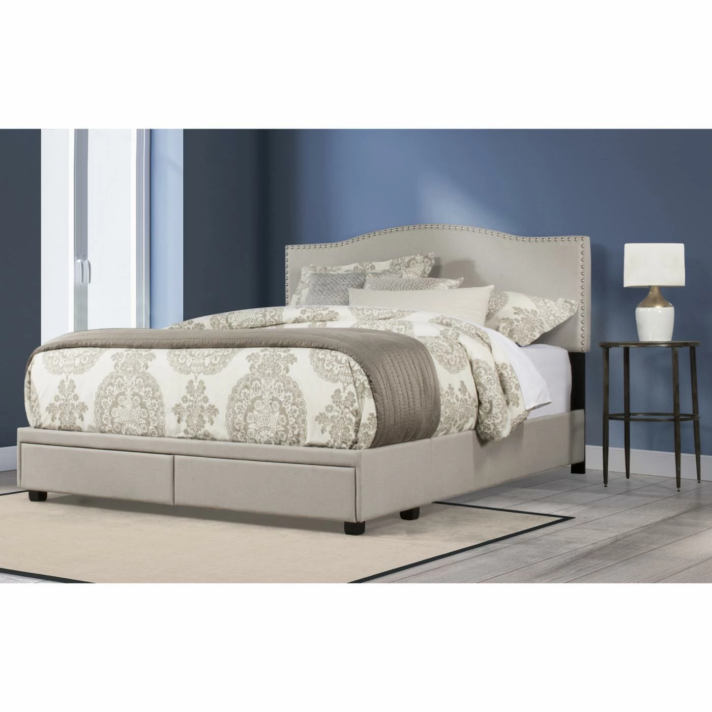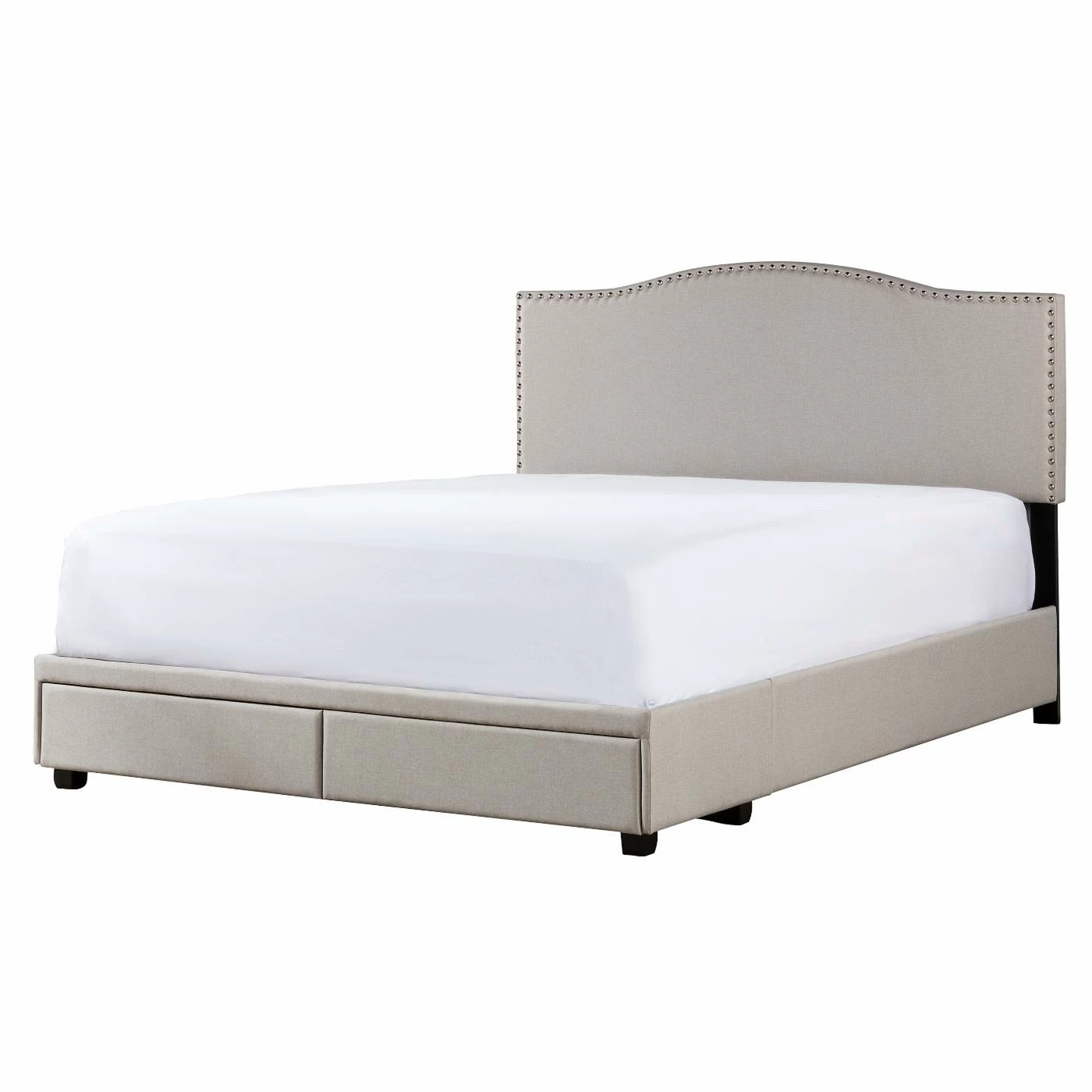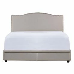 Beauty commences with the Hillsdale Furniture Kiley Upholstered Storage Platform Bed. With a modern design and covered in fog colored upholstery, this platform bed is the definition of sophistication and the perfect addition to your bedroom. The headboard features sharp angles at the corners with a visible arch in the middle — as well as nail head trim around the edges. For convenience, the headboard adjusts in height to accommodate your ideal mattress type. The platform bed features convenient footboard drawers for extra storage space. The bed frame is made of study wood and includes a durable wooden slat system and center leg supports. This bed ships in one box: headboard, footboard, side rails, drawers and slat support system. Although a box spring is not required, the bed does require a mattress, which is not included. Assembly required.