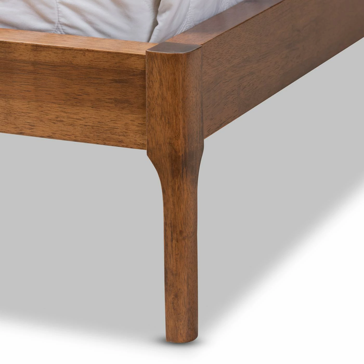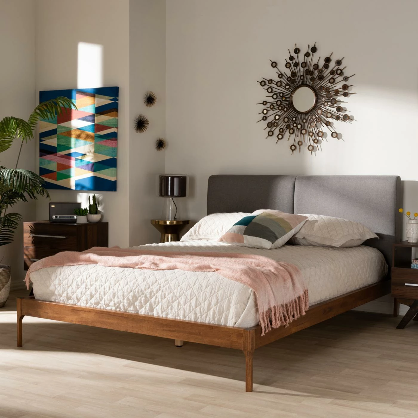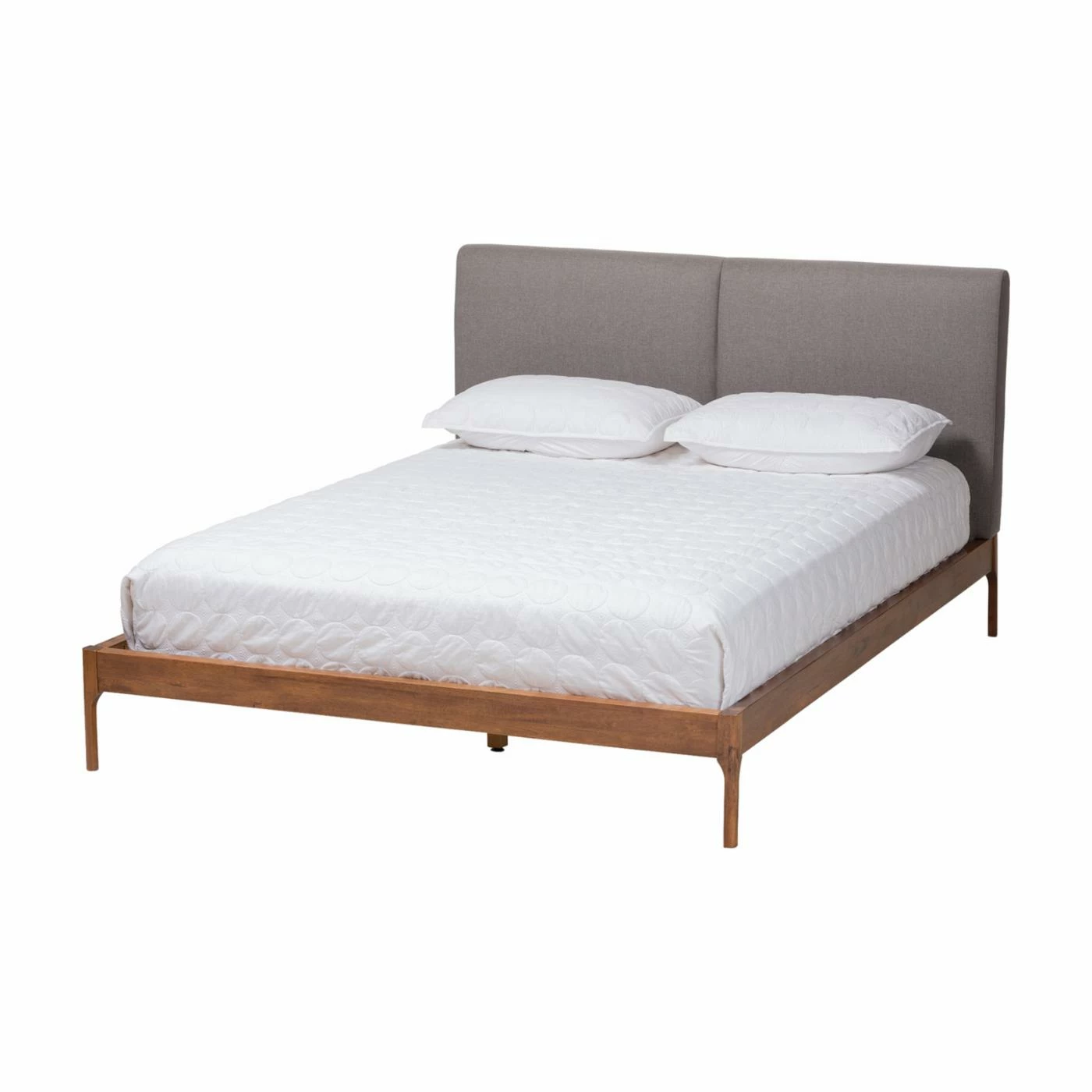 Add mid-century modern style to your master or guest bedroom with the HN Home Calvin Mid-Century Modern Upholstered Platform Bed. Sleek and sophisticated, this bed features clean lines and a padded headboard with a vertical center line tuft to create a split-cushion look. The solid rubberwood frame is finished in walnut to complement any decor while the upholstered headboard is padded to add dimension and comes in your choice of available colors. Featuring ample under bed clearance so you can easily store boxes and bins underneath, this bed is a great choice for master and guest bedrooms alike.