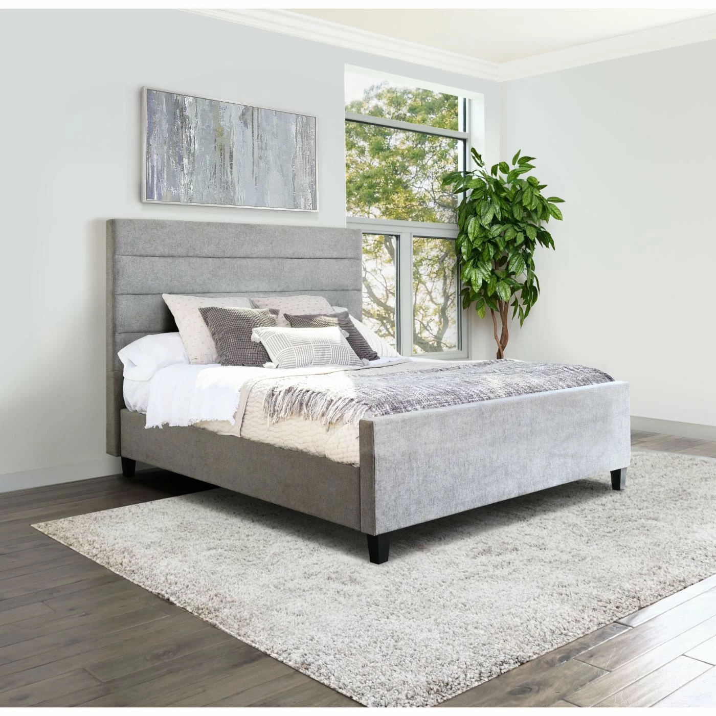 The HN Home Downey Upholstered Panel Bed provides sleek contemporary style for your bedroom. This panel bed is made of solid wood and plywood, and is upholstered in a gray polyester linen. It features linear tufting to give a modern transitional look that will blend into existing decor.