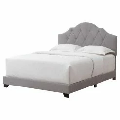 Make the HomeFare Upholstered Camelback Low Profile Bed the centerpiece of your master bedroom. This bed features a low-profile footboard and scalloped camelback-style headboard. From the side rails to the diamond-tufted headboard, each piece has an Asian hardwood frame that’s padded with foam and upholstered in polyester fabric. Choose from available upholstery colors to best coordinate with existing bedroom décor. Hinged side rails make it easy to assemble; with two people it takes about 60 minutes!