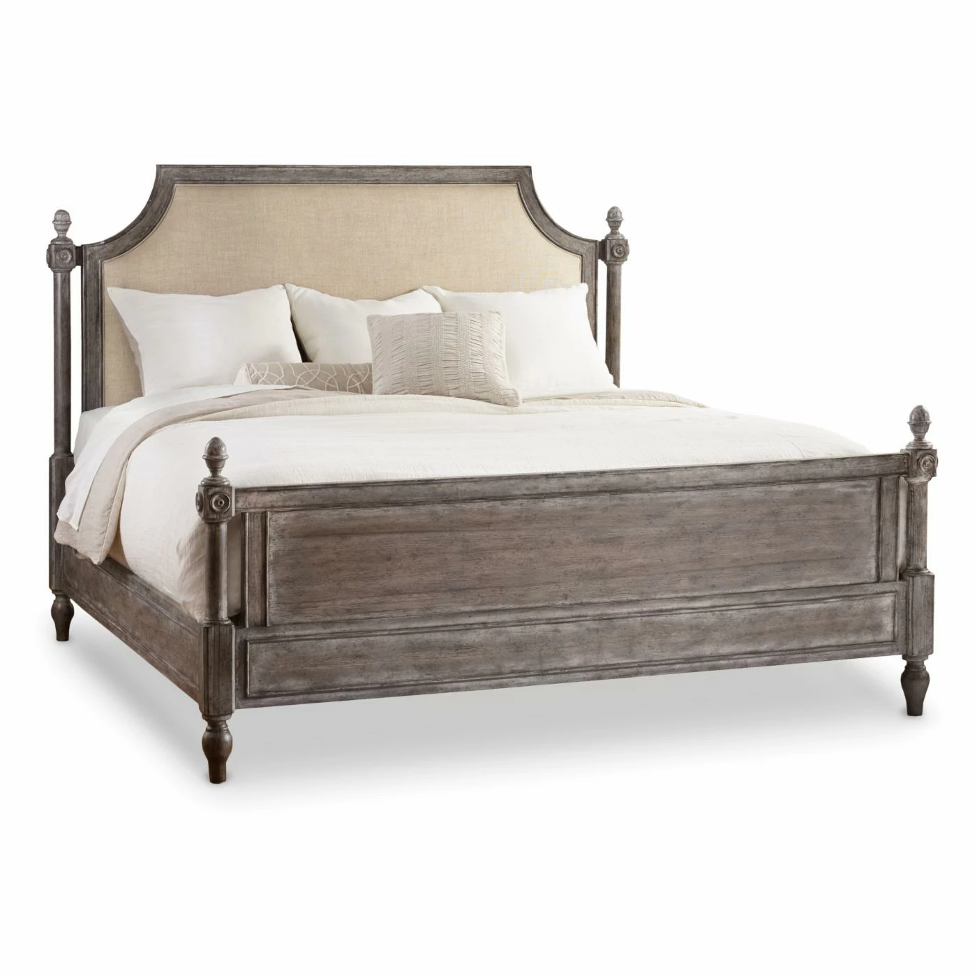 Sleep secure in your Hooker Furniture True Vintage Fabric Upholstered Poster Bed. This pleasing poster bed is dressed in pecky pecan veneers in a driftwood finish. Hooker’s finishes aren’t done in haste; each requires many, many steps and results in a surface that not only delights the eye but the fingers as well. Linen upholstery offers a rightly textured, slightly rustic complement for the overall feel of this poster bed. Turned posts and feet add to the appeal.