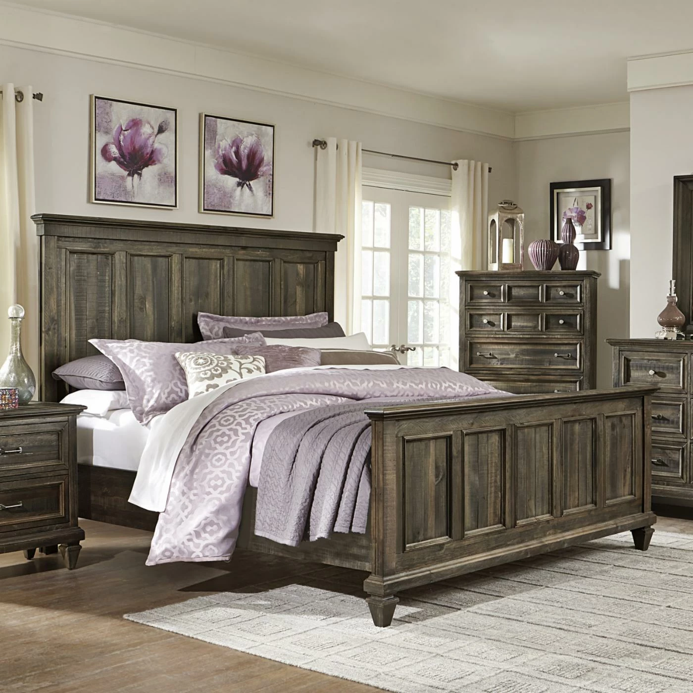 Head for the hills! With the Magnussen Calistoga Panel Bed, you’ll feel the allure of wine country’s gentle breezes and historic inns every night. A weathered charcoal finish is deep and dramatic, anchoring this bed as an impressive focal point for your room. This bed is crafted of engineered pine and features intricately carved details.