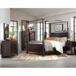 Freshen up with the Magnussen Pine Hill Canopy Bed; this modern poster bed is delightfully sleek and can suit a range of settings from urban loft to contemporary cabin. Hand-crafted design elements sustain a bit of warmth thanks to the warm rustic pine finish. Crafted of engineered pine; does not include box springs or mattress.
