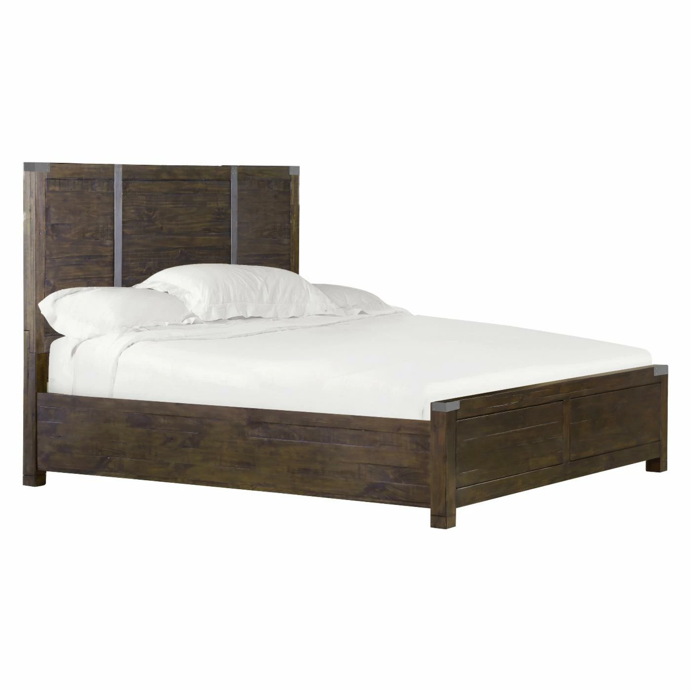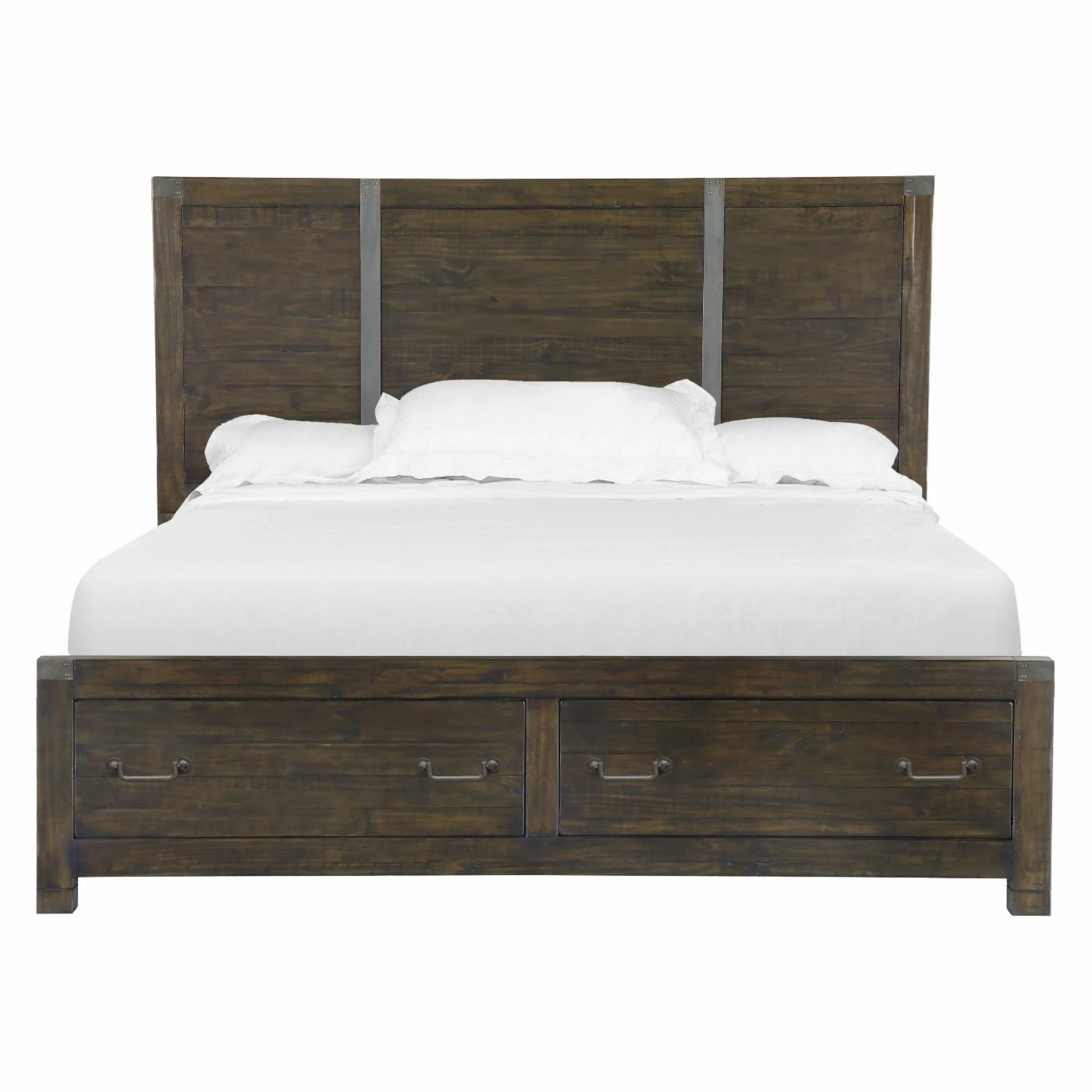 With aged iron accents and a warmly rustic pine finish, the Magnussen Pine Hill Storage Panel Bed suits a range of styles from contemporary/industrial to wild, wild West. The horizontally planked look is stylish and exquisite. Select the optional storage drawers to fully utilize your space; the drawers run on metal ball-bearing glides and can hold extra blankets, linens, accessories, or whatever your need may be.