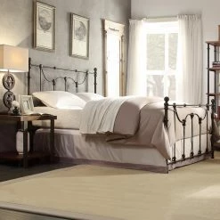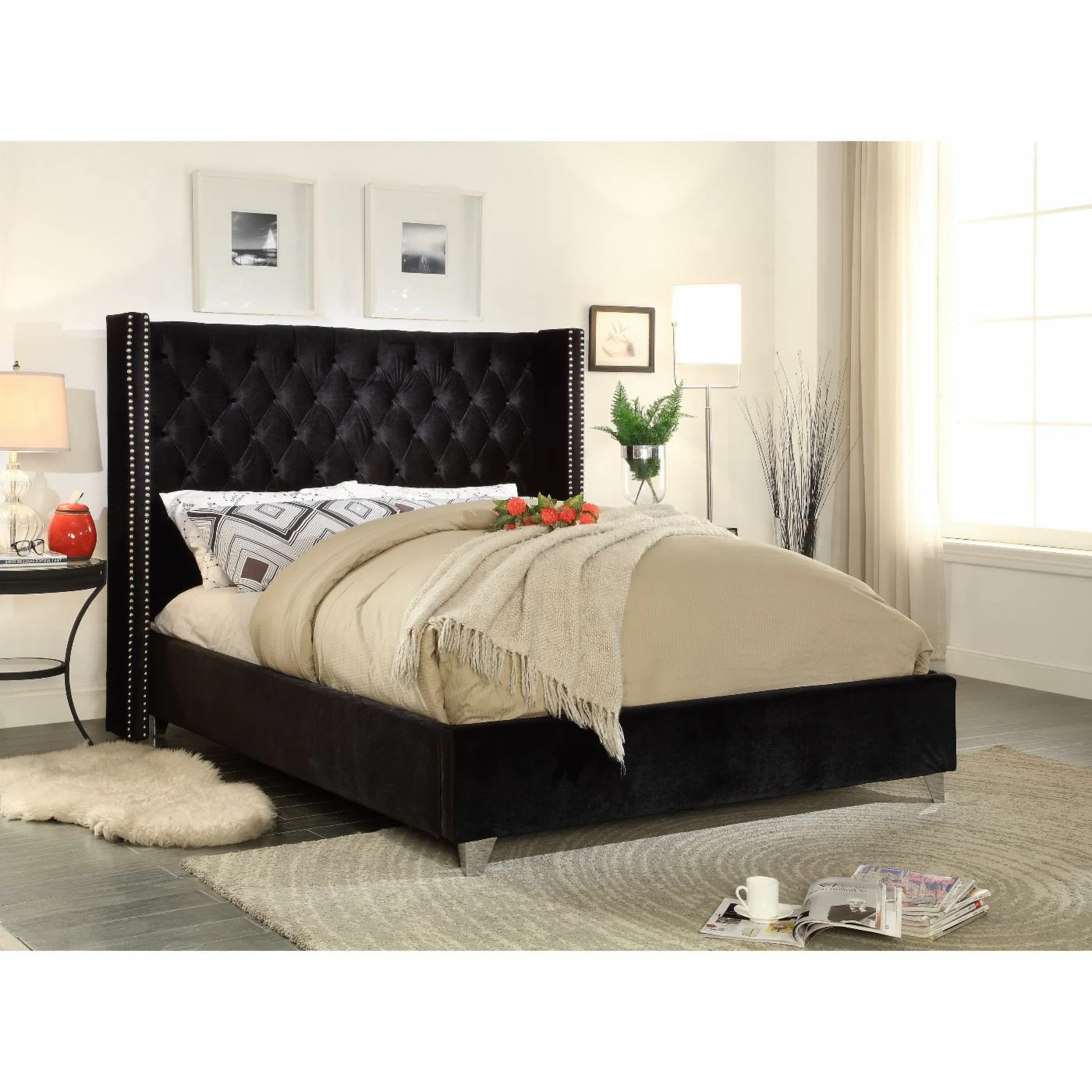 - Low profile, velvet-upholstered footboard, rails