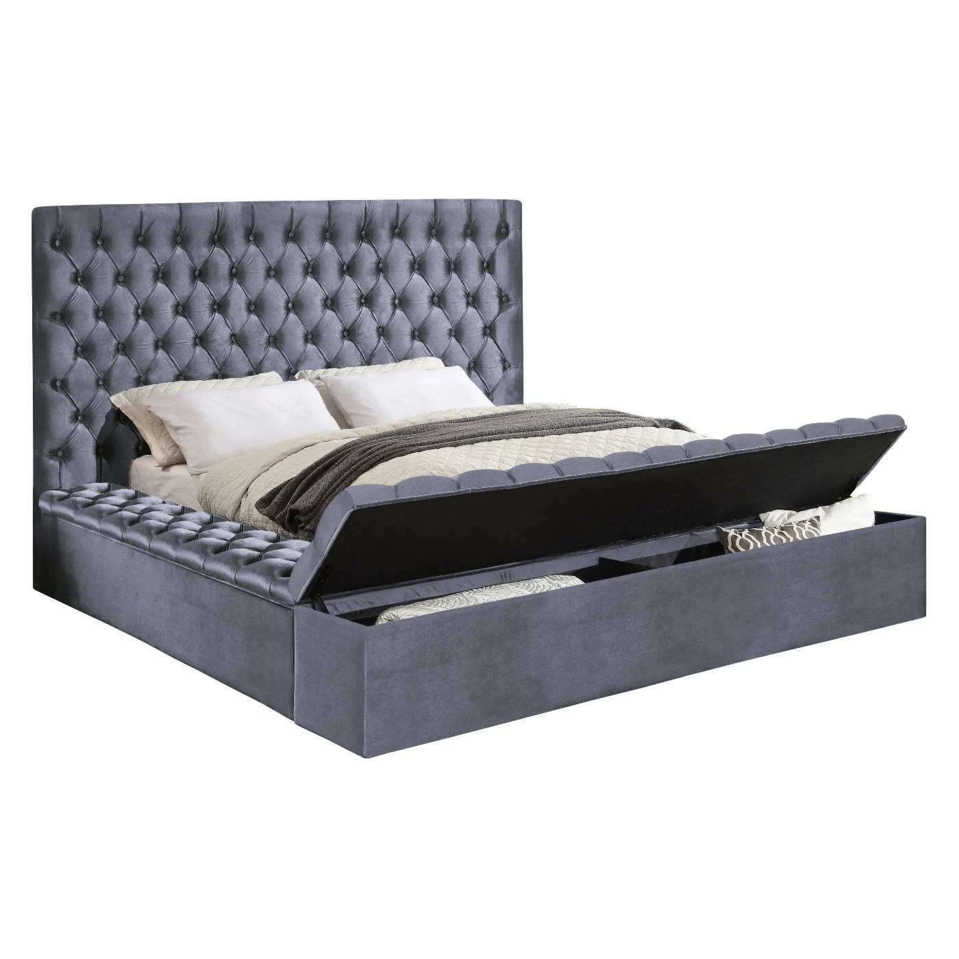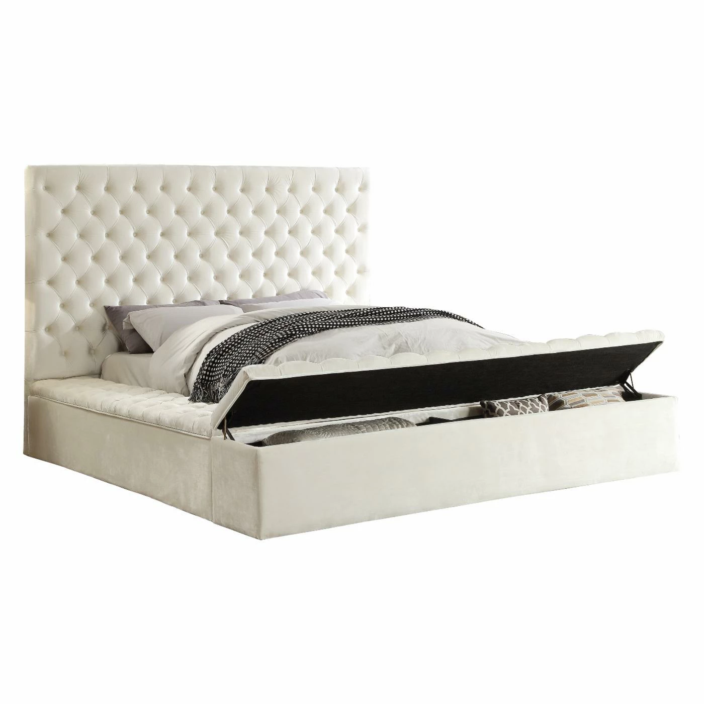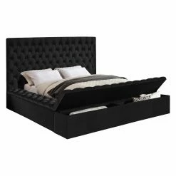 Extended elegance and concealed storage make the Meridian Furniture Inc Bliss Velvet Platform Storage Bed a dreamy bedroom essential. Velvet upholstery is deeply button tufted and offered in your choice of available colorway. Extended panels run along the sides and the footboard, which opens to reveal plenty of room for extra linens, pillows, and more. This platform bed doesn’t need a box spring, simply top it with your mattress. Choose from available size options.