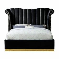 The elaborate Meridian Furniture Inc Flora Upholstered Wingback Low Profile Bed with Nailhead Trim was designed to be the showpiece of your luxurious bedroom suite. Its tall and curvy wingback headboard is channel tufted and detailed by gold-finished nail head trim. A matching gold base adds a modern touch. This bed is fully upholstered in velvet and offered in your choice of available colors. It includes full slats so a box spring isn’t required. Choose from available sizes.
