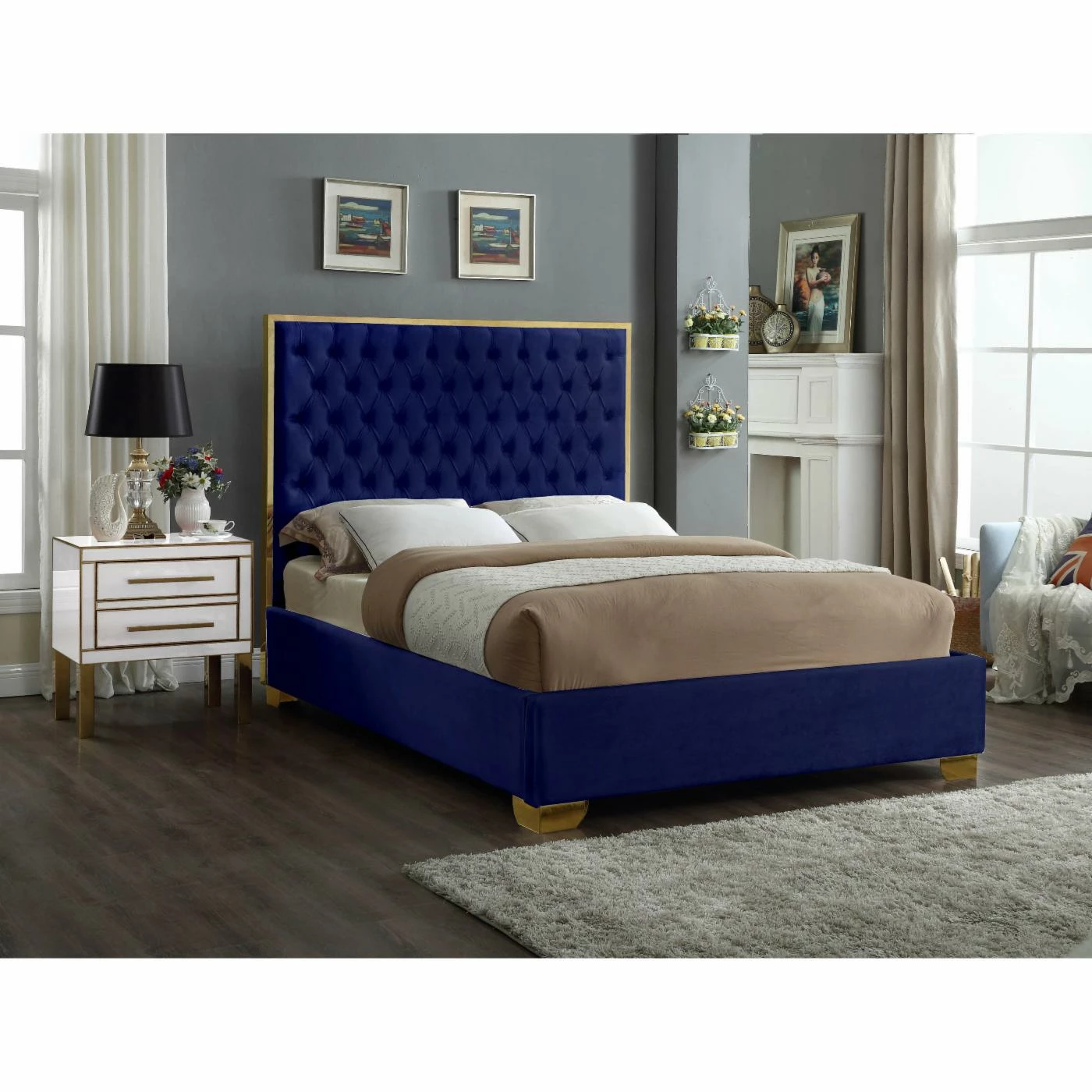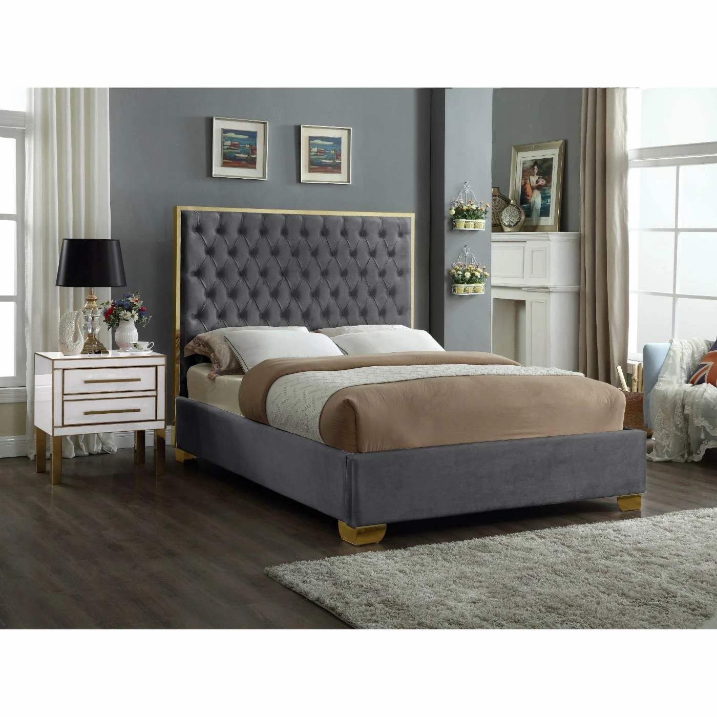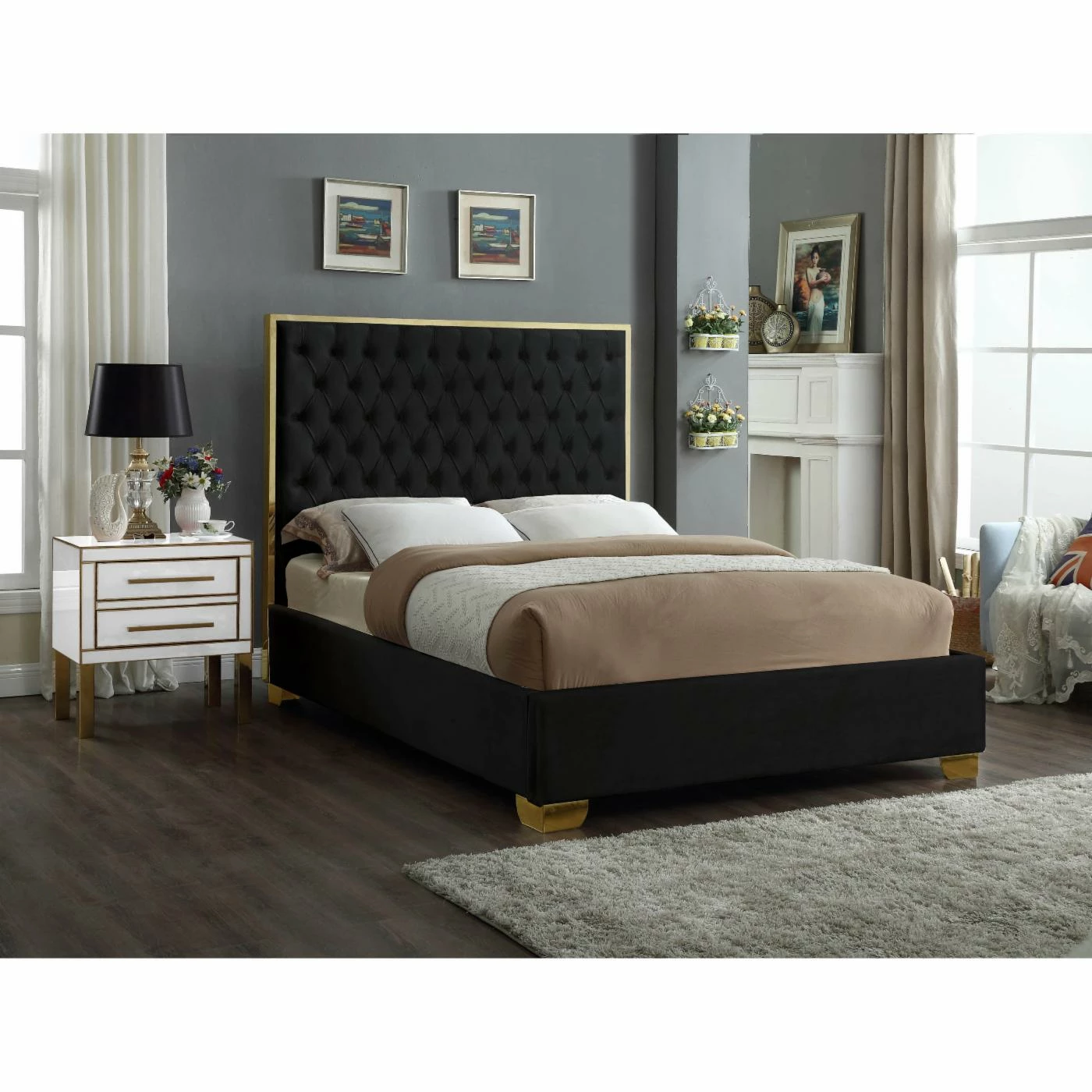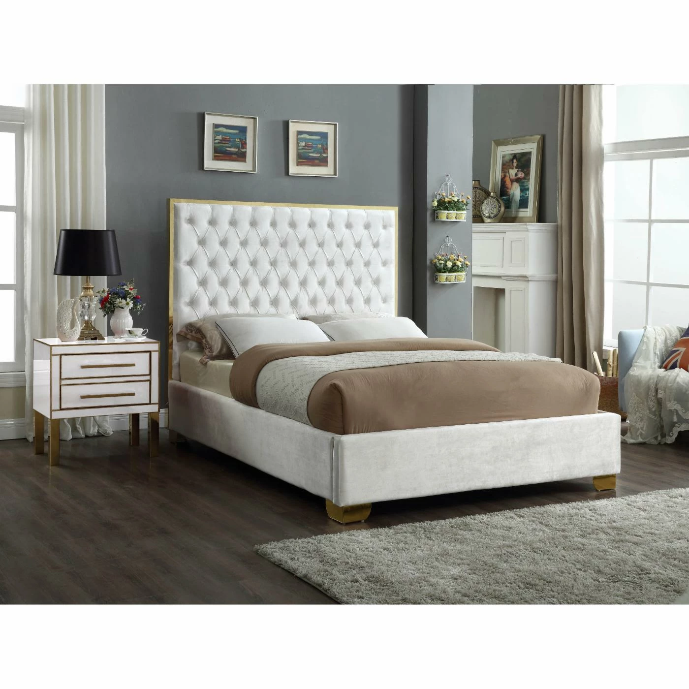 - Tall button tufted headboard with polished gold trim