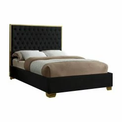 As the showpiece of your modern glam bedroom, the Meridian Furniture Inc Lana Tufted Low Profile Bed features a lofty headboard and is fully upholstered in velvet. The headboard is deeply button tufted and trimmed in steel with a polished gold finish. Chunky metal legs have a matching gold. Customize the luxury of this platform bed by choosing from available velvet colors. Full slats are included so a box spring isn’t required. Choose from available sizes.