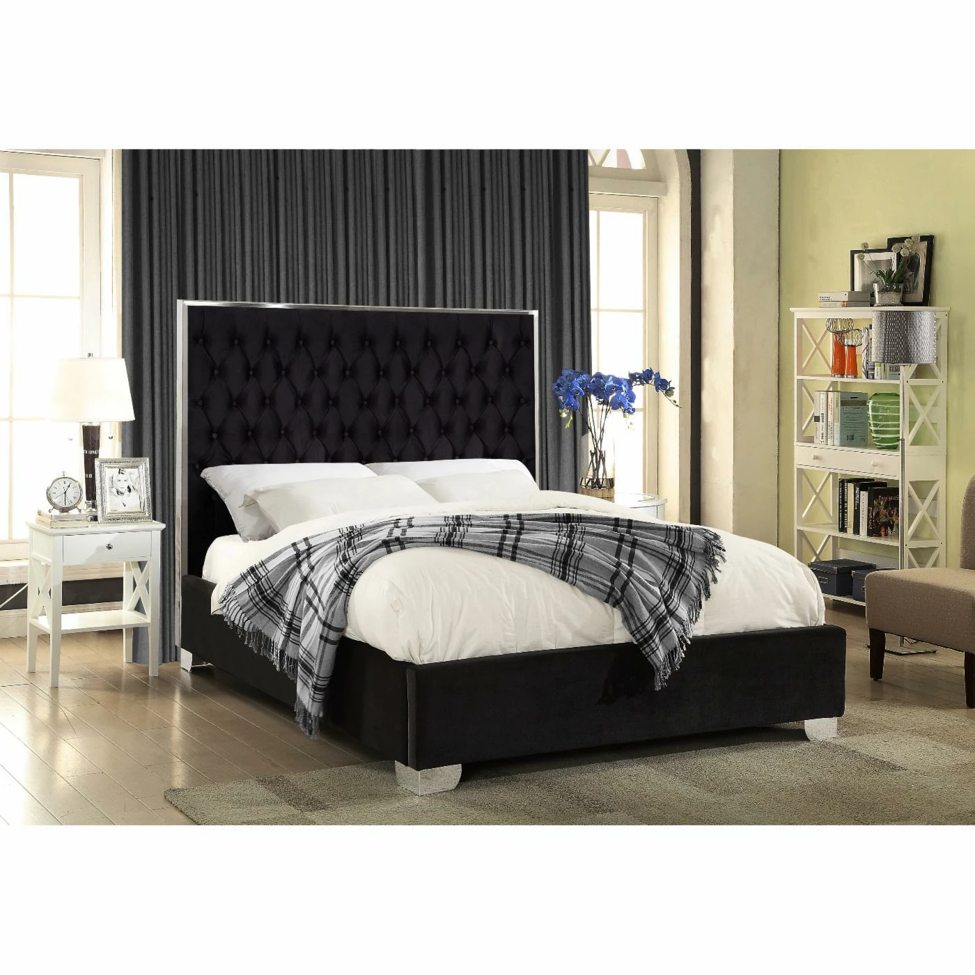 The richly-appointed Meridian Furniture Inc Lexi Velvet Platform Bed is fully dressed in sumptuous velvet and comes in your choice of colorway. Its stately headboard is rich with button tufting and framed in daring metal. Tapered chromed feet enhance the modern, elegant design. This platform bed doesn’t require box springs. It comes in a choice of available sizes.