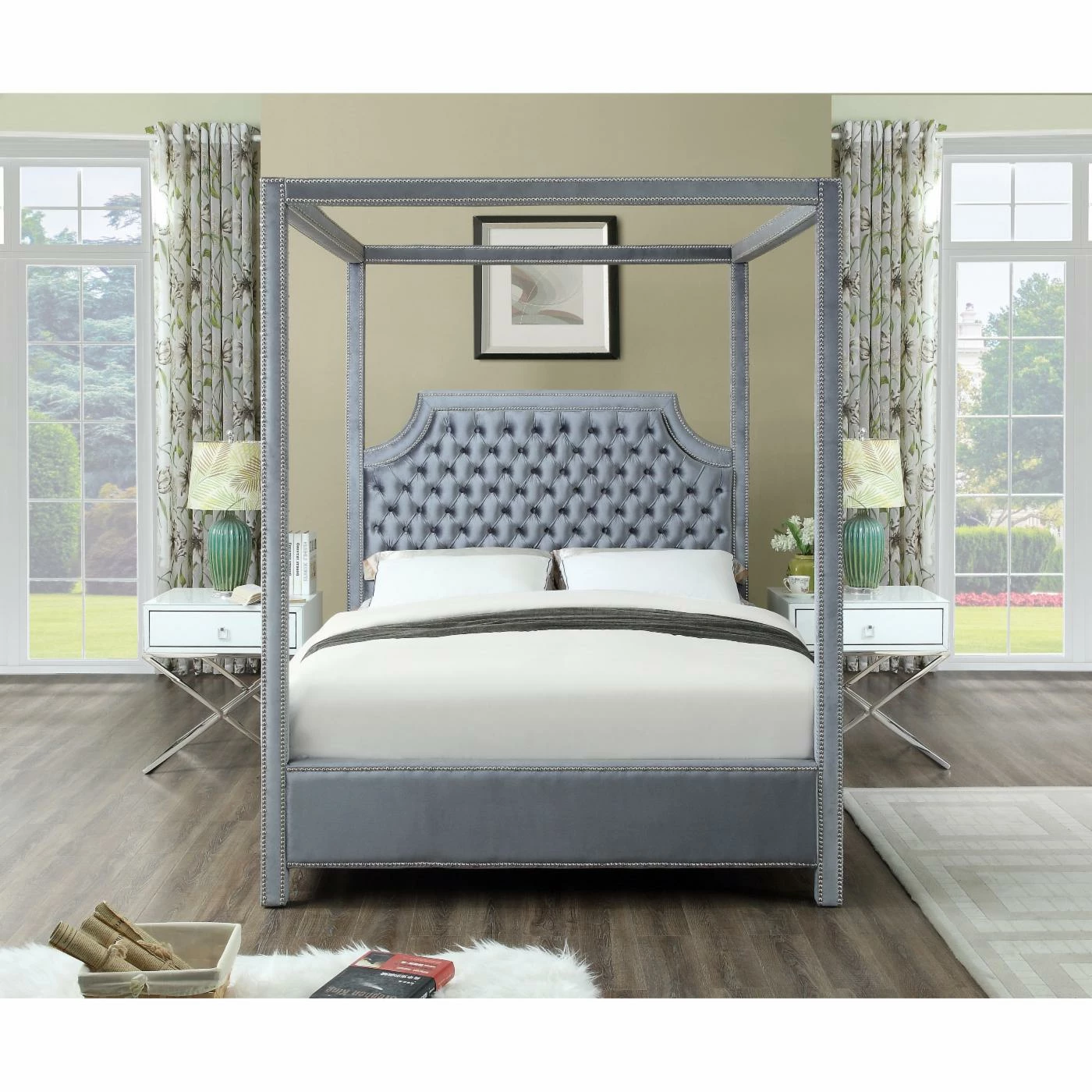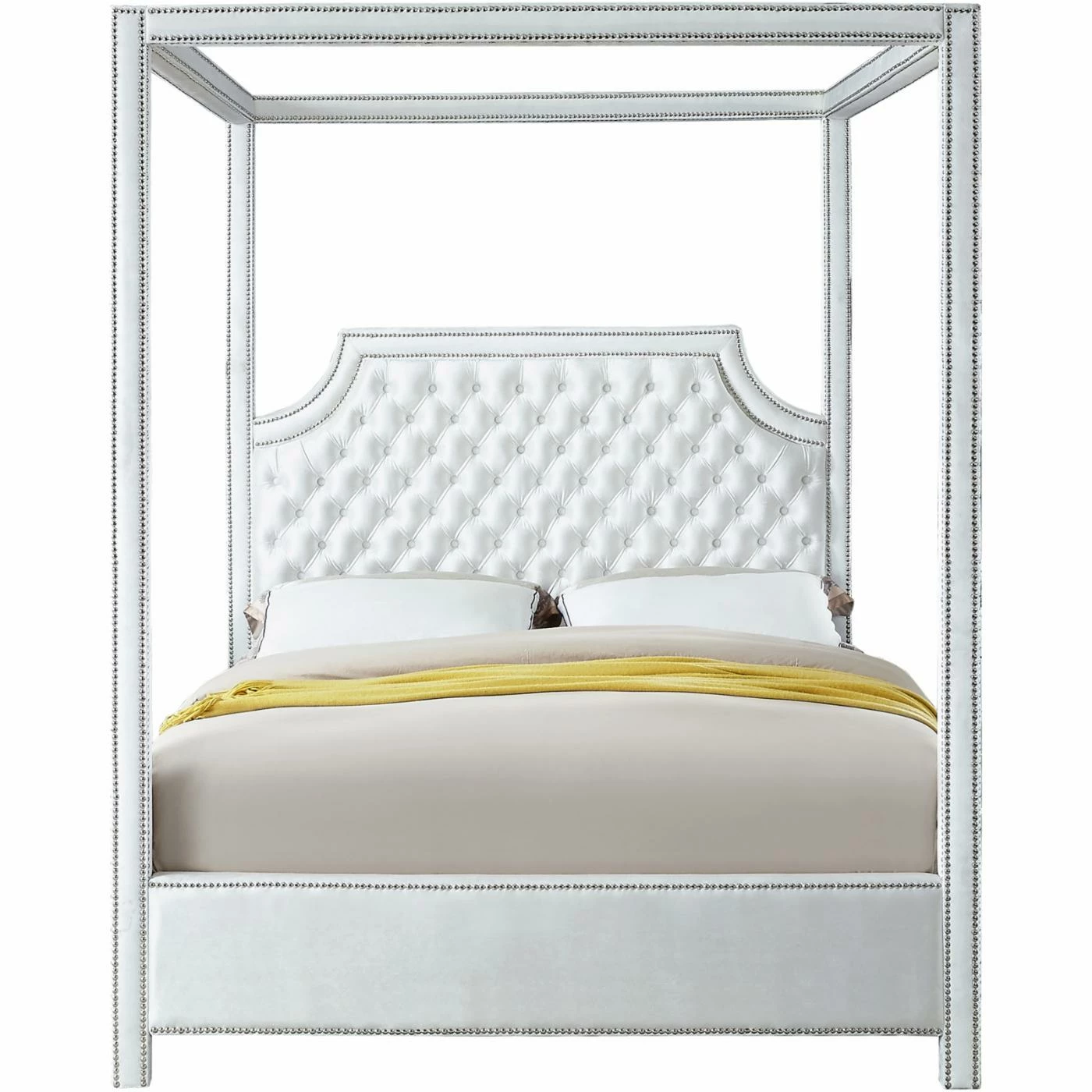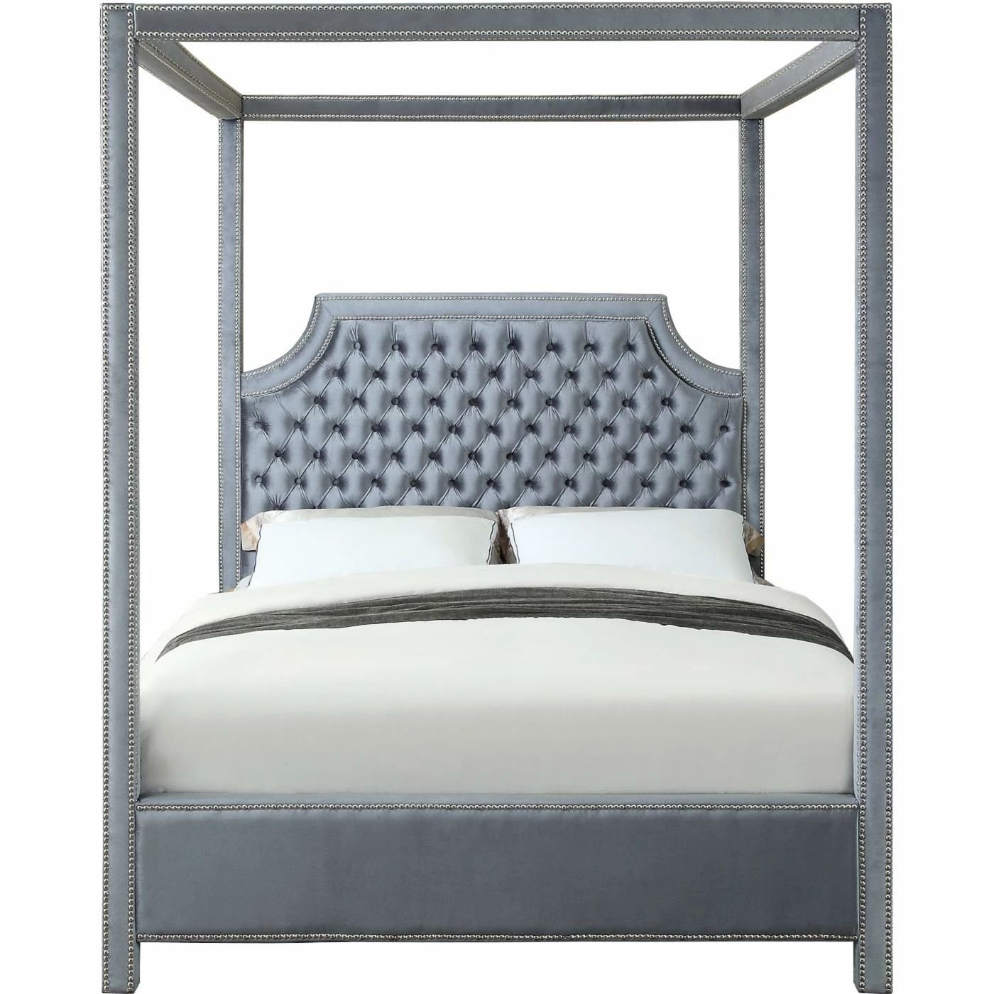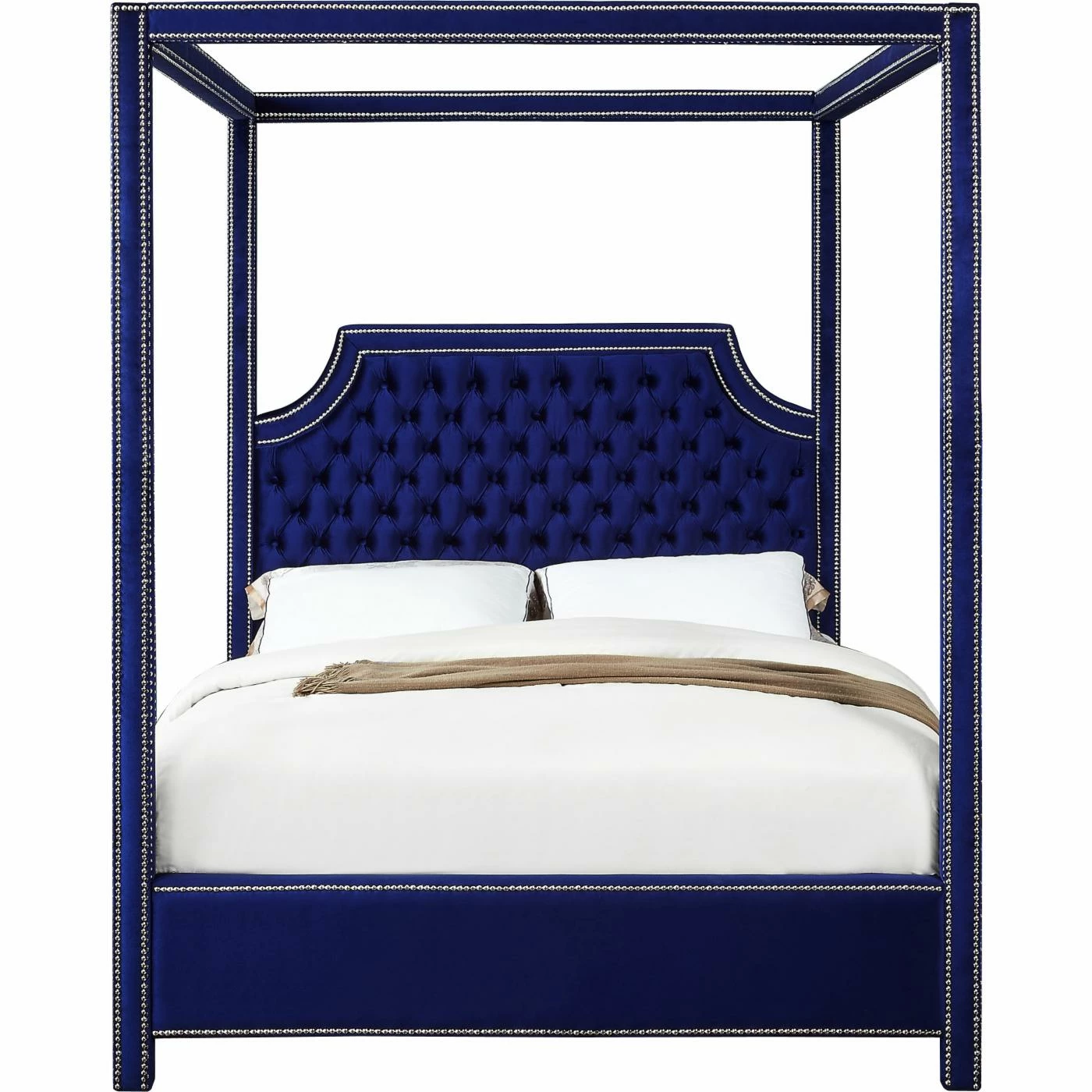 Bring sumptuous romance into your bedroom with the Meridian Furniture Inc Rowan Tufted Canopy Bed with Nailhead Trim. From canopy top to base rails, everything on this bed is upholstered in velvet. Personalize the look by choosing from available velvet colors. Nail head trim adds a contemporary edge. This canopy bed features a soaring notched headboard that is deeply button tufted. An included slat roll makes this bed mattress-ready. Choose from available sizes.