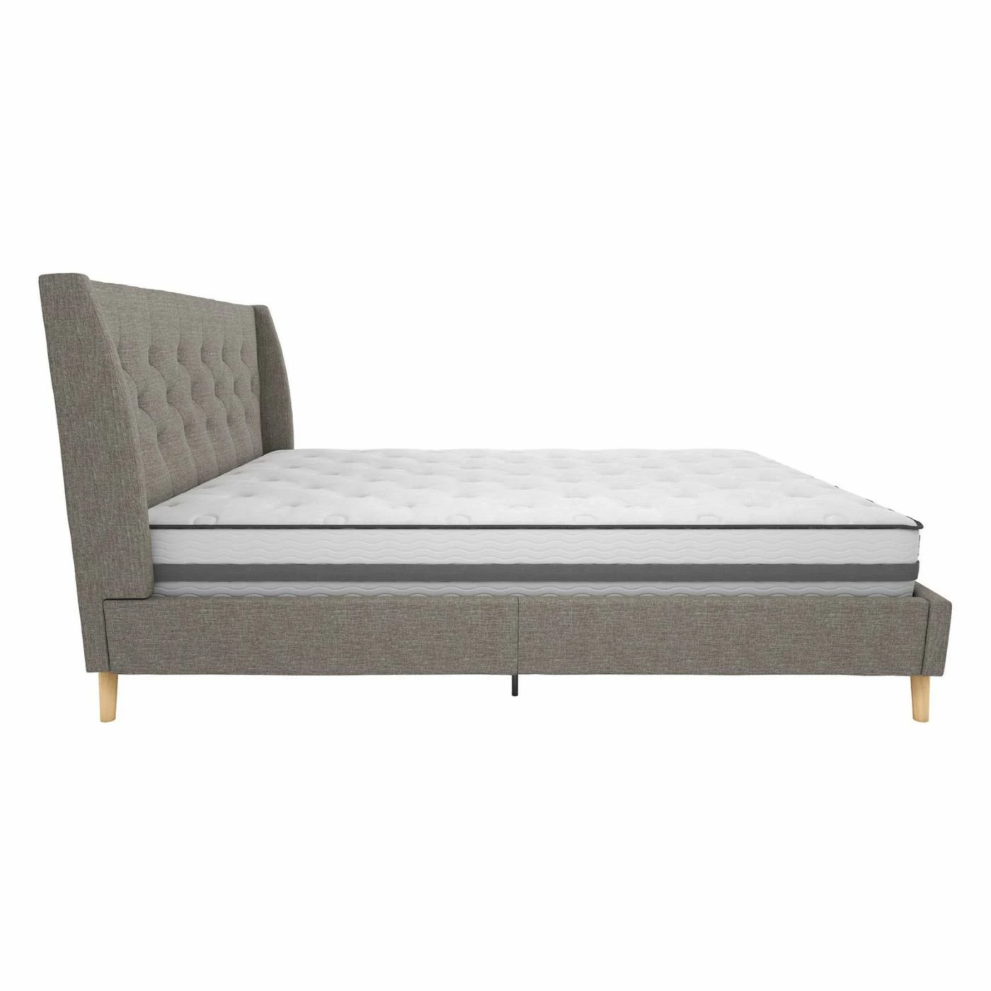 The Novogratz Her Majesty Bed is tailor-made for your bedroom. This complete bed includes a durable wood frame, a headboard, and rails. The headboard features a classic wingback design with button-tufted linen upholstery. It stands on four tapered, wooden legs, with two metal legs and a center rail offering additional support. It has a slatted base for ventilation, and no box spring is needed.
