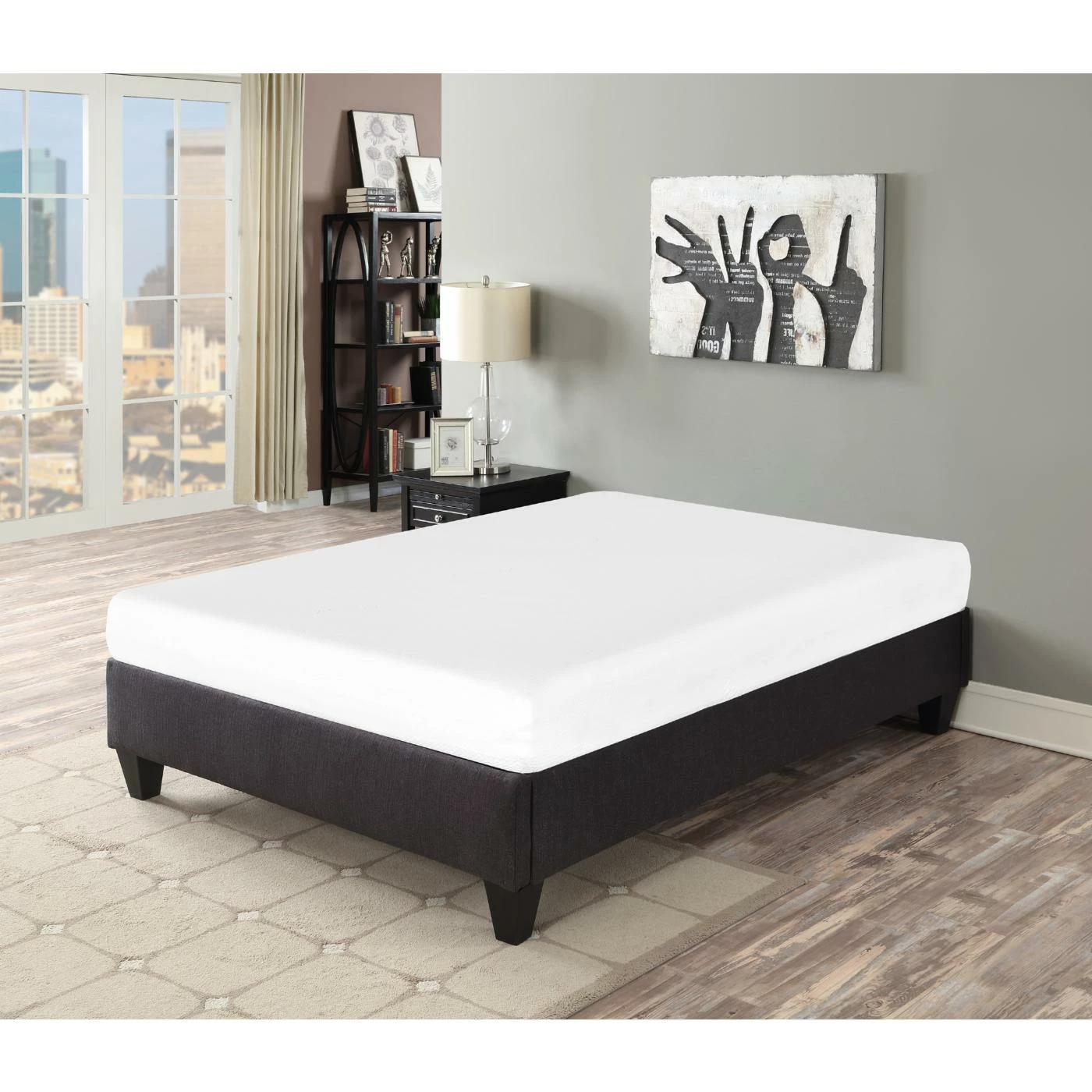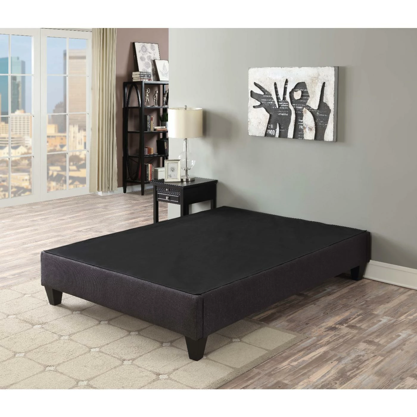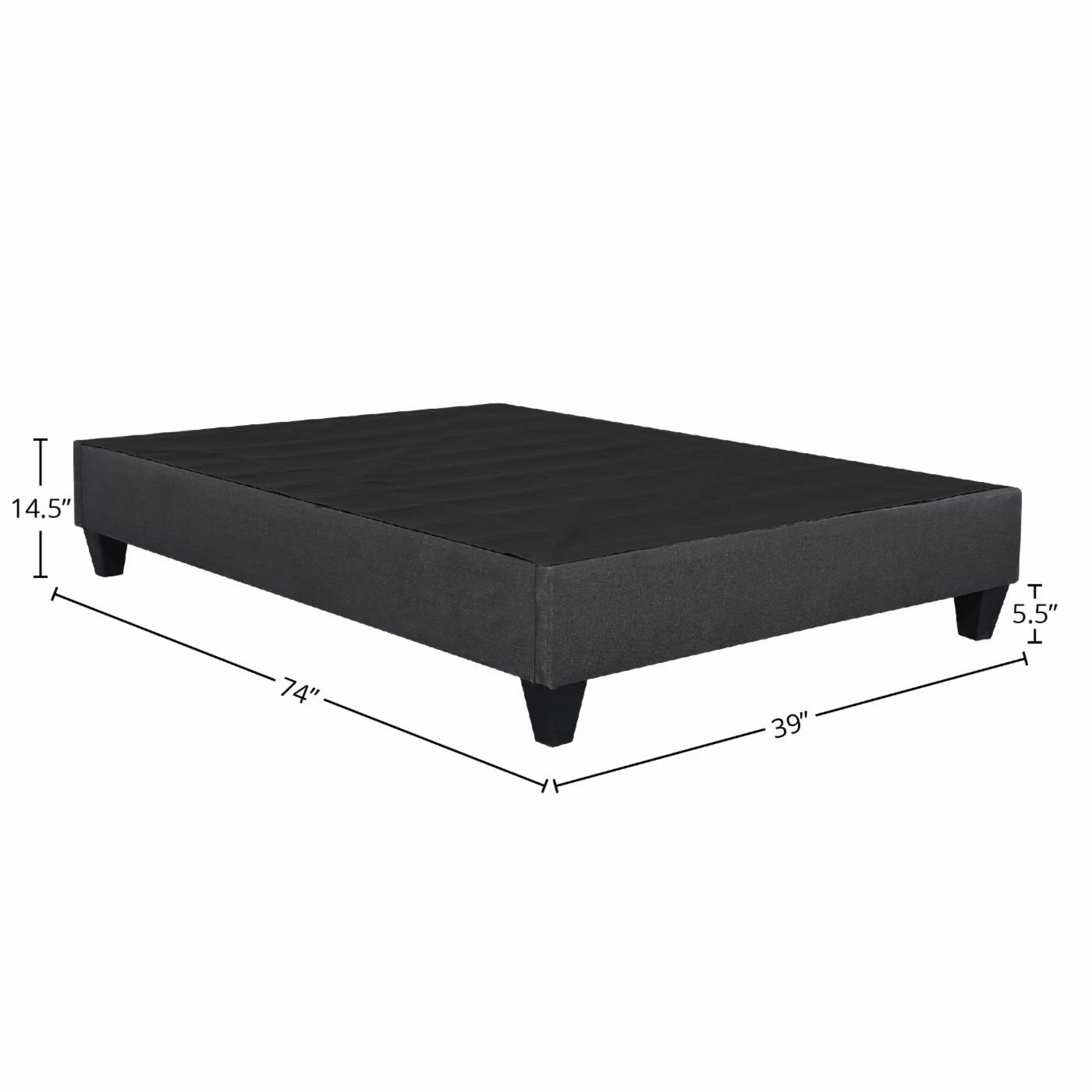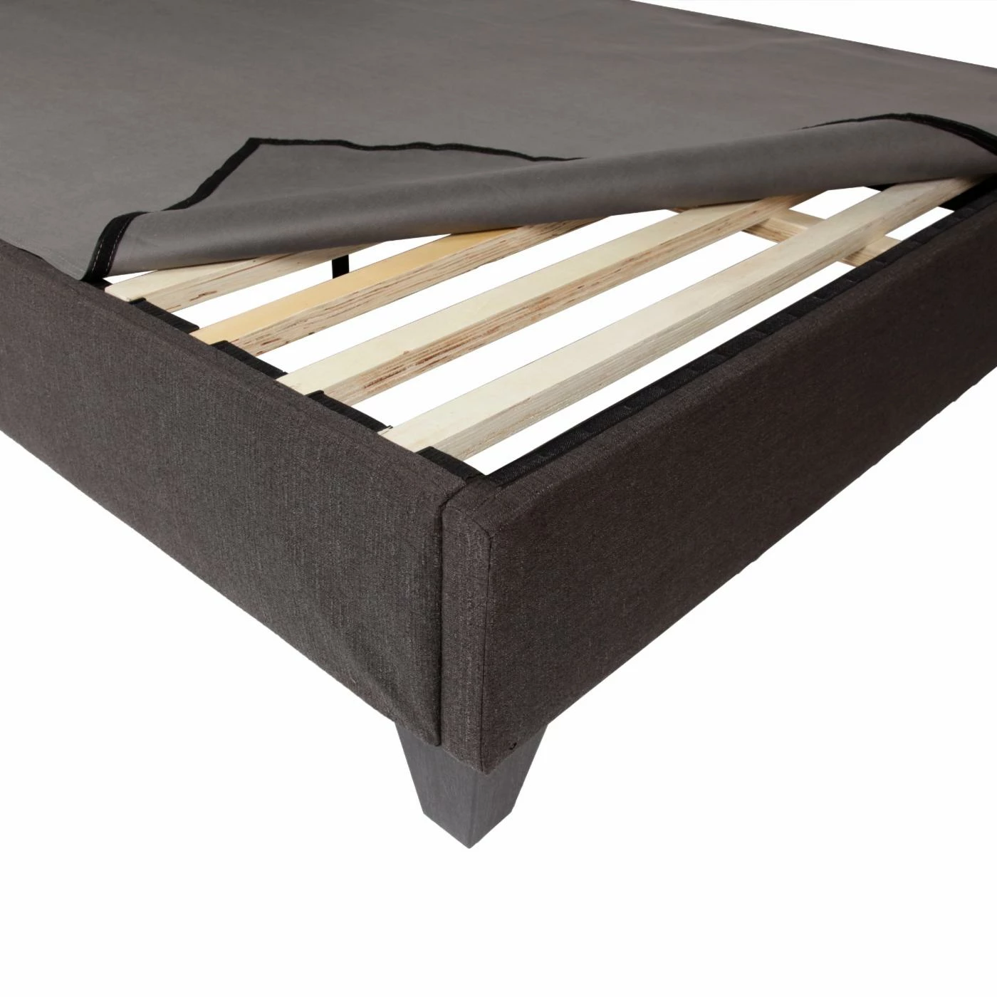 Refresh your bedroom with the cozy minimalism of the Carter upholstered bed frame. The Carter bed frame elegantly combines the functions of a mattress foundation and bed frame to create a contemporary standalone modern platform bed. Featuring a simple wood construction with padded corners for safety and upholstered in dark grey linen, the Carter upholstered wooden bed frame base can create that cozy bedroom youβve always dreamed of. With its contemporary, modern look, this simple bed frame is sturdily crafted with solid wood and plywood for night after night of peaceful sleep. Attach your favorite headboard with brackets (both sold separately) to personalize your space. The Carter upholstered platform sturdy bed frame base can sit directly on the floor by attaching the 14cm-long legs (included) or on a separate bed frame for a higher profile. This gorgeous dark grey bed frame platform will provide you with the coziness and style you are looking for. This platform bed frame works well with memory foam, latex, coil or hybrid mattresses.