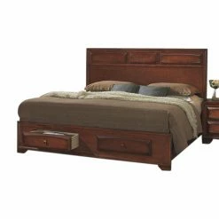 Beveled edges give the Roundhill Furniture Oakland Storage Platform Bed plenty of contemporary appeal. The solid wood platform bed shows off a rich oak finish that is antiqued for a timeworn look. For convenient storage, the footboard holds two sturdy dovetail drawers. Each one has a dustproof bottom and is lined with velvet to protect your clothing and accessories.