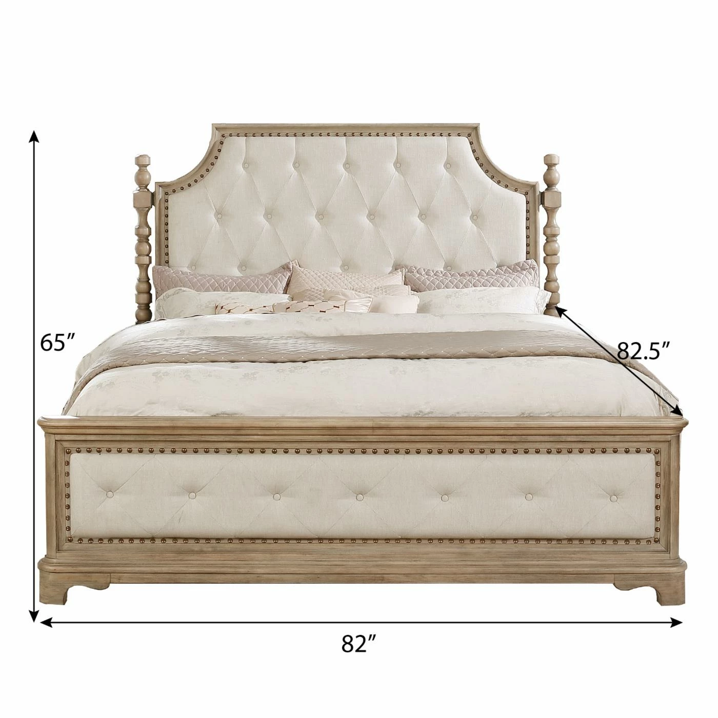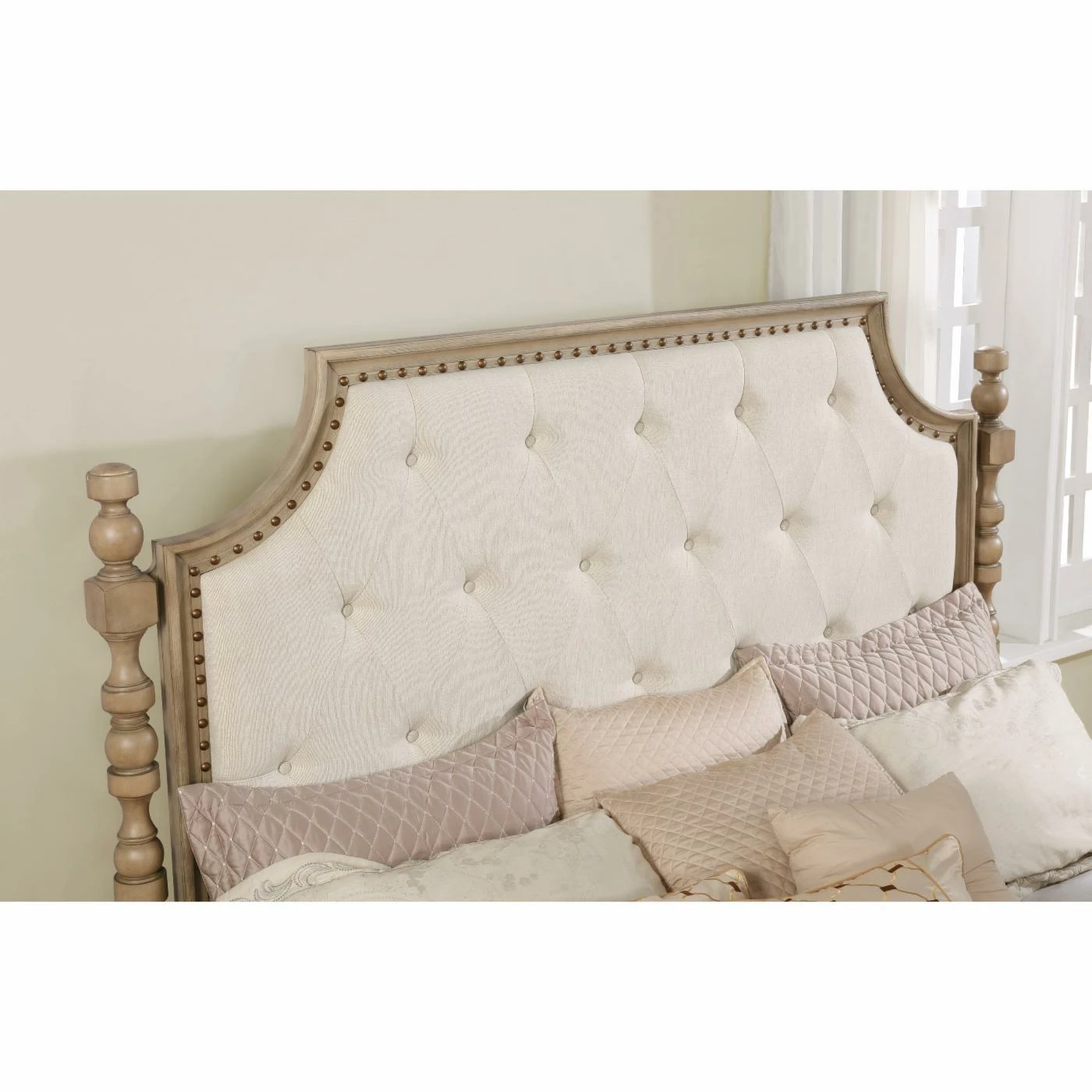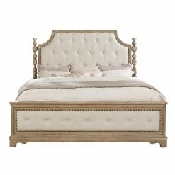 Beautify your bedroom with the Roundhill Furniture Piraeus Upholstered Low Profile Bed with Nailhead Trim. Both the headboard and footboard are upholstered with crisp fabric and button tufted for a finely tailored effect. Turned bed posts, crown molding, and antique nailhead trim add to the elegance of the piece. Whitewashed oak veneers cover the solid rubberwood bed, giving the bed a weathered look that is ideal for French country and shabby chic spaces.