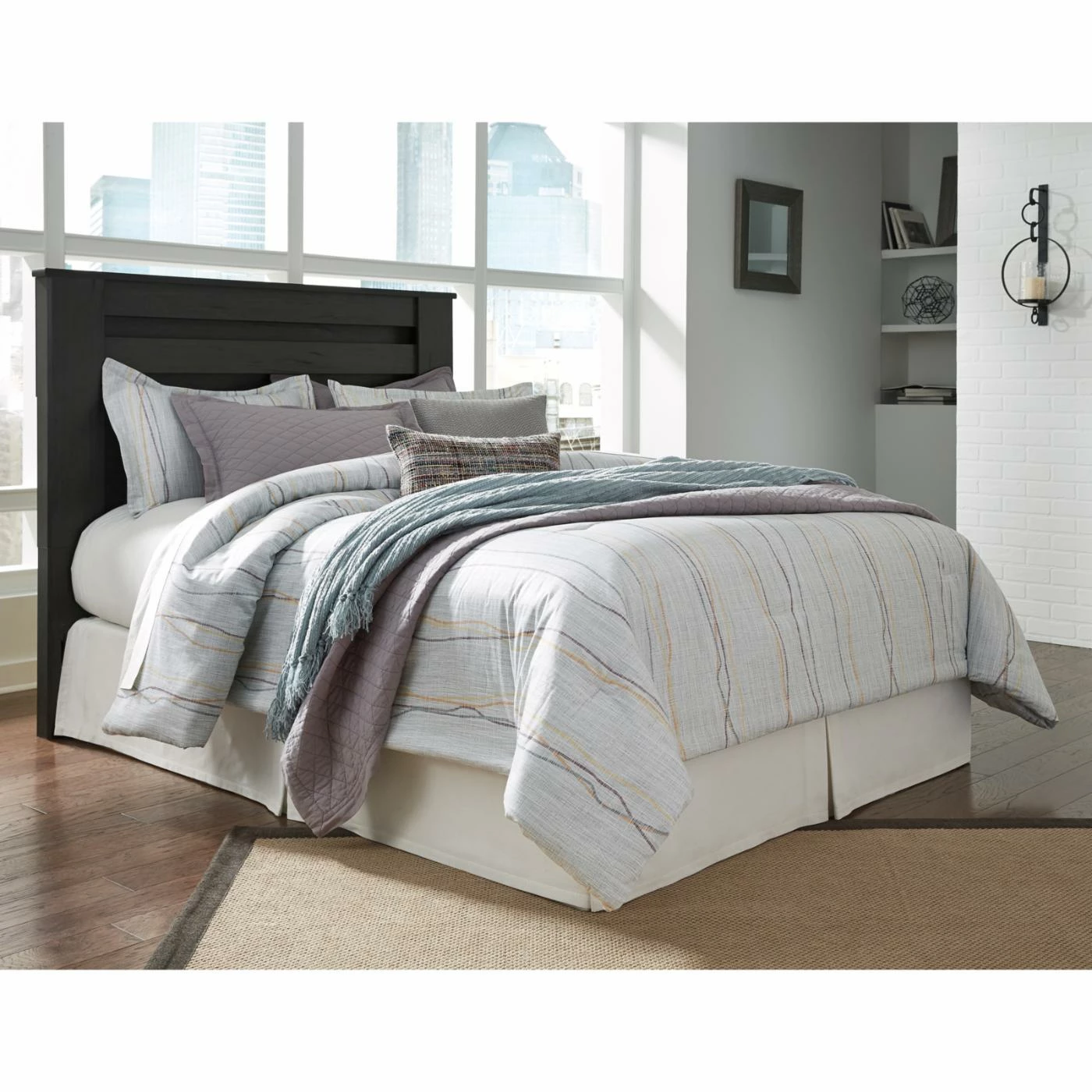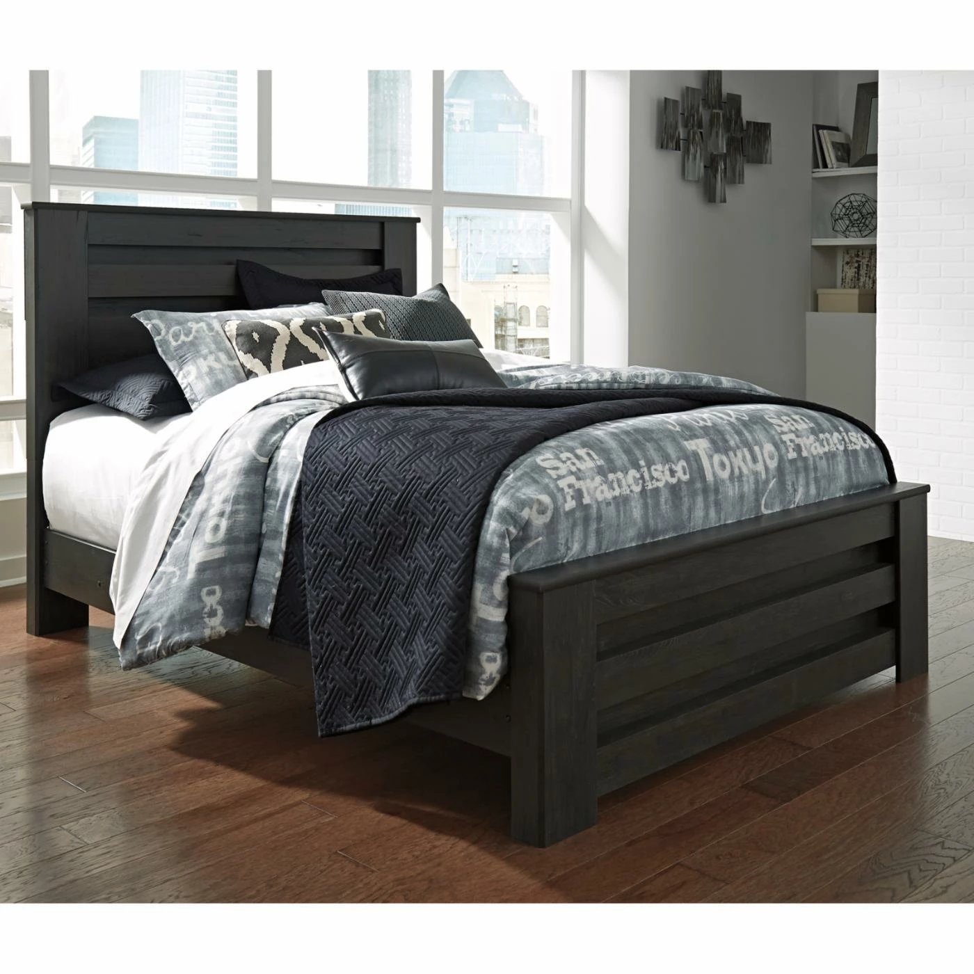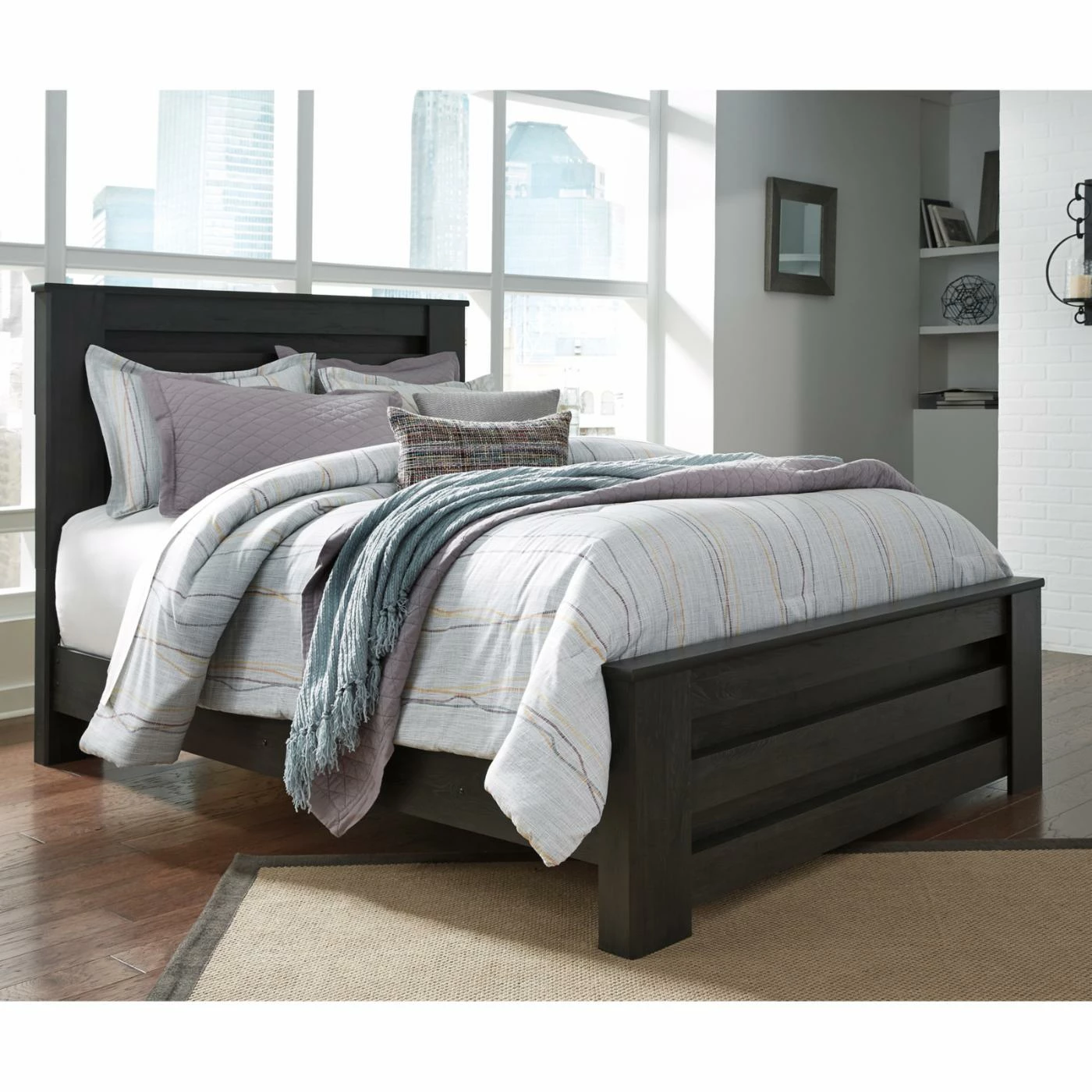 Contemporary style meets rustic charm in the Signature Design by Ashley Brinxton Poster Bed. The charcoal gray finish over replicated oak grain highlights the slat design and horizontal pocket details. Sturdy engineered oak construction provides lasting beauty for your bedroom. Assembly required.