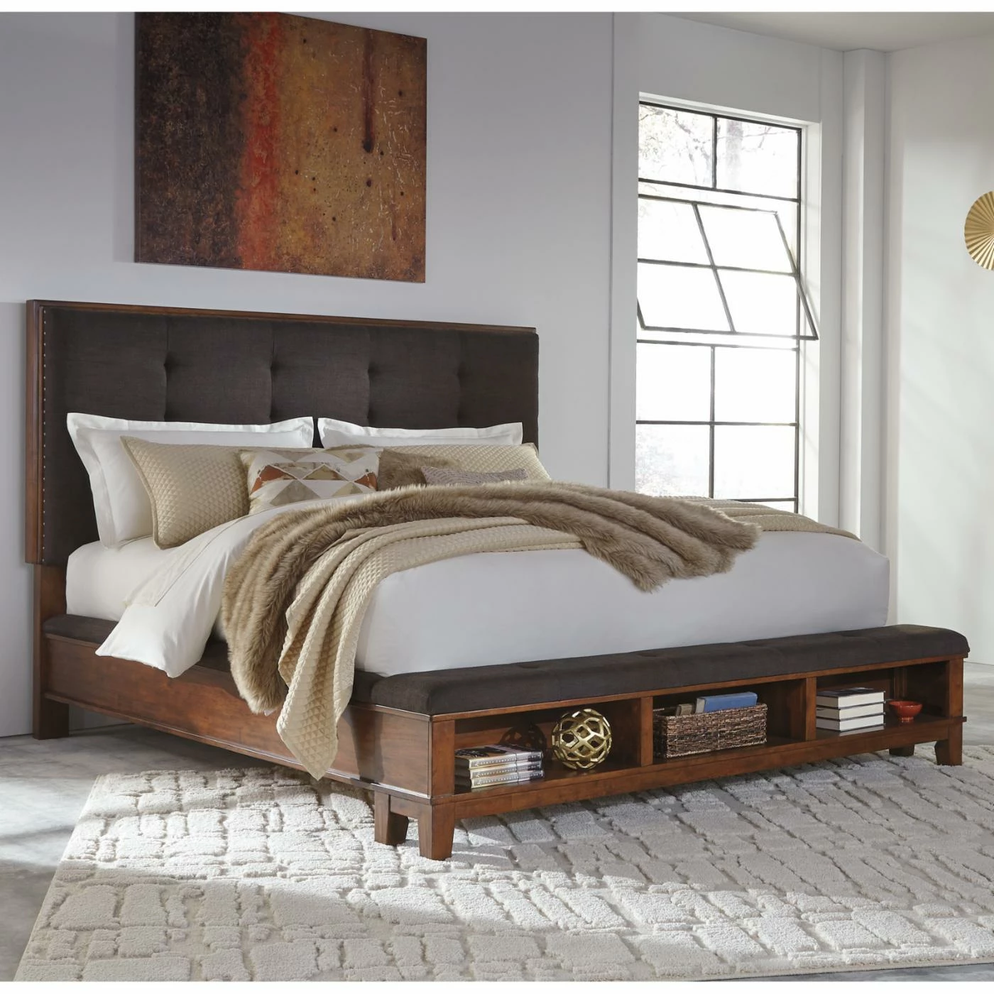Transform your bedroom with the rustic beauty of the Signature Design by Ashley Ralene Upholstered Storage Panel Bed. Crafted from acacia veneers and hardwood solids, this panel bed boasts a thick padded headboard and footboard that doubles as a bench. Three open cubbies in the footboard provide additional storage and display space. It’s finished in a burnished brown with light distressing.