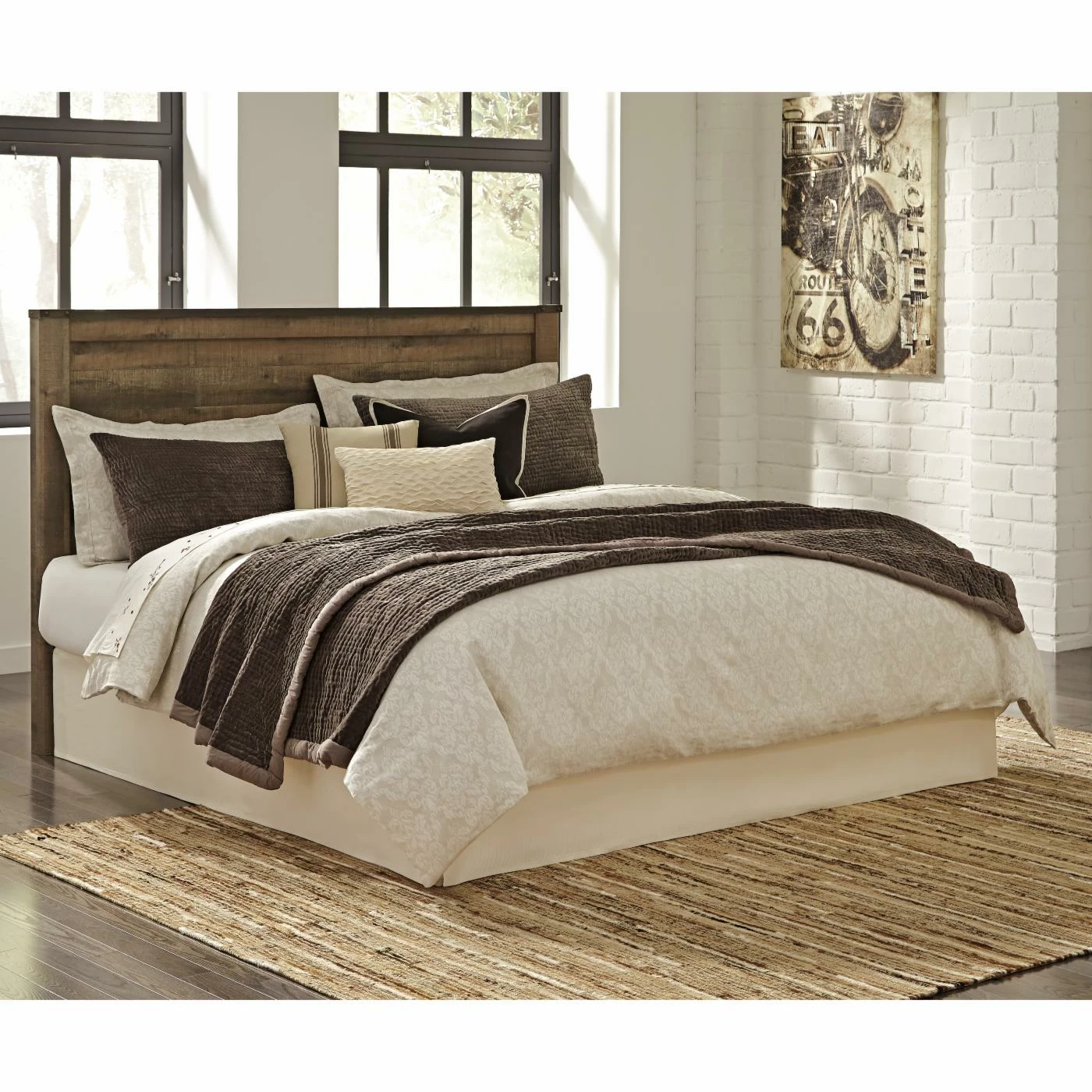 Saddle up, cowboys and cowgirls: the Signature Design by Ashley Trinell Panel Bed has the rustic country looks you’ve been searching for. The natural finish highlights the replicated wood grain and plank-style construction, creating the look of reclaimed barn wood. A sturdy traditional shape, distressed touches, and nail head trim complete the style. Assembly required.