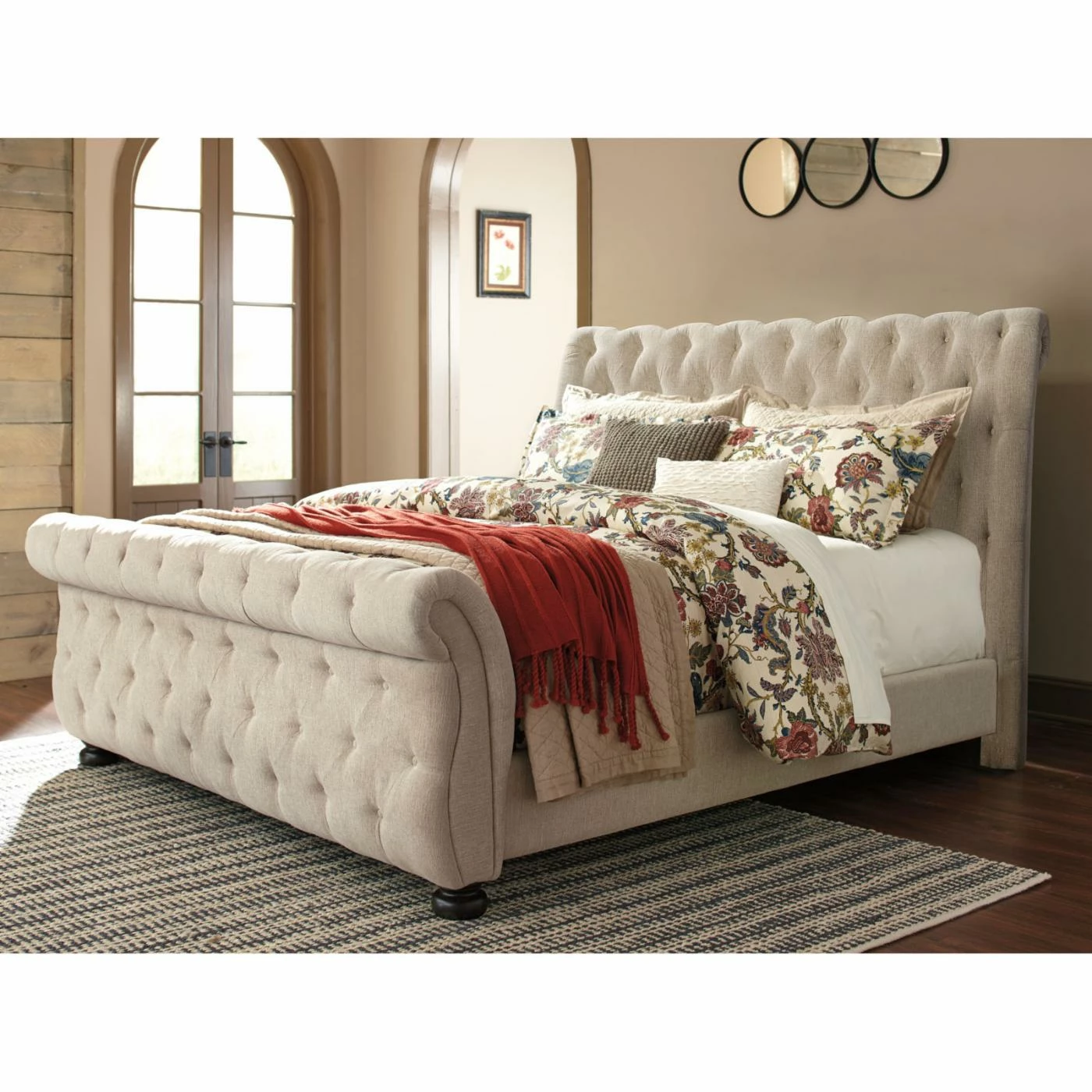 You’ll fall in love with the sophisticated Signature Design by Ashley Willenburg Upholstered Sleigh Bed. Boasting a classic sleigh bed design, this piece boasts a solid hardwood frame upholstered in textured white fabric. Button tufting accents the curved headboard and rolled footboard. Turned feet in dark coffee provide a sturdy foundation.