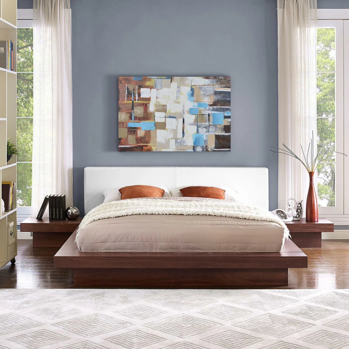 Ramp up the style of your setting with the Modway Freja Faux Leather Platform Bed with Nightstands β Queen. With its bold aesthetic, this platform style will pair well with multiple decorative schemes. Crafted from wood, this bed features a reinforced center beam that enhances both stability and support. This sleek bed eliminates the need for a box spring and opens up the room, while its upholstered headboard adds a soft touch to the design.