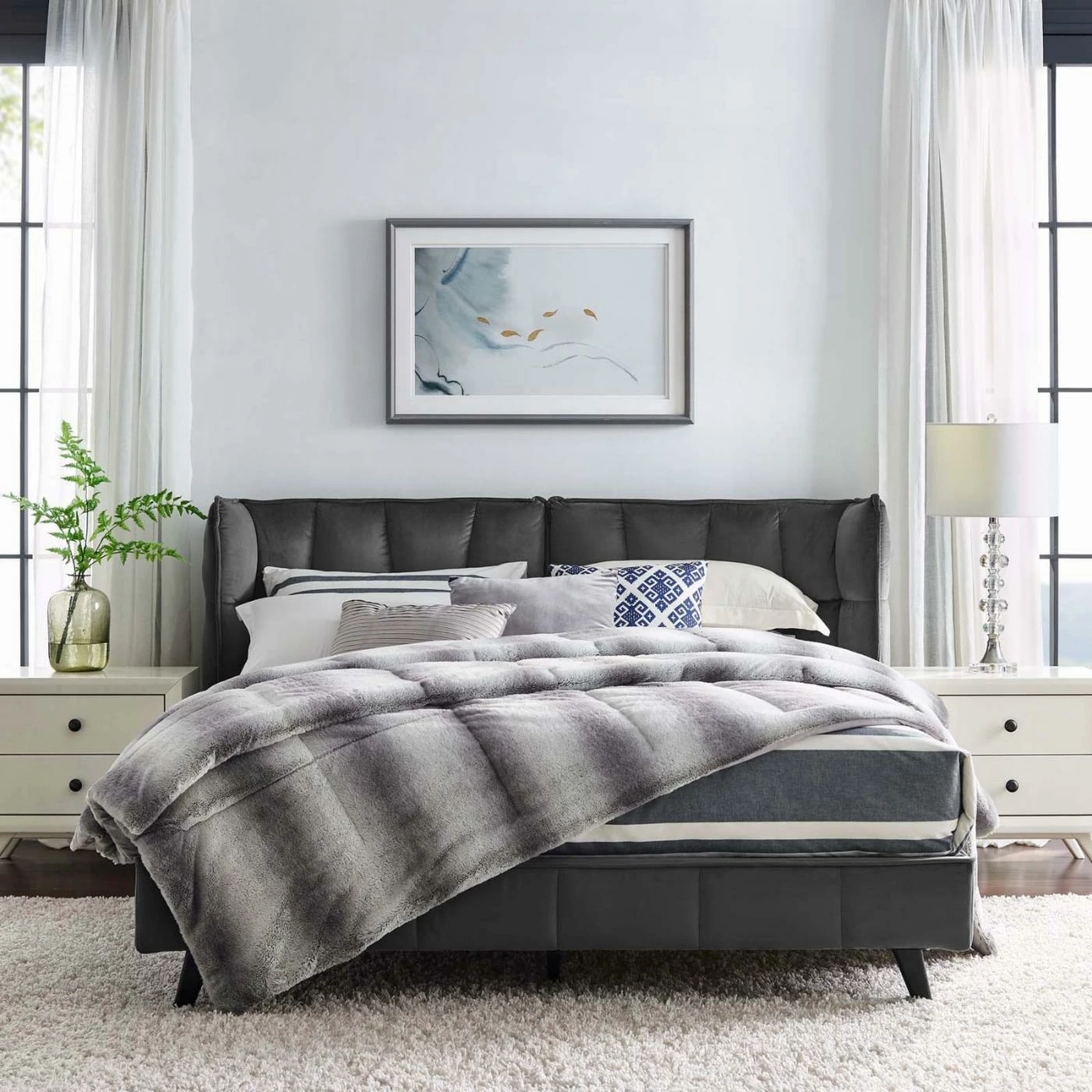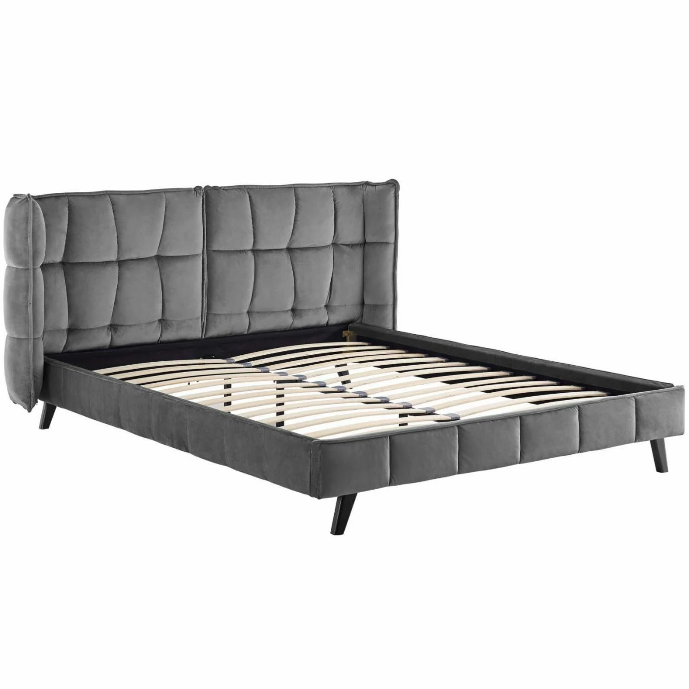 Accent your new bedroom with a modern, modular centerpiece in the Modway Makenna Upholstered Velvet Platform Bed – Queen. This bed frame is constructed from wood with splayed legs and a dark brown finish. Dense foam pads the frame upholstered in stain-resistant polyester velvet with welted seams and a square tufted design. The headboard sides can be adjusted to be spread flat or folded inward wingback-style. Select among the available color options.