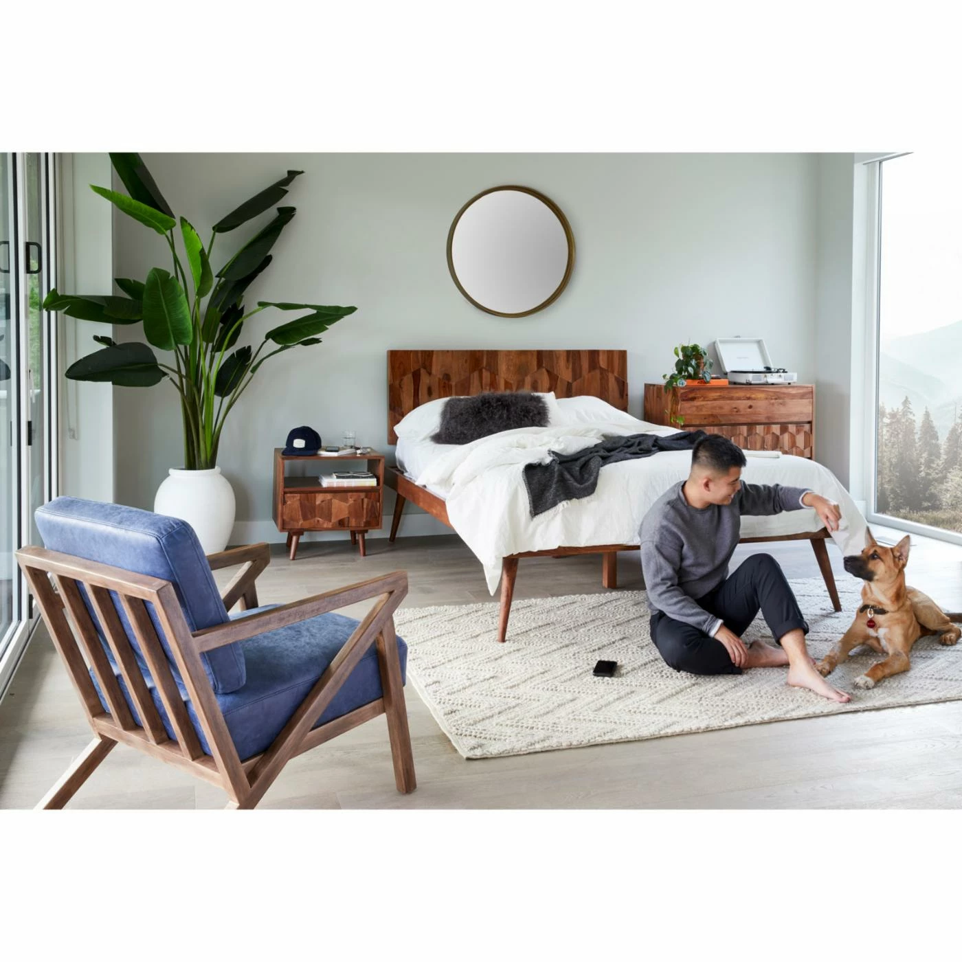 Combine the look of modern and retro with the Moe’s Home Collection O2 Platform Bed- Queen. This stunning piece features elements of mid-century design with sheesham wood, a pieced headboard, and gently tapered legs. A natural finish shows off the beauty of the wood grain.