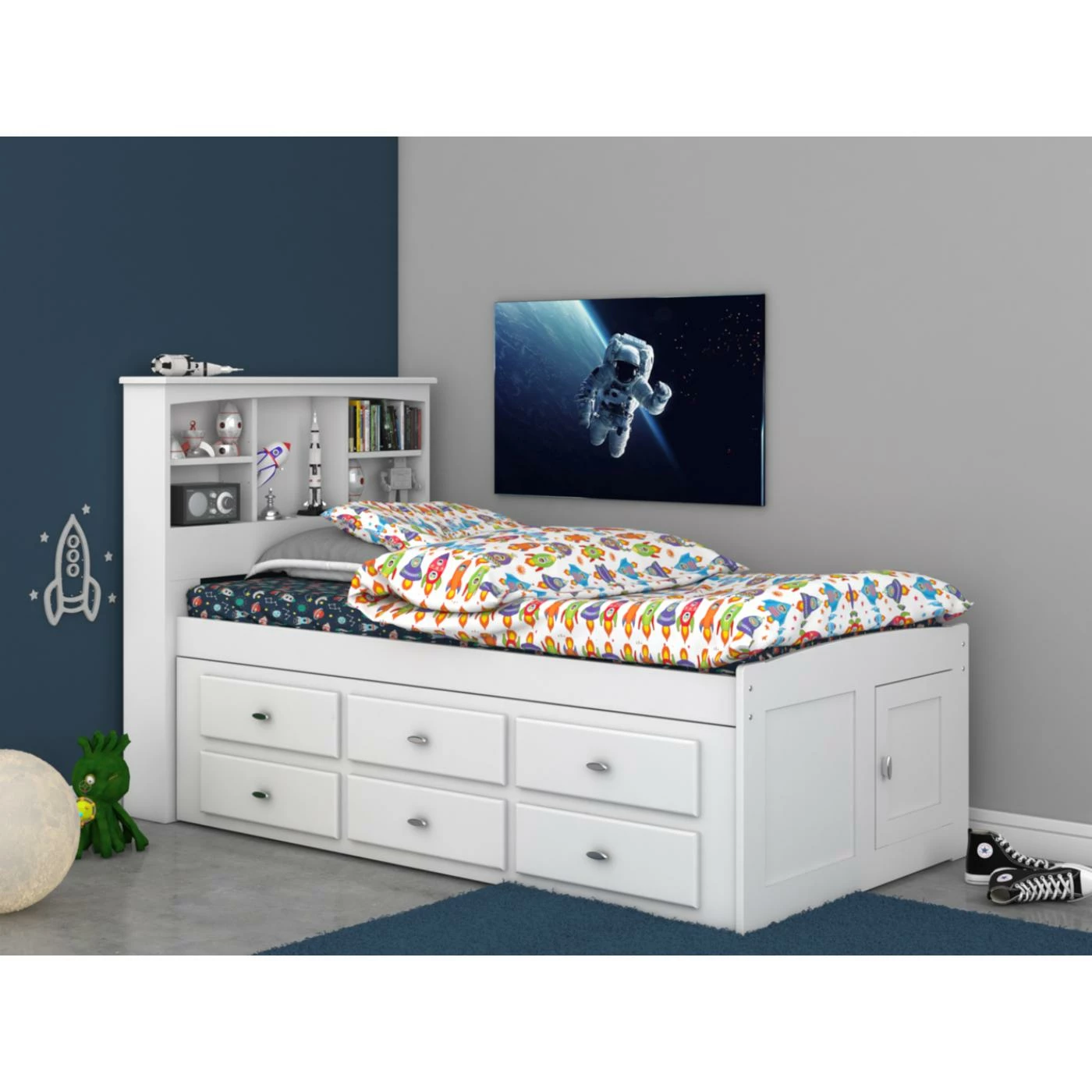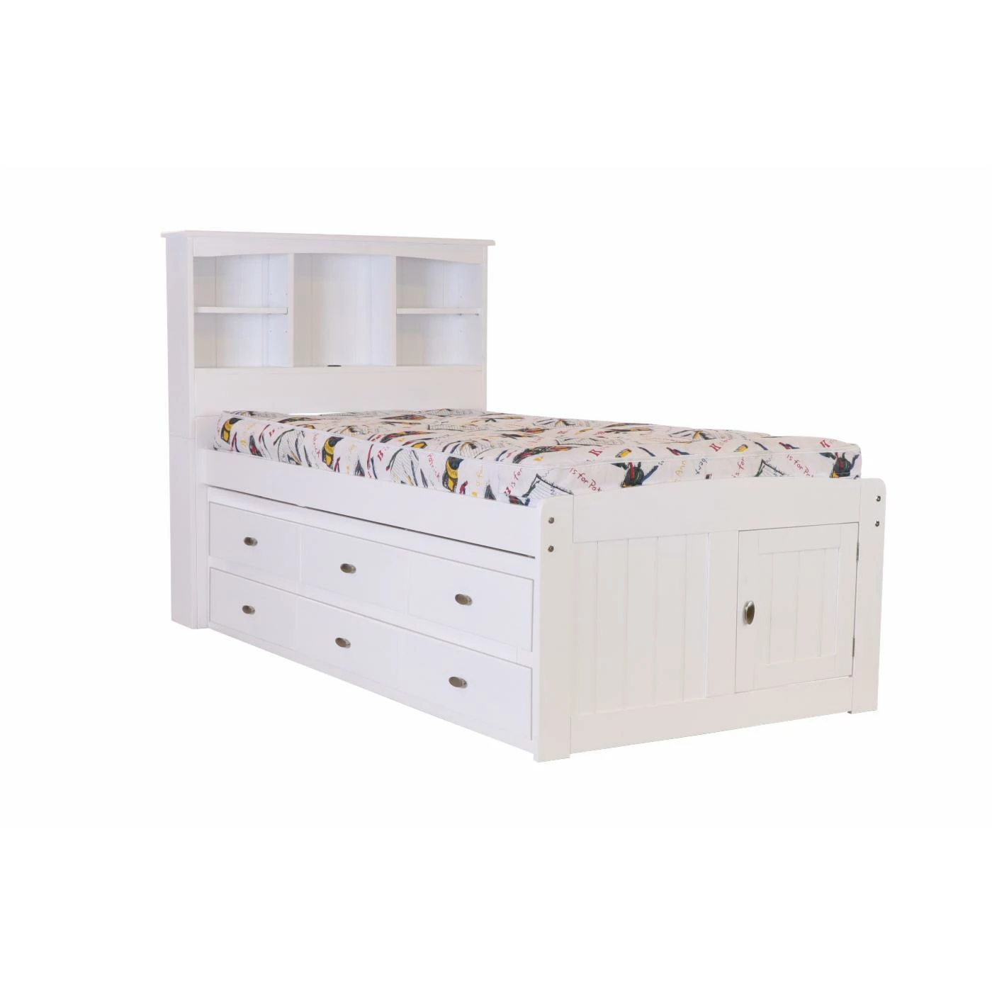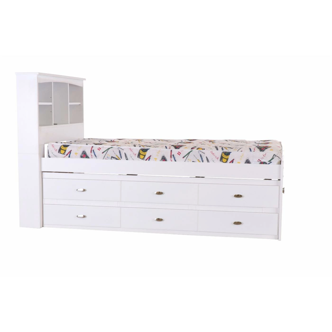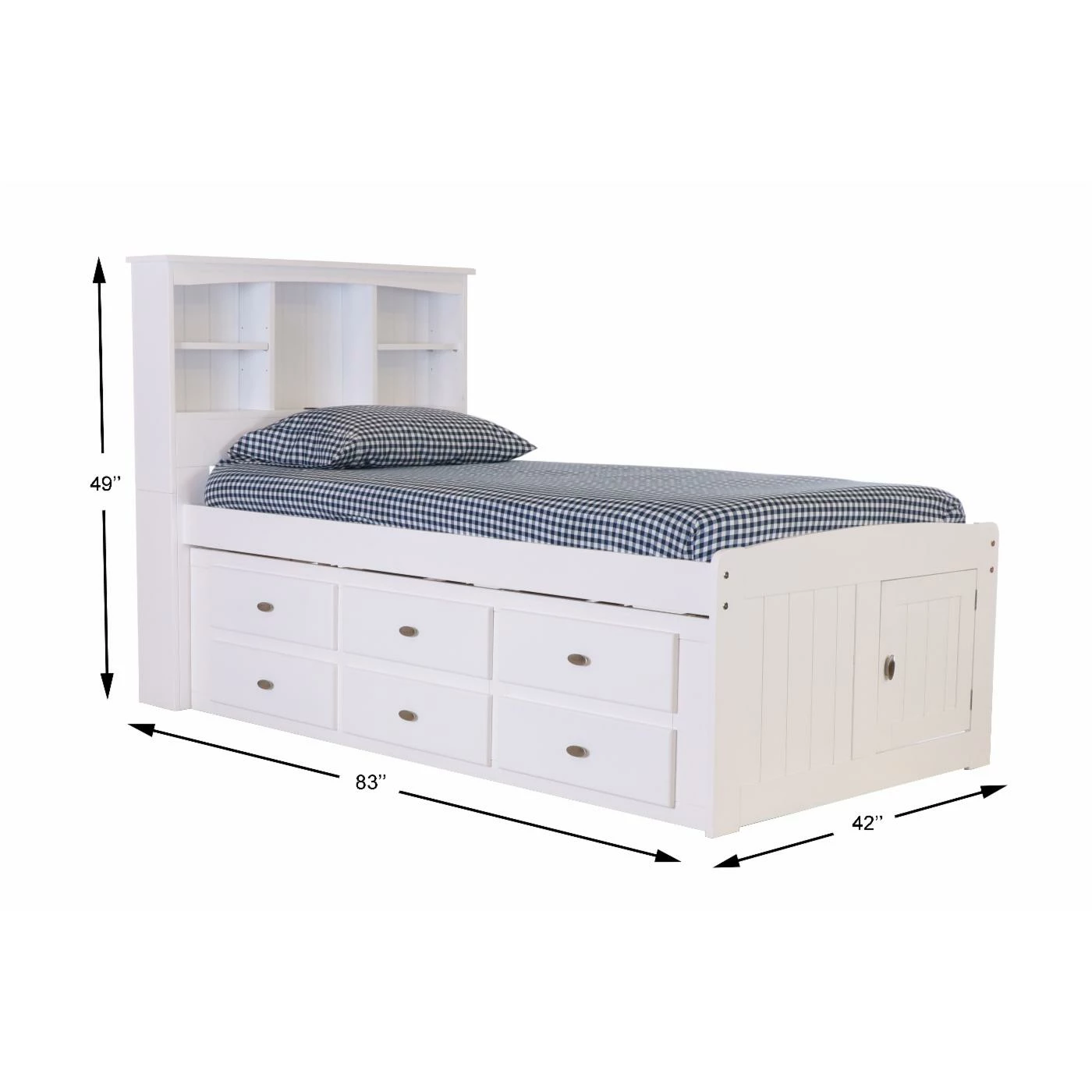 Add fashion and function to your child’s bedroom with this twin size captains bookcase bed in a casual white finish. The ready-to-assemble unit provides loads of storage with six sturdy drawers that can be placed on either side of the bed and underbed storage accessible from either end of the bed. The drawers feature metal drawer guides and attractive pulls. Quality and solid wood construction makes this captains bed a great purchase.