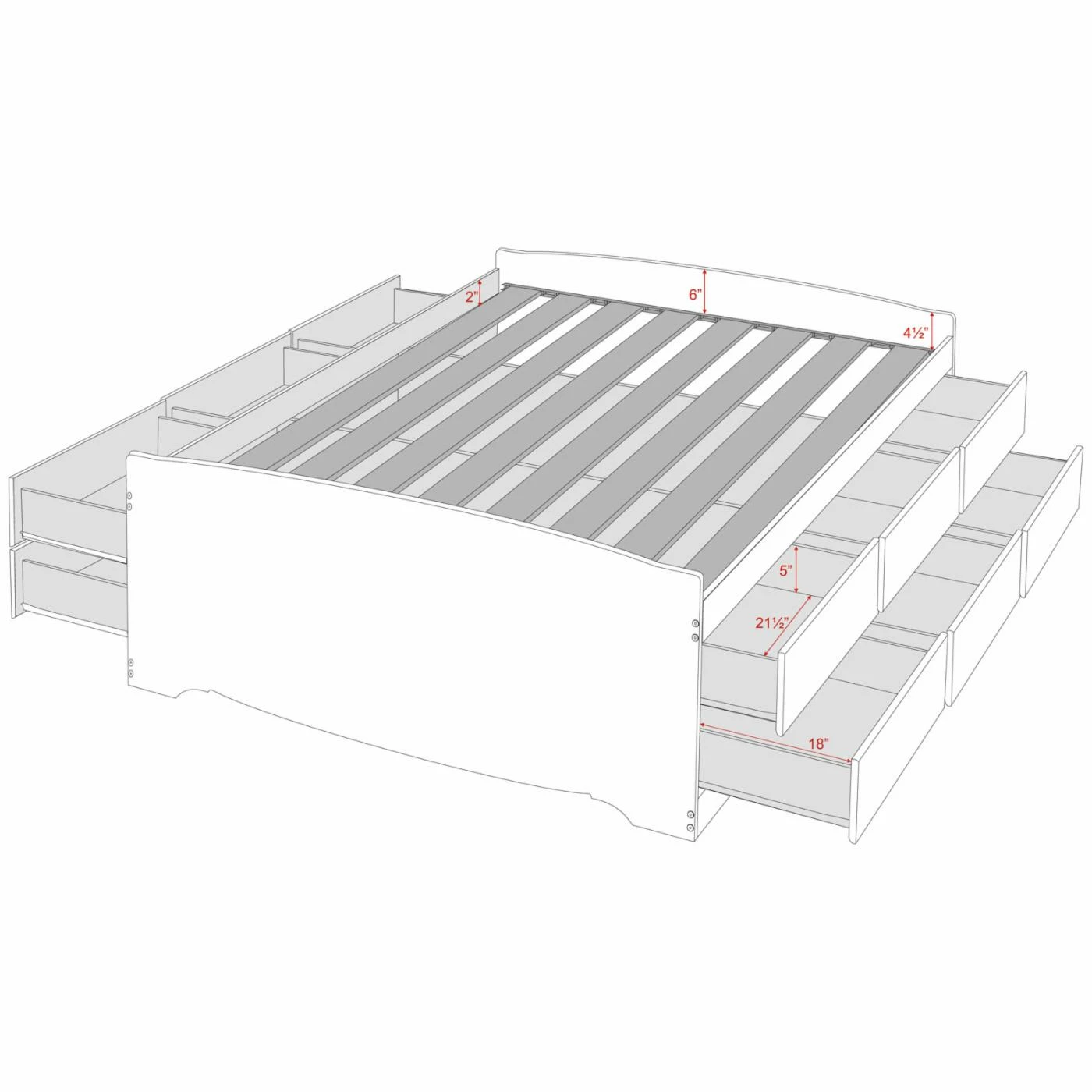 The Tall Storage Platform Bed with 12 Drawer Storage, combines the sleek profile of a platform bed with the space-saving advantage of under-bed storage. Wood slats positioned lengthwise distribute body weight evenly and minimize the amount of motion transfer. Beneath the slat support system, six spacious drawers for twin size and twelve spacious drawers for the full and queen size, provide a convenient place for clothing, linens, blankets, and more. Low-profile foot and head boards complete this bed with subdued contemporary style.