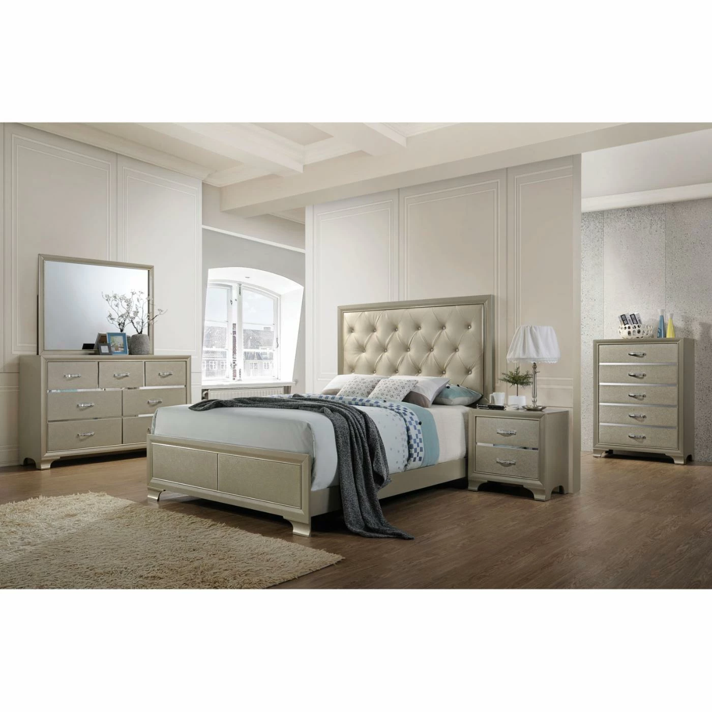 Replete with glamour and classic style, the Acme Furniture Carine Queen Bed is a luxurious addition to any master or guest bedroom. Its headboard features faux leather upholstery with diamond button tufting, while the low profile footboard offers a touch of shimmer on its champagne finish. Crafted from rubberwood and engineered wood for strength and durability, this bed is crafted to last.