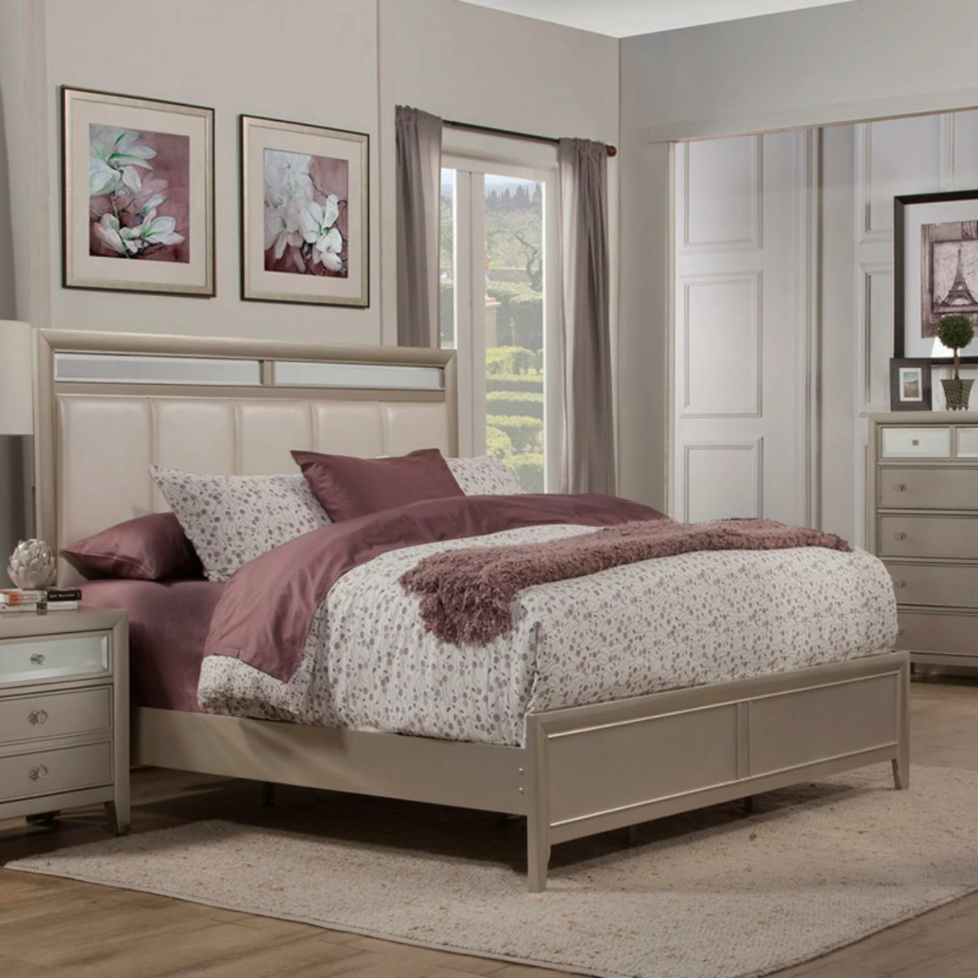 Love falling asleep every night with the Alpine Furniture Silver Dreams Upholstered Panel Bed. This subtly glam piece features a stunning silver finish and a headboard with tufted cream faux leather upholstery and mirror accents. Available in your choice of size, this bed includes slats and requires a box spring (not included). Pair with other pieces in the Silver Dreams Collection.