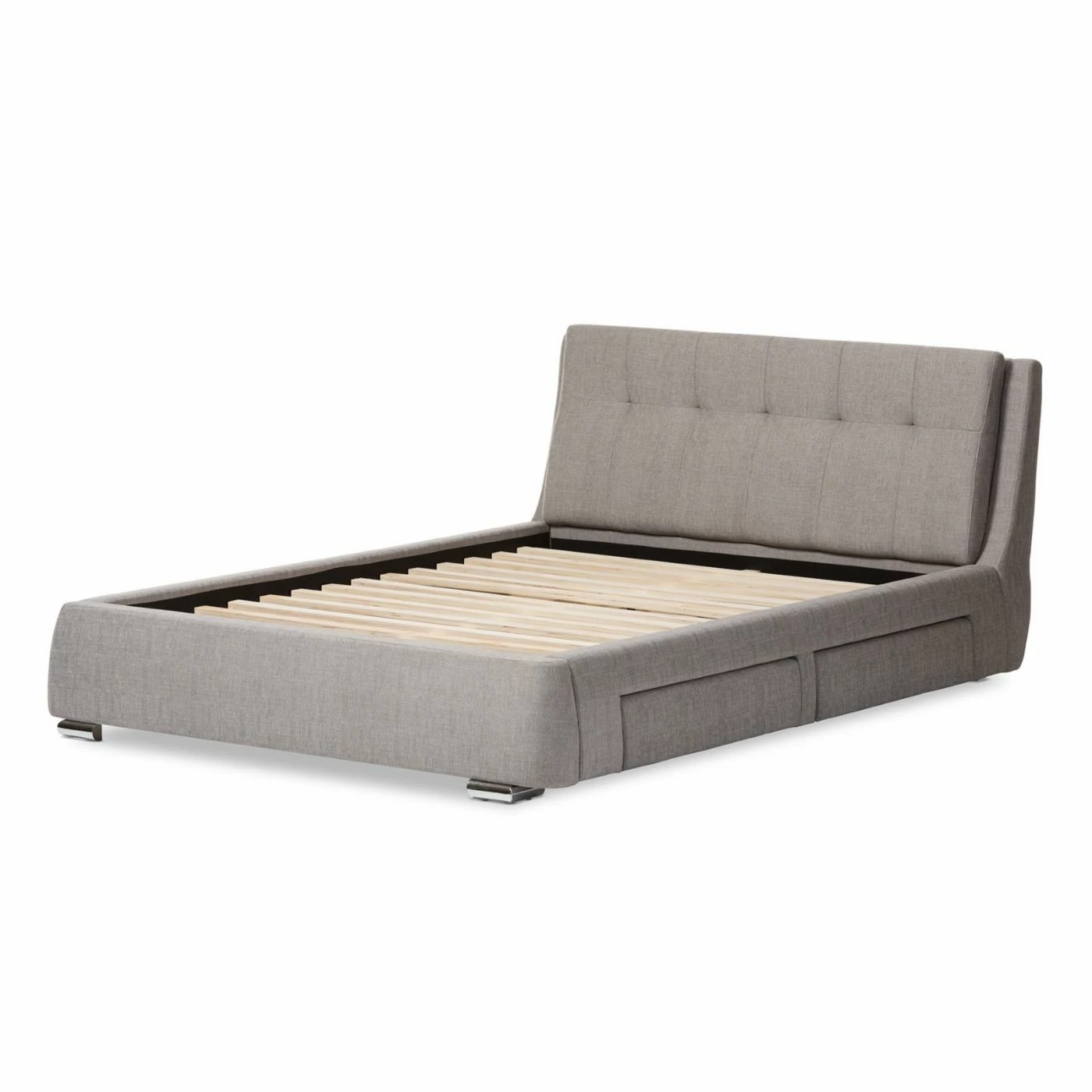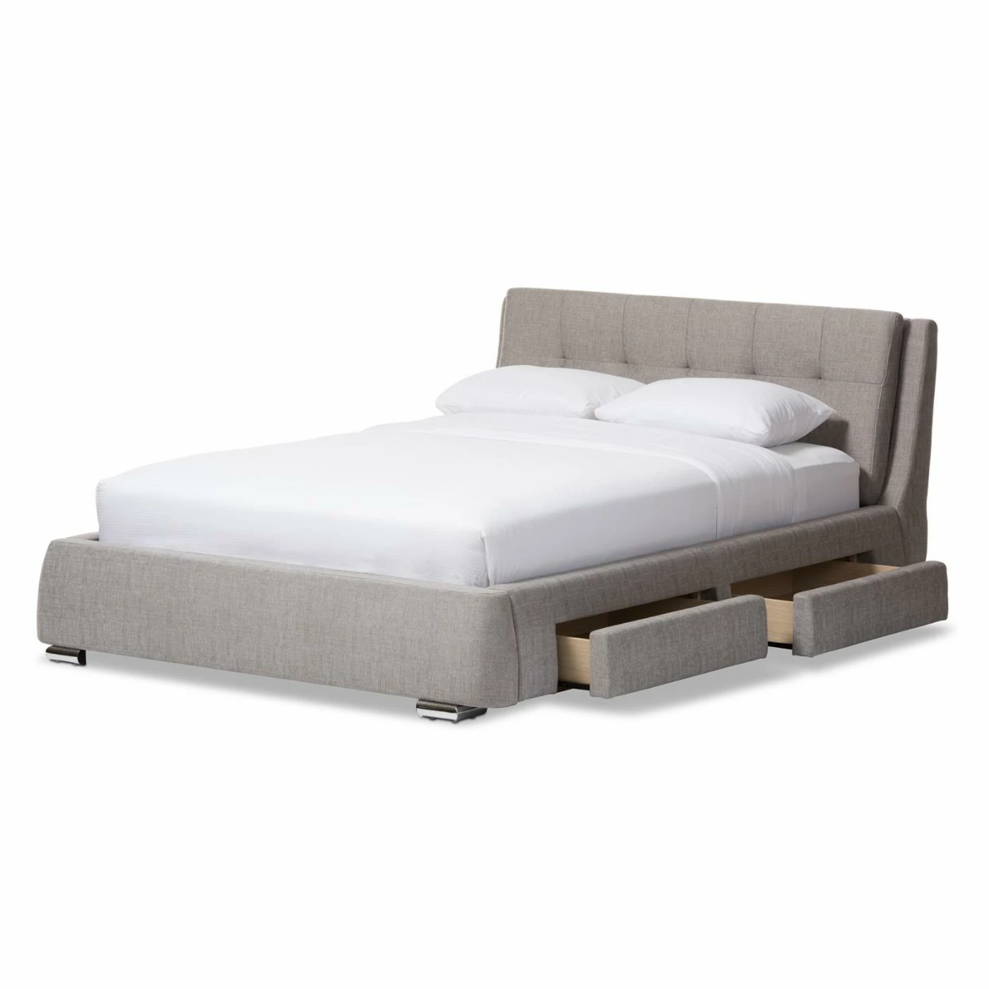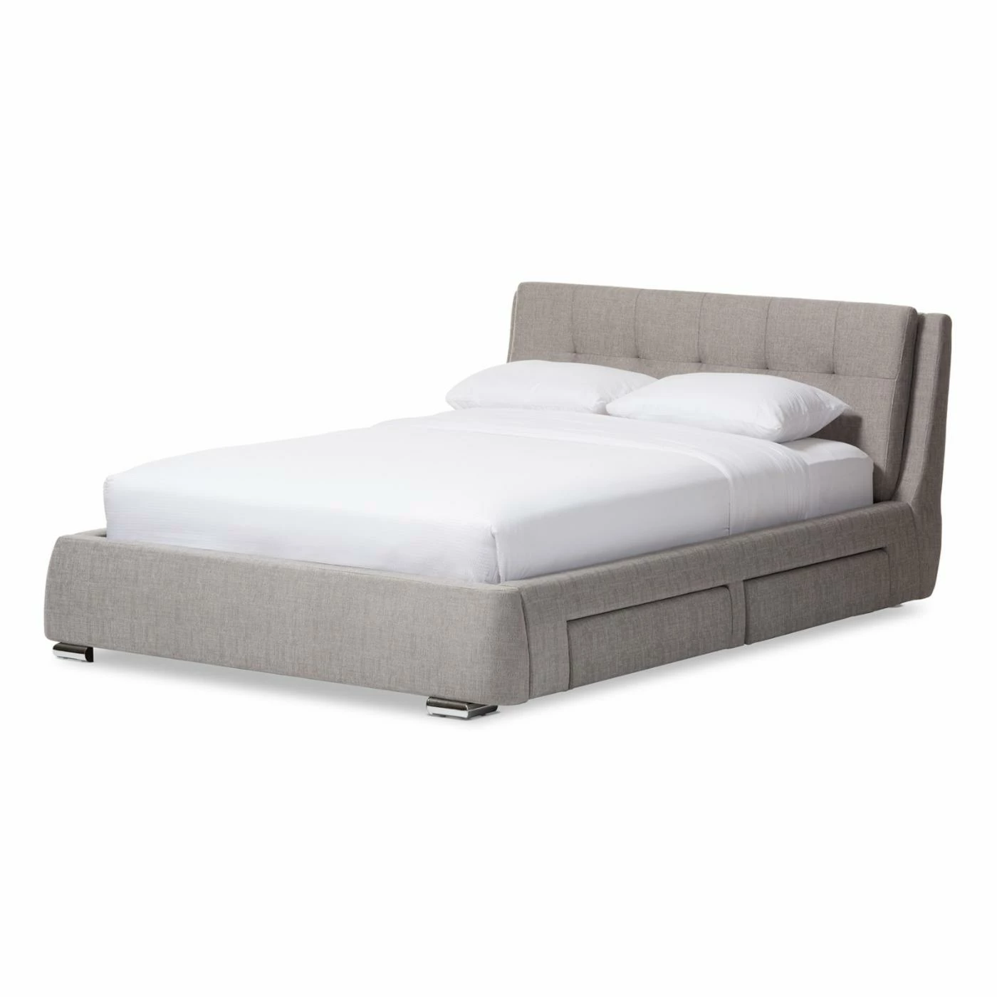 Combine style, comfort, and function with the Baxton Studio Camile Upholstered Storage Platform Bed. An eye-catching headboard, upholstered with extra-padded, grey textured fabric in a grid-tuft design, headlines this luxurious piece. 4 storage drawers provide the perfect amount of space for a variety of home goods. Sprung wooden slats accommodate most queen and king mattresses, while uniquely chromed feet complete this platform piece with elegant style. Requires assembly.