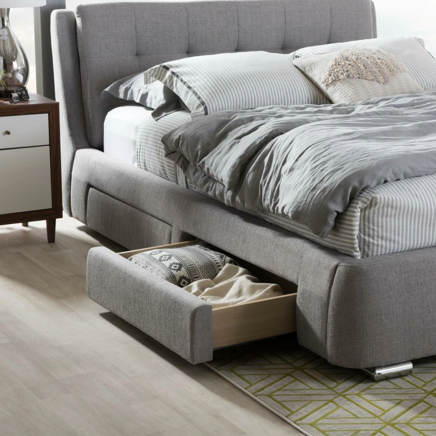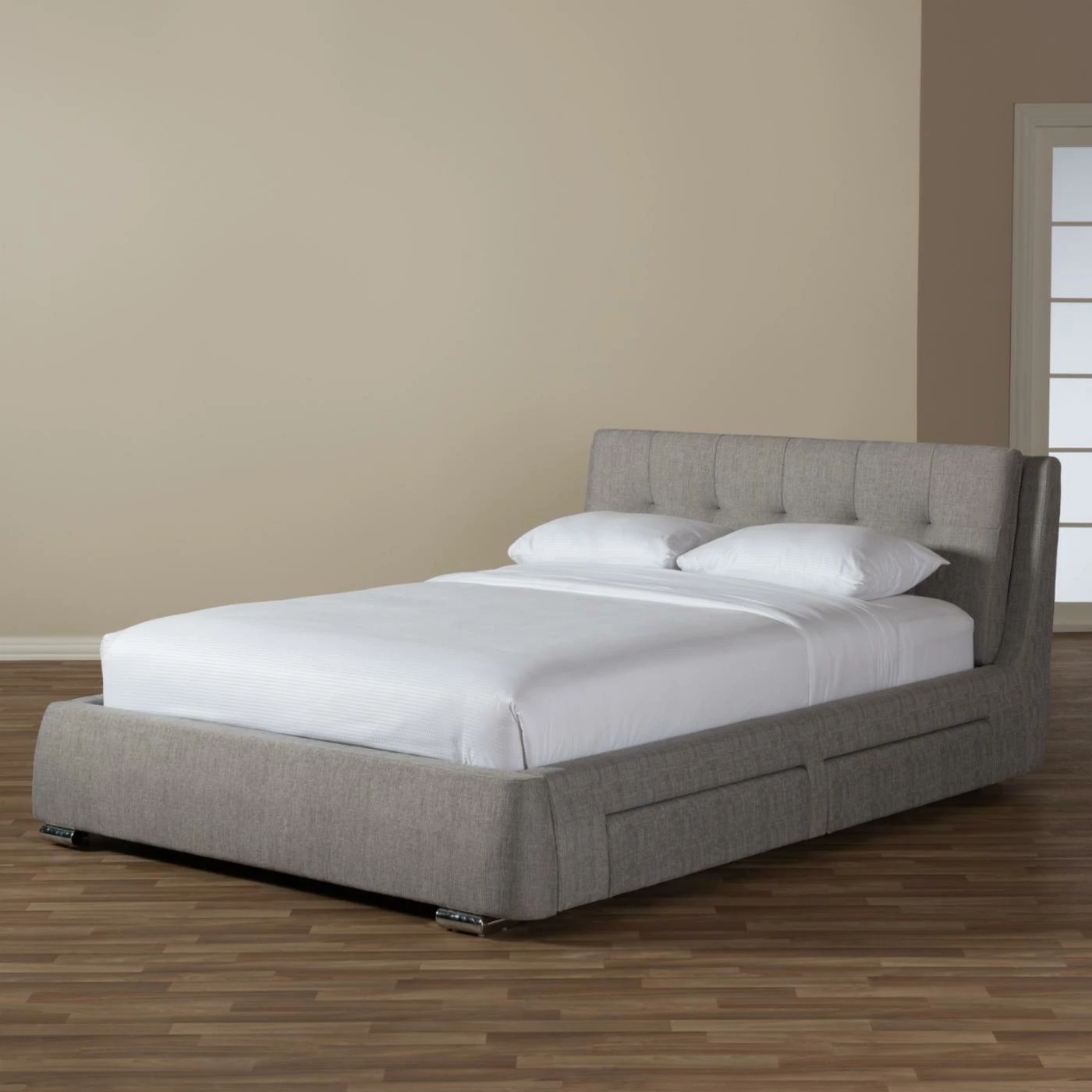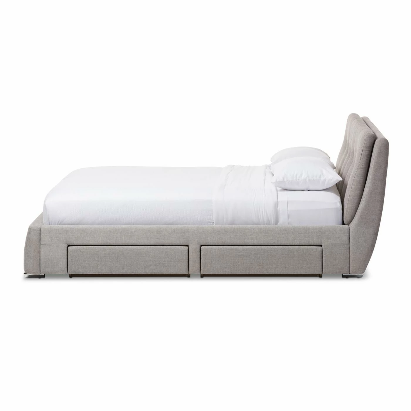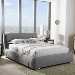 Combine style, comfort, and function with the Baxton Studio Camile Upholstered Storage Platform Bed. An eye-catching headboard, upholstered with extra-padded, grey textured fabric in a grid-tuft design, headlines this luxurious piece. 4 storage drawers provide the perfect amount of space for a variety of home goods. Sprung wooden slats accommodate most queen and king mattresses, while uniquely chromed feet complete this platform piece with elegant style. Requires assembly.