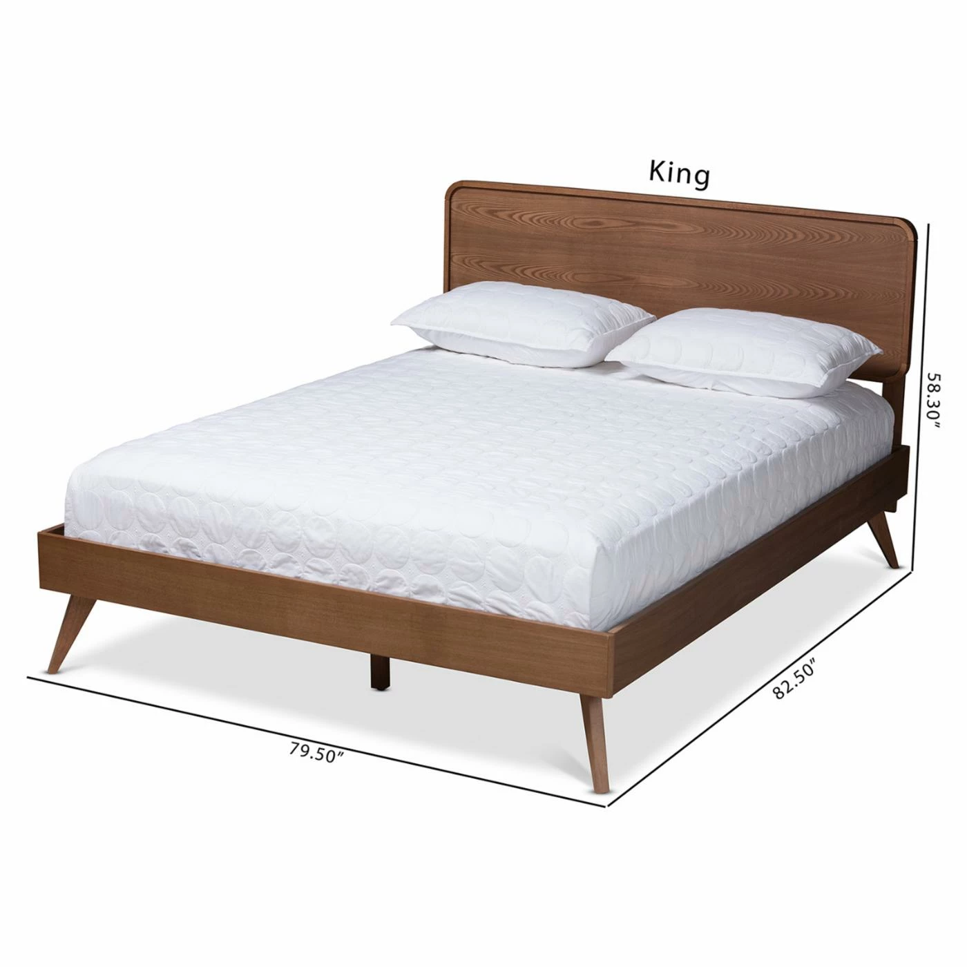 Settle in for the night atop the Baxton Studio Demeter Wood Platform Bed. This retro-inspired piece is made from sturdy rubberwood and engineered wood, from the flat headboard to the characteristically tapered legs. The rounded edges of the rectangular headboard ooze mid-century modern appeal in a walnut finish, which was extremely popular during the vintage time period that this bed frame evokes. The sturdy slats make it so you don’t have to purchase a box spring – just put your mattress directly on top. Some assembly required.