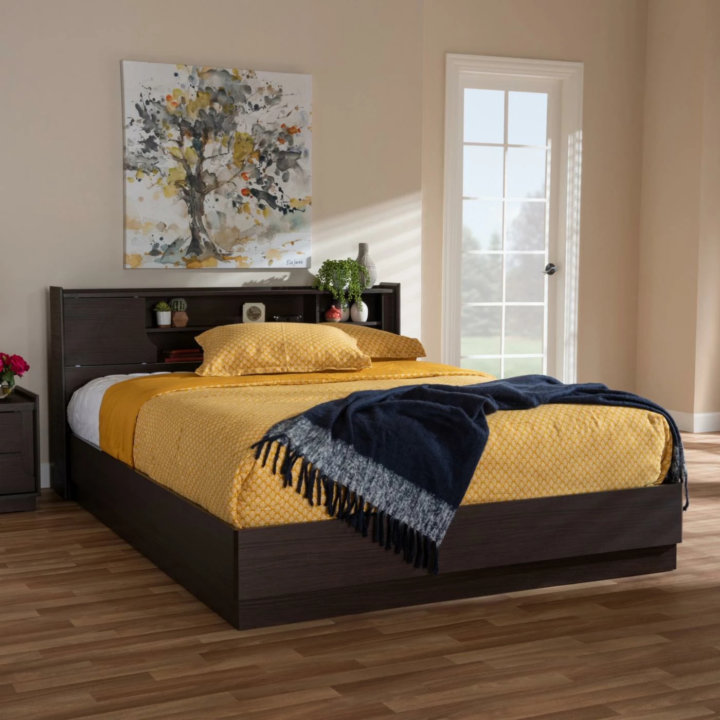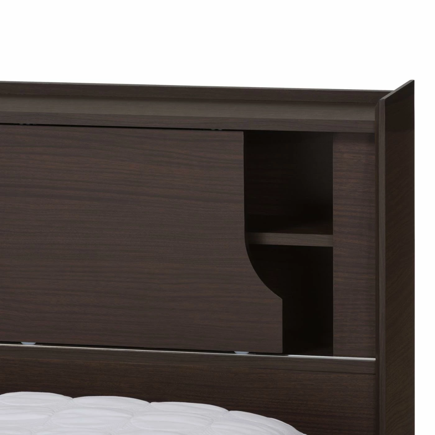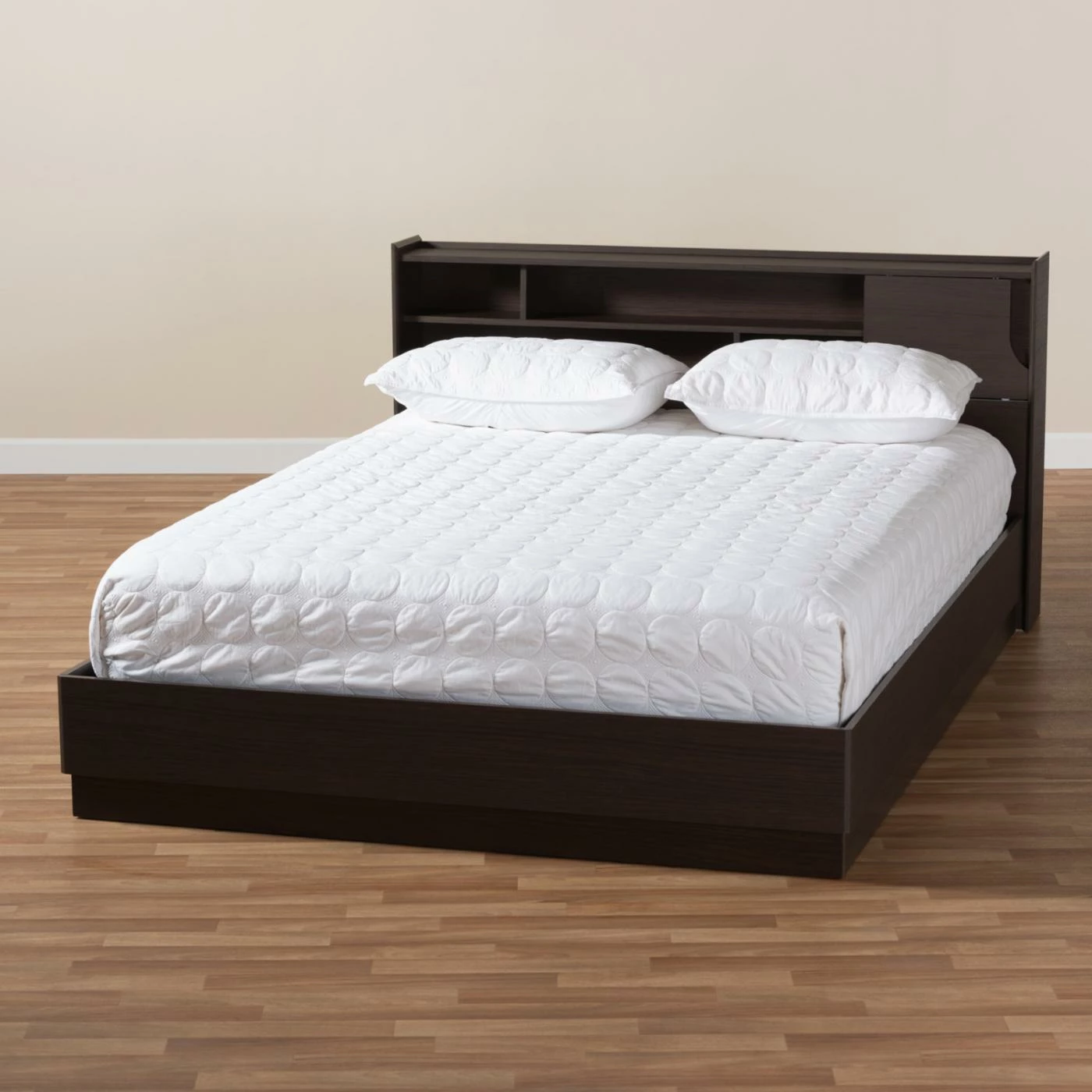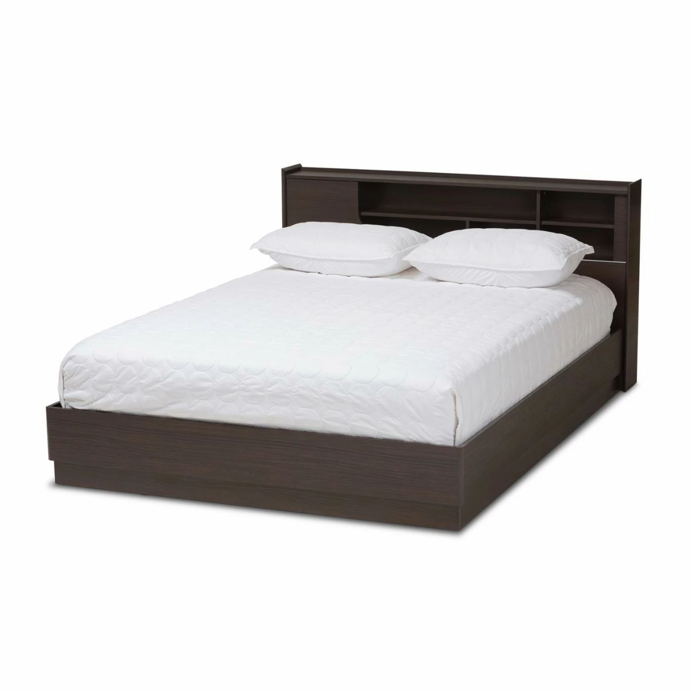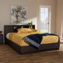 The Baxton Studio Larsine Modern and Contemporary Platform Storage Bed boasts a sleek design and impressive storage. The engineered wood craftsmanship features five shelves built into the headboard. The cut-out design on the side of the headboard panel slides across the entire headboard, giving you the option of keeping some of the shelves closed. This platform bed is finished in a deep brown hue with woodgrain detail for an authentic look.