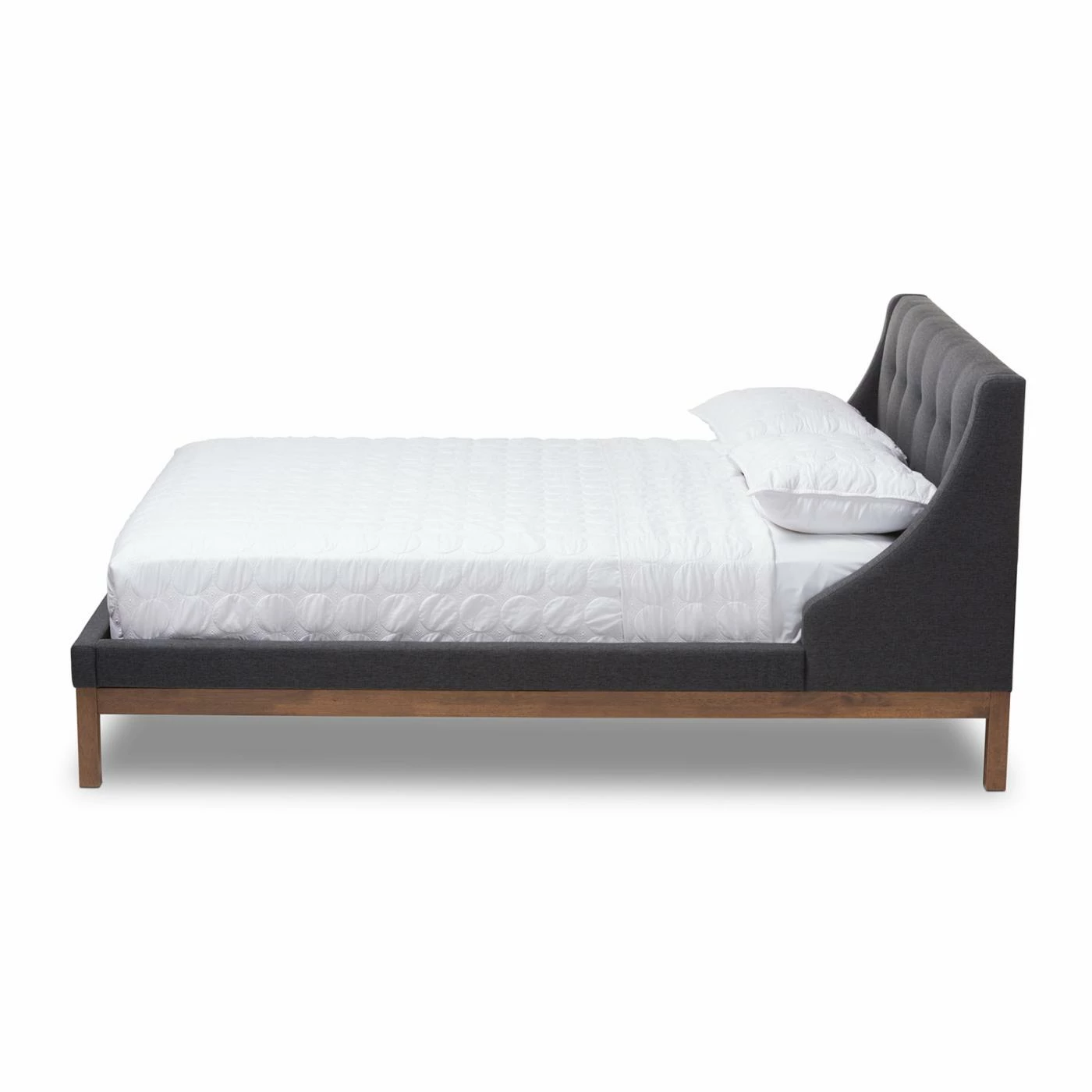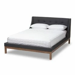 The Baxton Studio Louvain Upholstered Platform Bed brings comfort and sophistication to your bedroom. This platform bed boasts sturdy rubberwood craftsmanship as well as smooth fabric upholstery. The headboard is foam padded and button tufted for a tailored look. Choose from available size and color options.