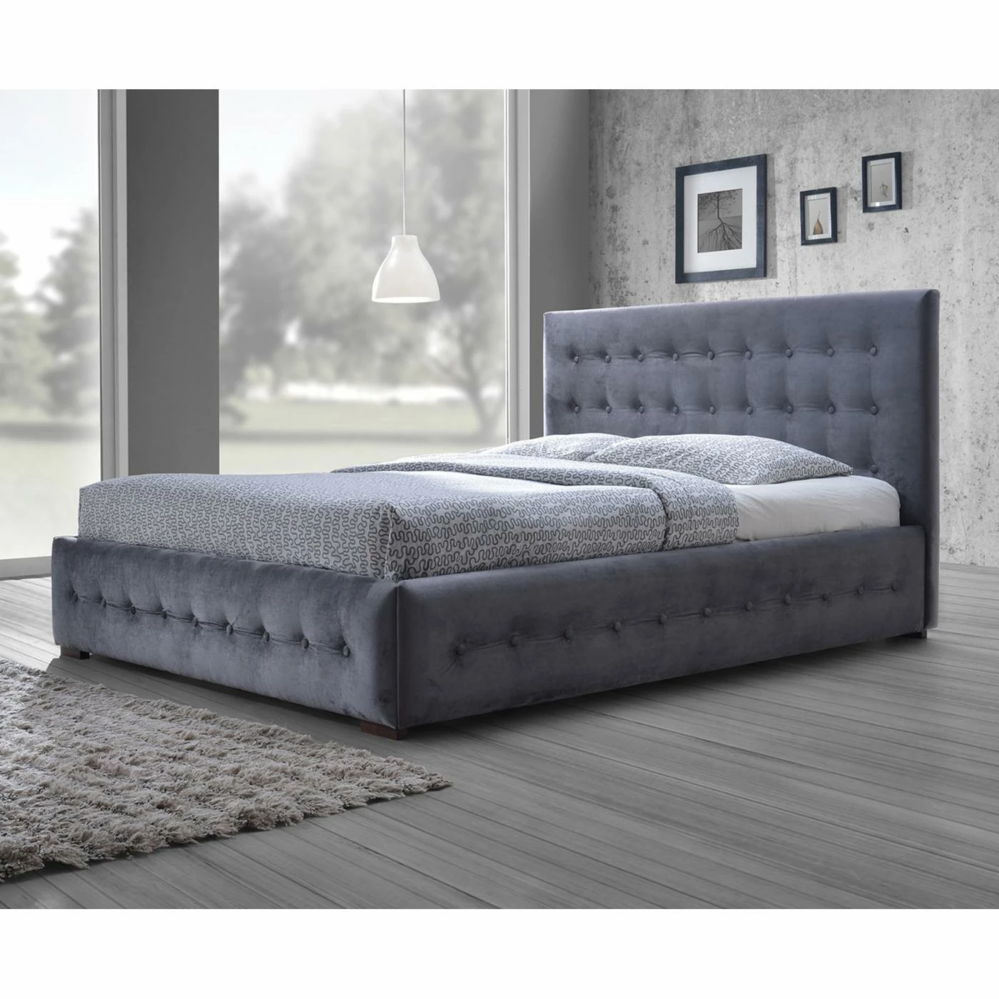 - Button tufting on headboard, rails, and footboard